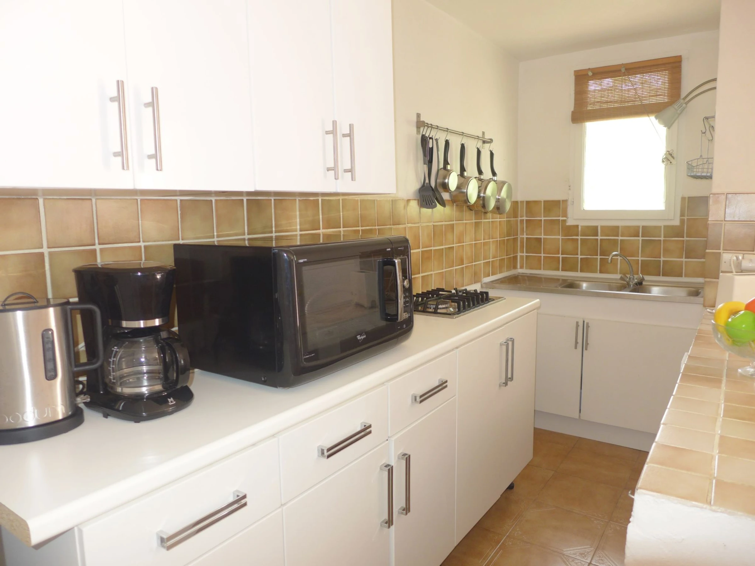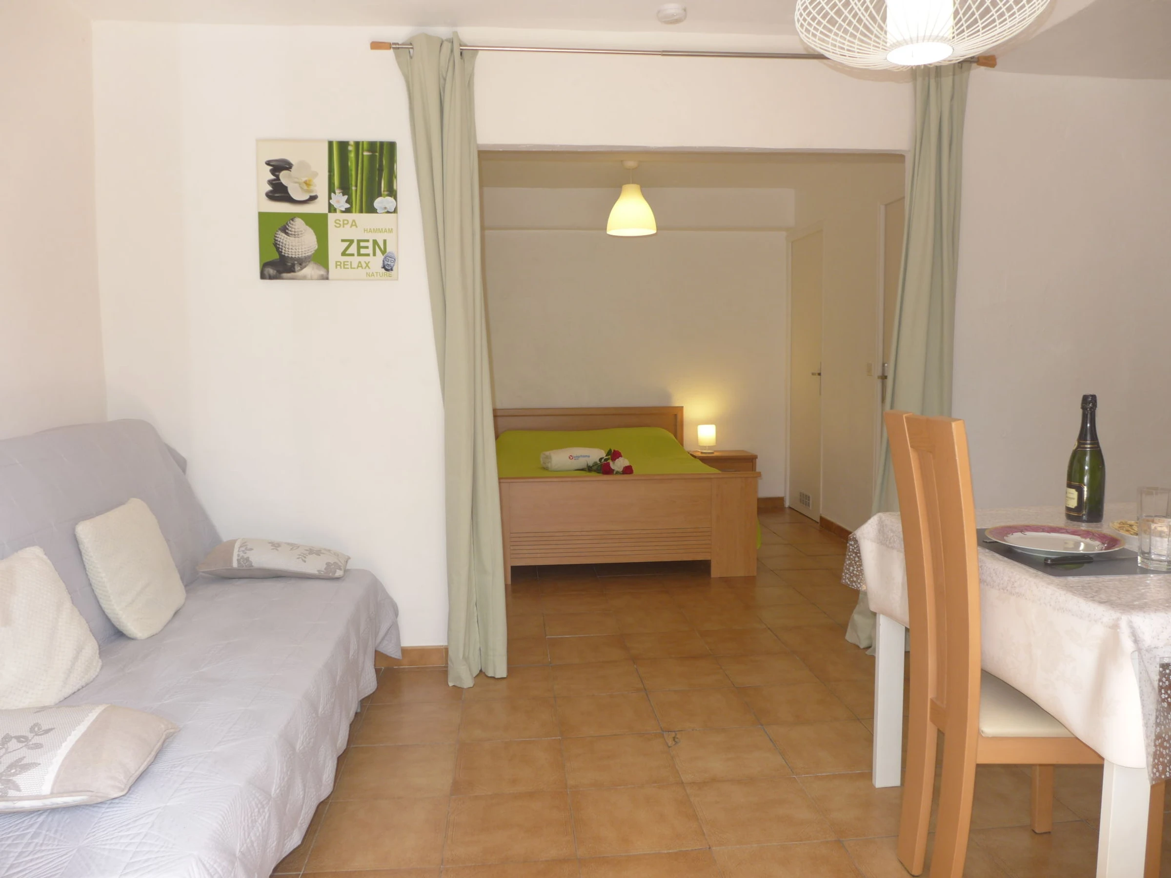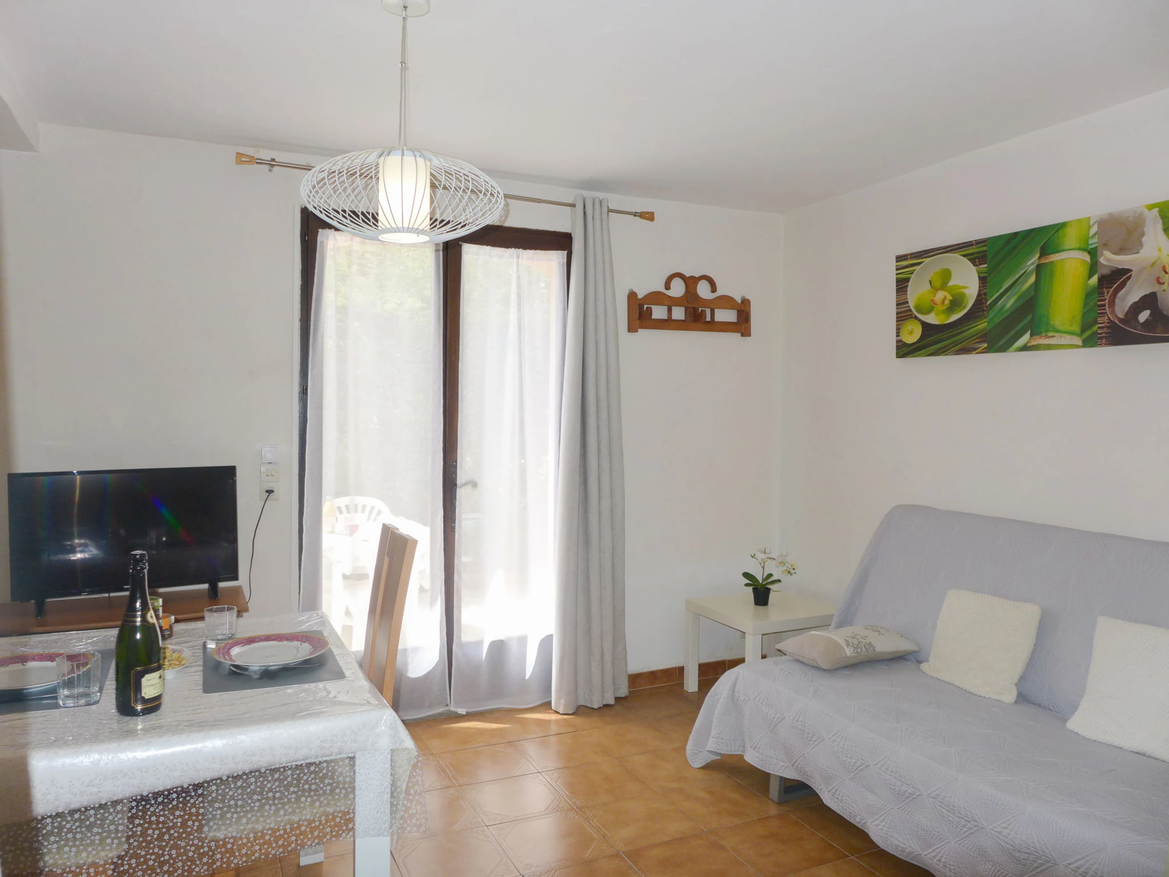 1-room apartment 35 m2, on the ground floor, south facing position. Beautiful furnishings: living/dining room with TV. Exit to the terrace. 1 open room with curtain, without window with 1 french bed (1 x 140 cm, length 190 cm), fan. Open kitchen (2 gas rings, toaster, freezer, electric coffee machine, combination microwave). Shower, sep. WC. Electric heating. Terrace 16 m2, patio. Terrace furniture. Facilities: iron, hair dryer. Internet (WiFi, extra). Parking. Please note: maximum 1 pet/ dog allowed. TV only FR. Smoke alarm. The owner occupies the 1st floor of the house. [hidden]