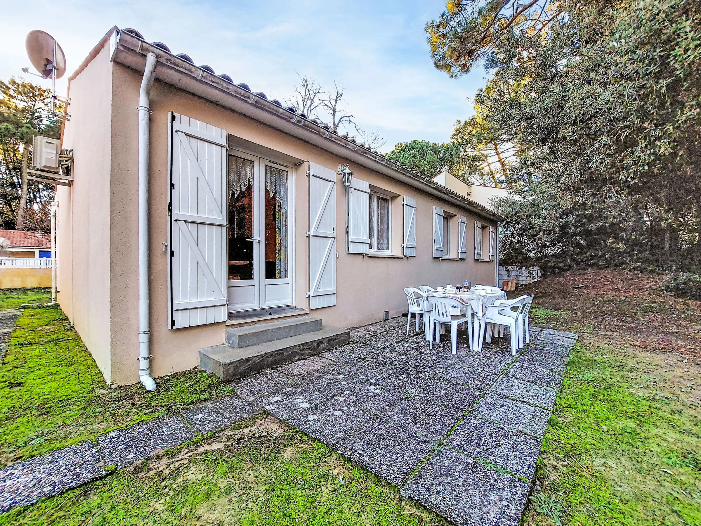 La Palmyre: Single-family house "Les Alouettes". In the resort 1 km from the centre of La Palmyre, in a quiet position in the residential district, 1.7 km from the sea, 1.7 km from the beach, south-west facing position. Private: natural state property 570 m2 (fenced), trees, parking. Shop 1 km, grocery 1 km, supermarket 1 km, bakery 1 km, café 1 km, bus stop "Office de tourisme" 1 km, railway station "Royan" 18 km, sandy beach "La Palmyre" 1.7 km. Sports harbour 1.7 km, golf course (9 hole) 900 m, surf school 1 km, tennis 150 m, riding stable 1.7 km. Nearby attractions: Zoo de La Palmyre 1.1 km, Hippodrome - La Palmyre 700 m, Zagal Cabaret - La Palmyre 1.9 km, Luna Park (Juillet - Août) 5 km, Port La Tremblade - Boyard / Ile d'Aix 12 km, Golf La Palmyre 2 km. The keys‘ handover takes place by the agency in La Palmyre, 1 km.