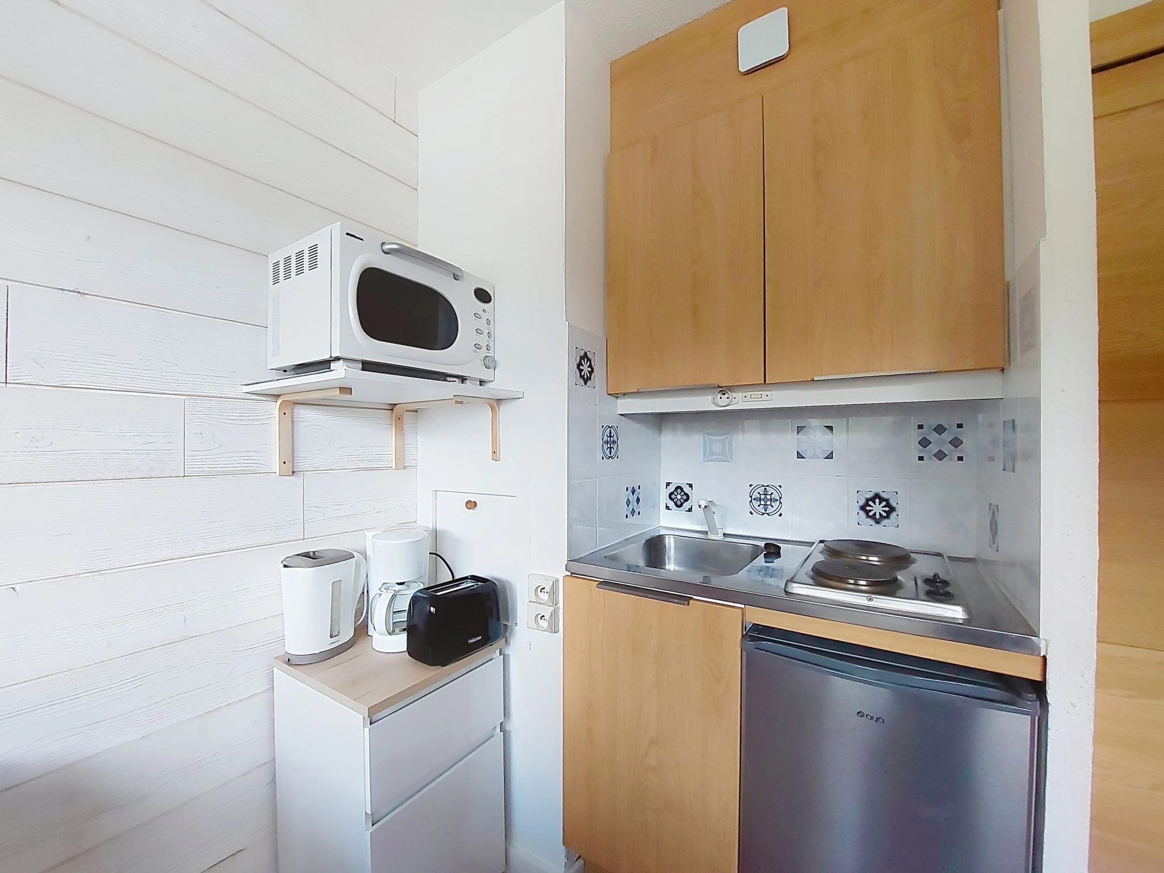 "Brelin Les Combes 844", 1-room studio 15 m2 on 8th floor, north facing position. Beautiful furnishings: living/dining room with 1 double sofabed (140 cm, length 190 cm) (length 190 cm), TV (flat screen). Kitchenette (2 hot plates, mini-oven, microwave). Shower/WC. Heating. Facilities: Internet (WiFi, extra). Please note: maximum 1 small pet/ dog allowed. Smoke alarm. [hidden]