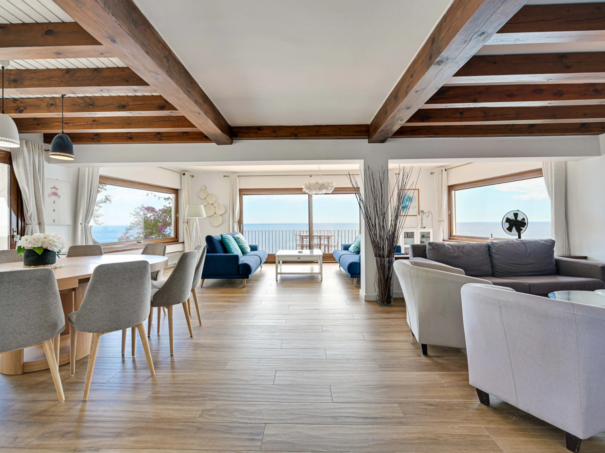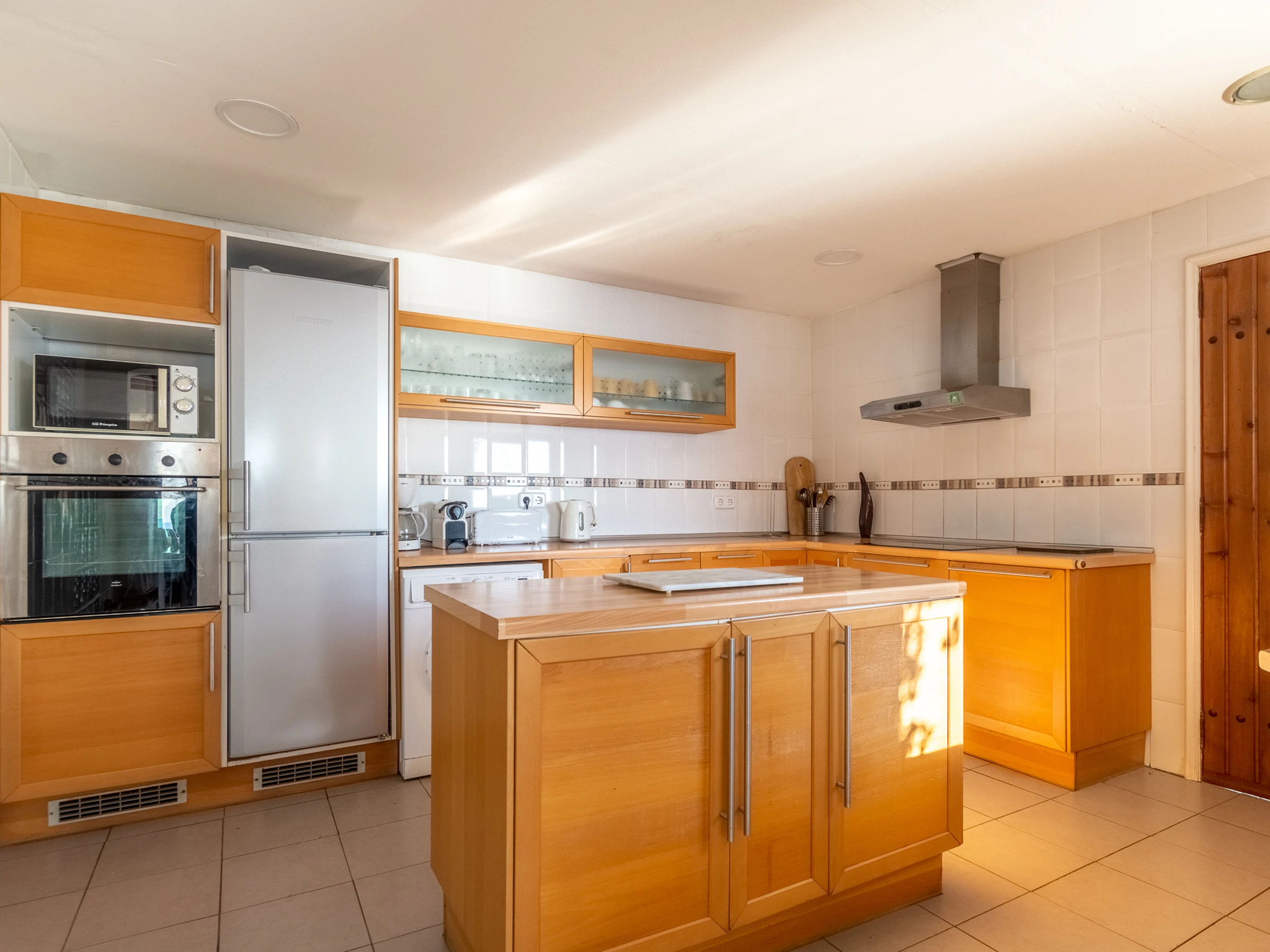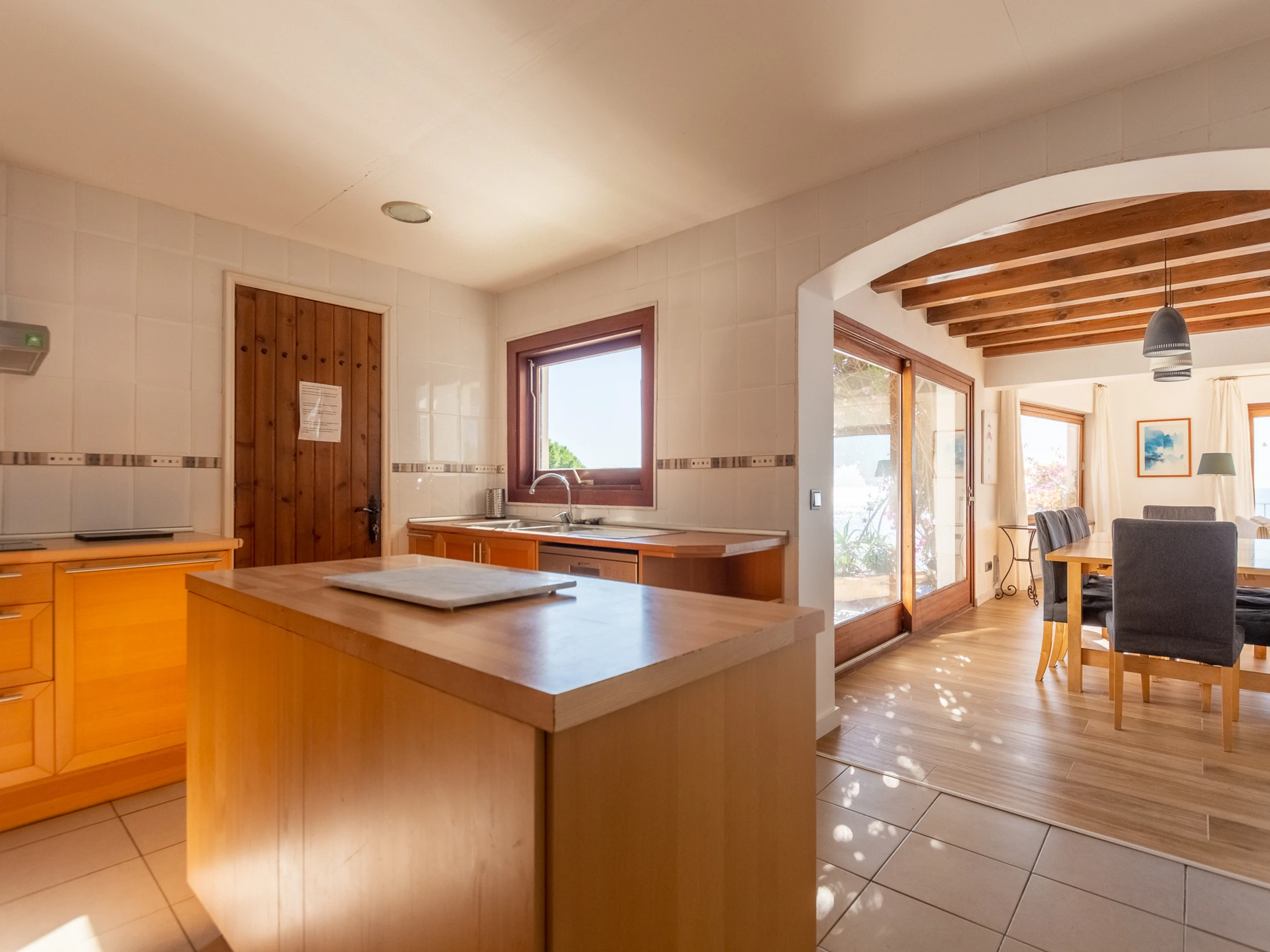A few steps down from the parking you arrive to the entrance. The villa has a spacious living room with 2 sitting areas, dining table and 180ºC sea view. Fully equipped kitchen with oven, dishwasher, microwave, utensils and sea view.