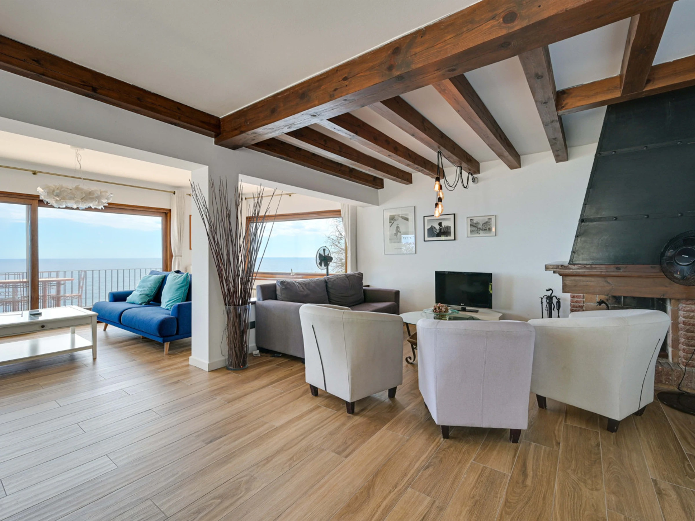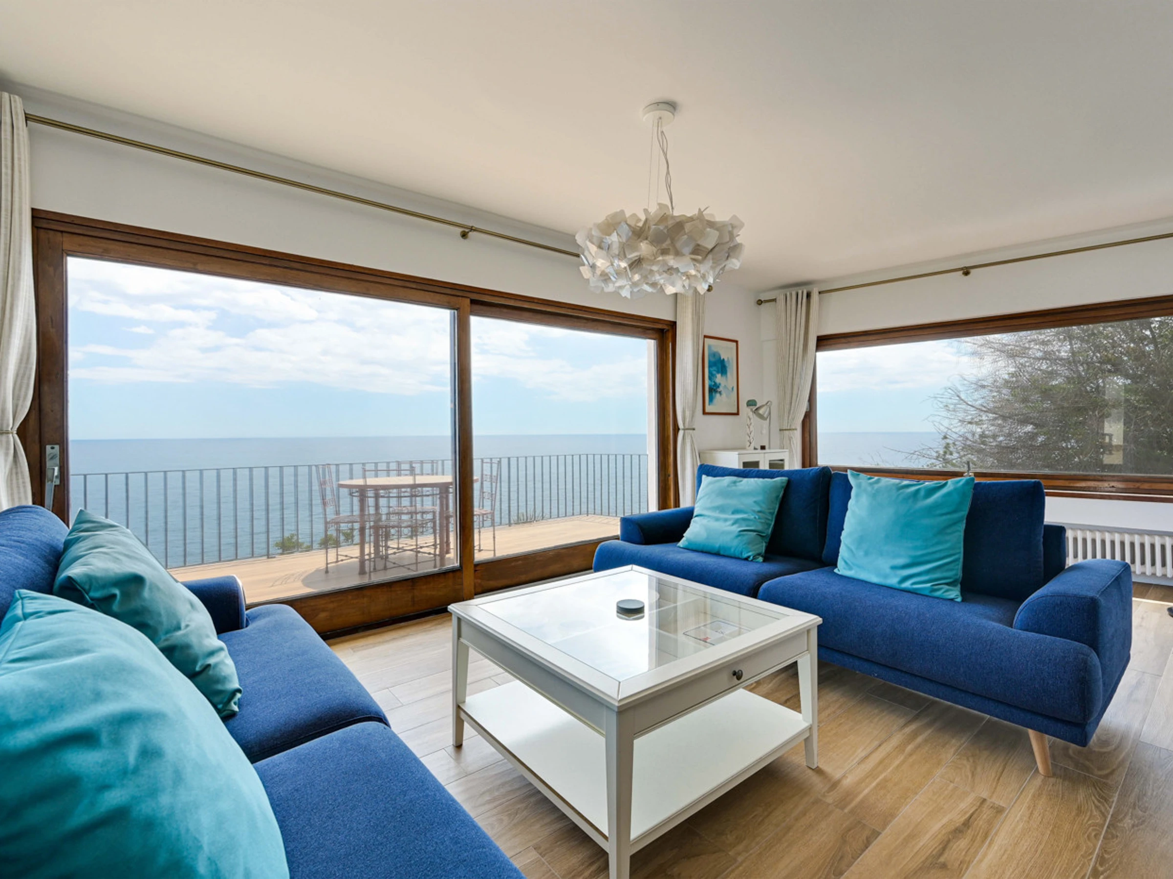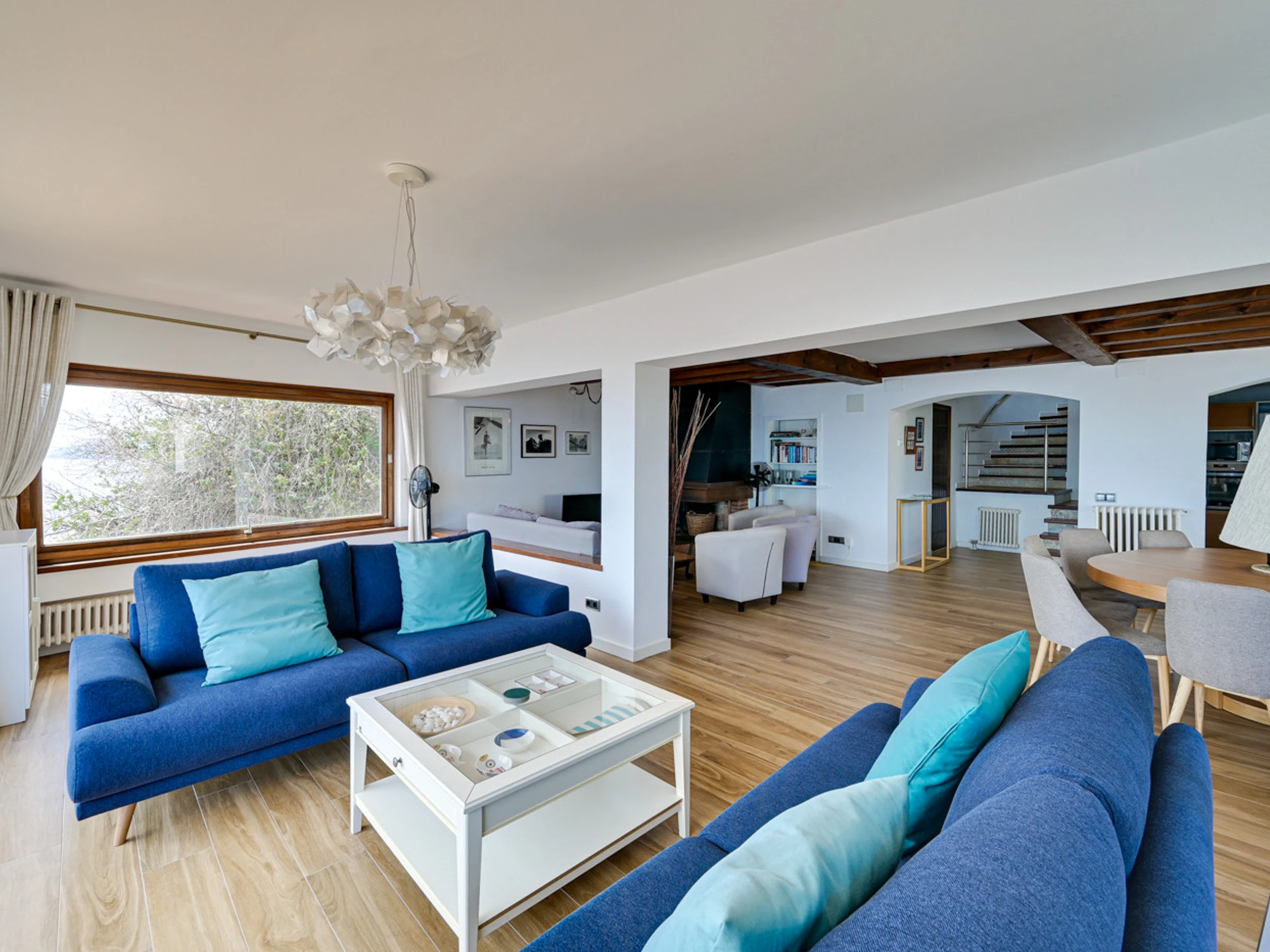 A few steps down from the parking you arrive to the entrance. The villa has a spacious living room with 2 sitting areas, dining table and 180ºC sea view. Fully equipped kitchen with oven, dishwasher, microwave, utensils and sea view.