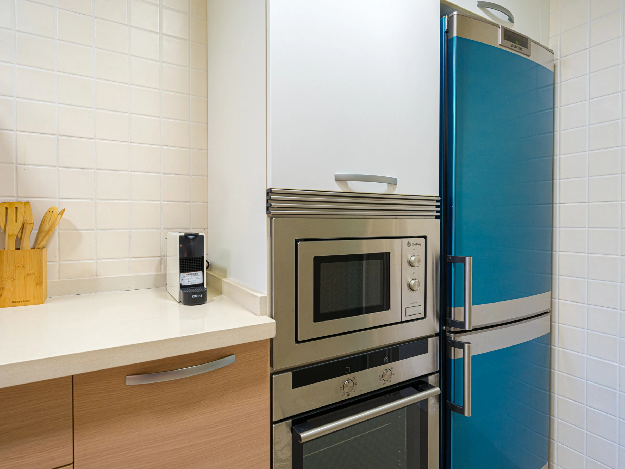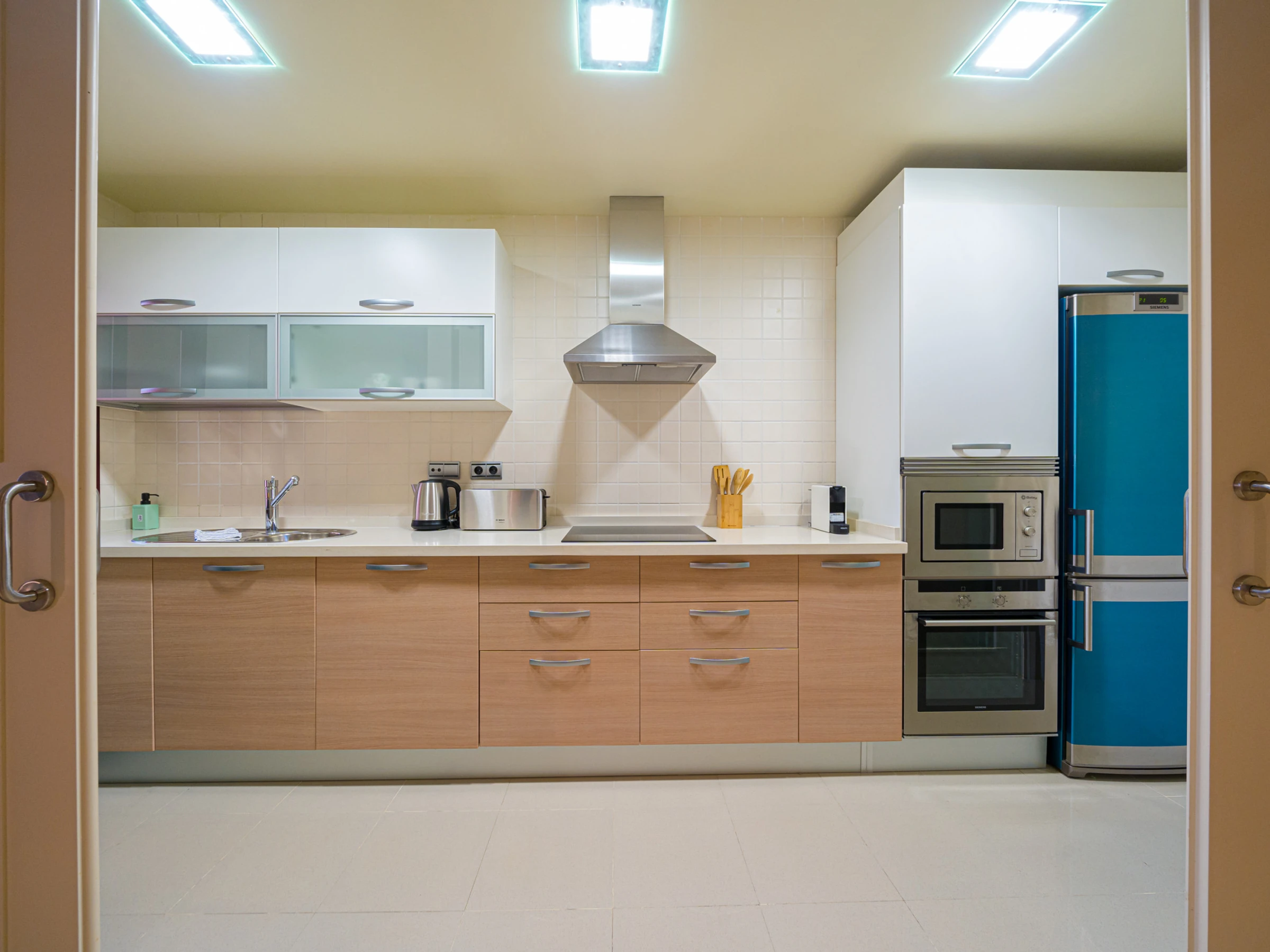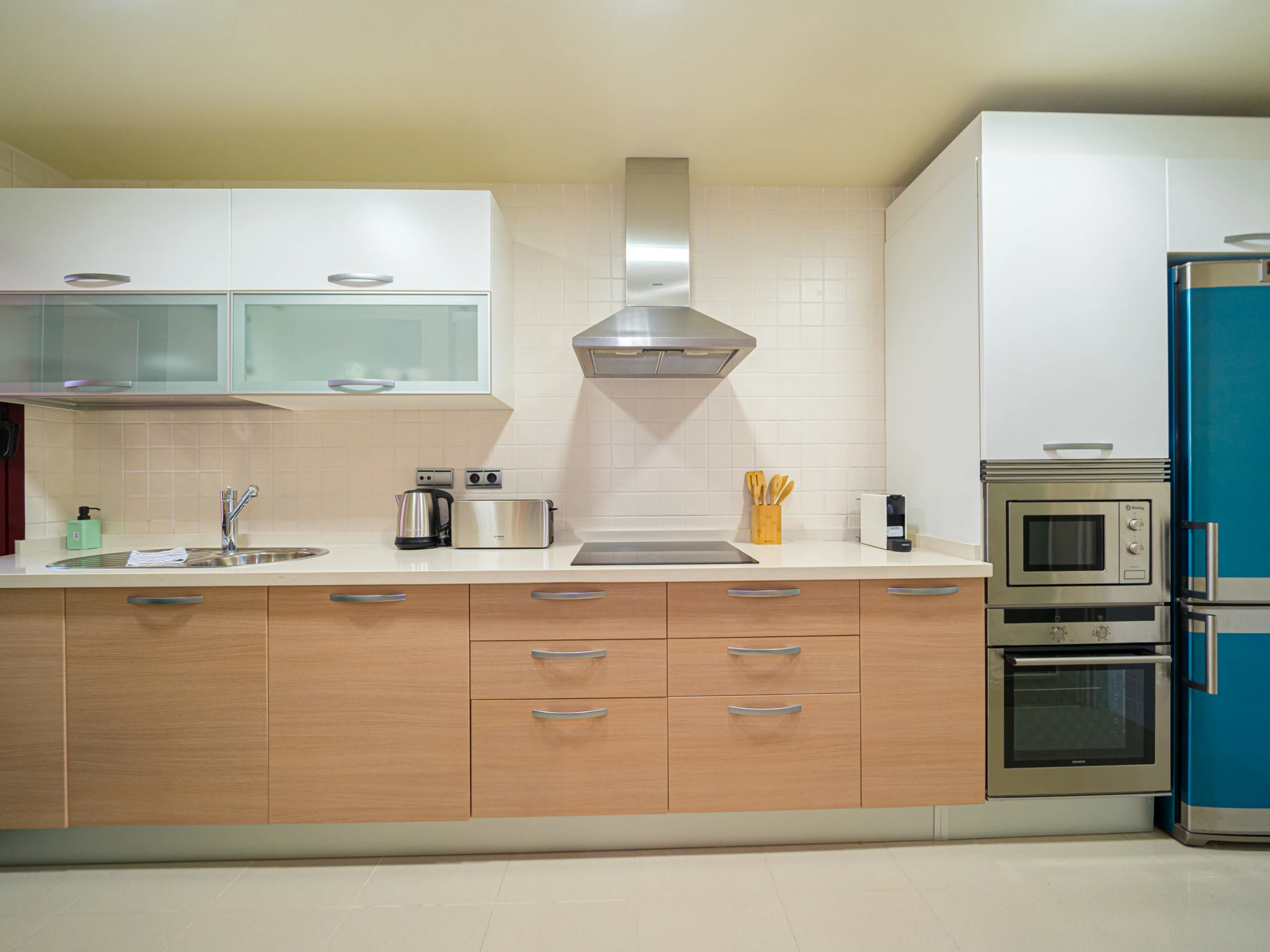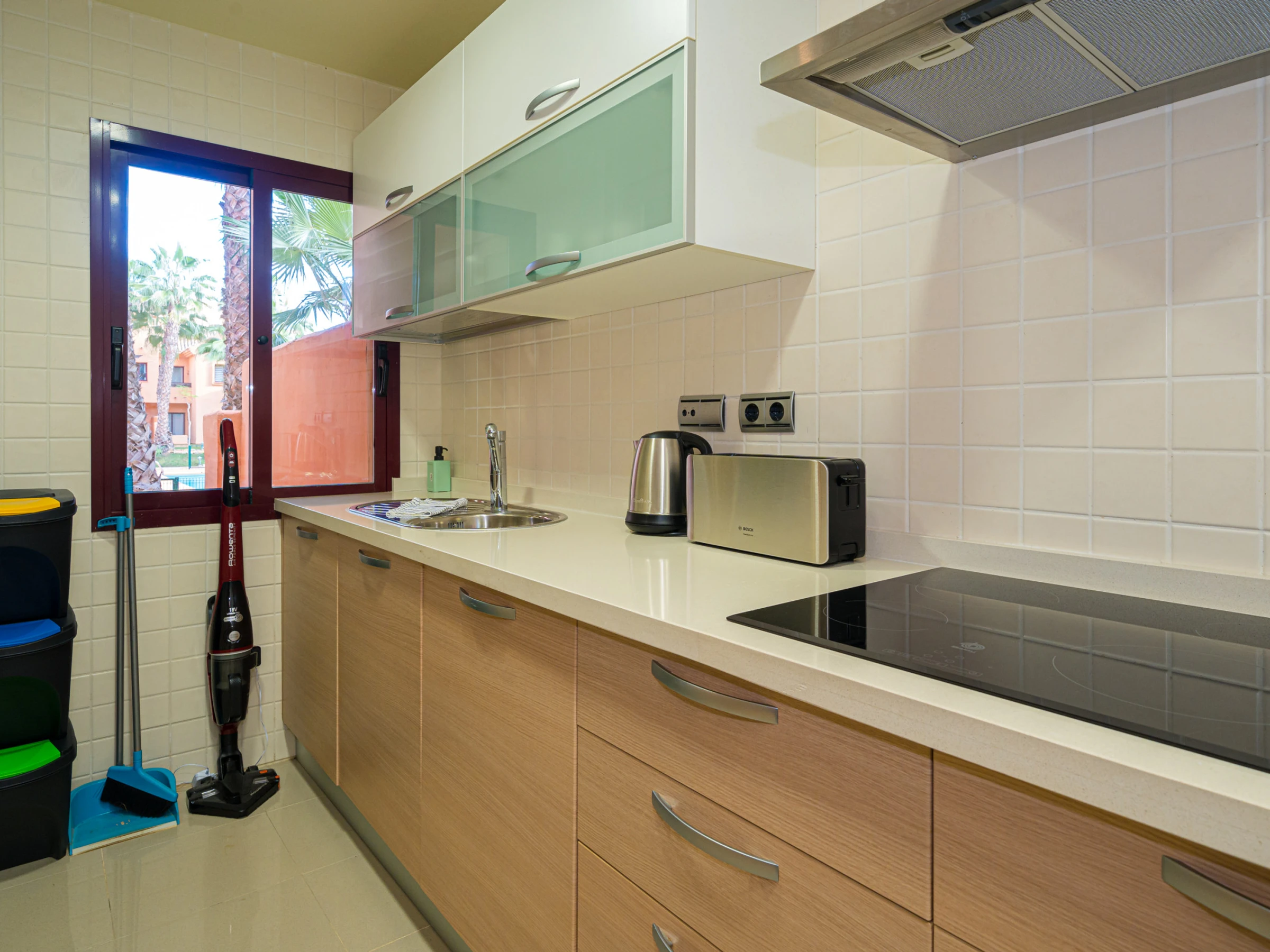 - kitchen with electric hob, electric oven, microwave, dishwasher, refrigerator, freezer, coffee machine, electric kettle, mixer, toaster and juicer