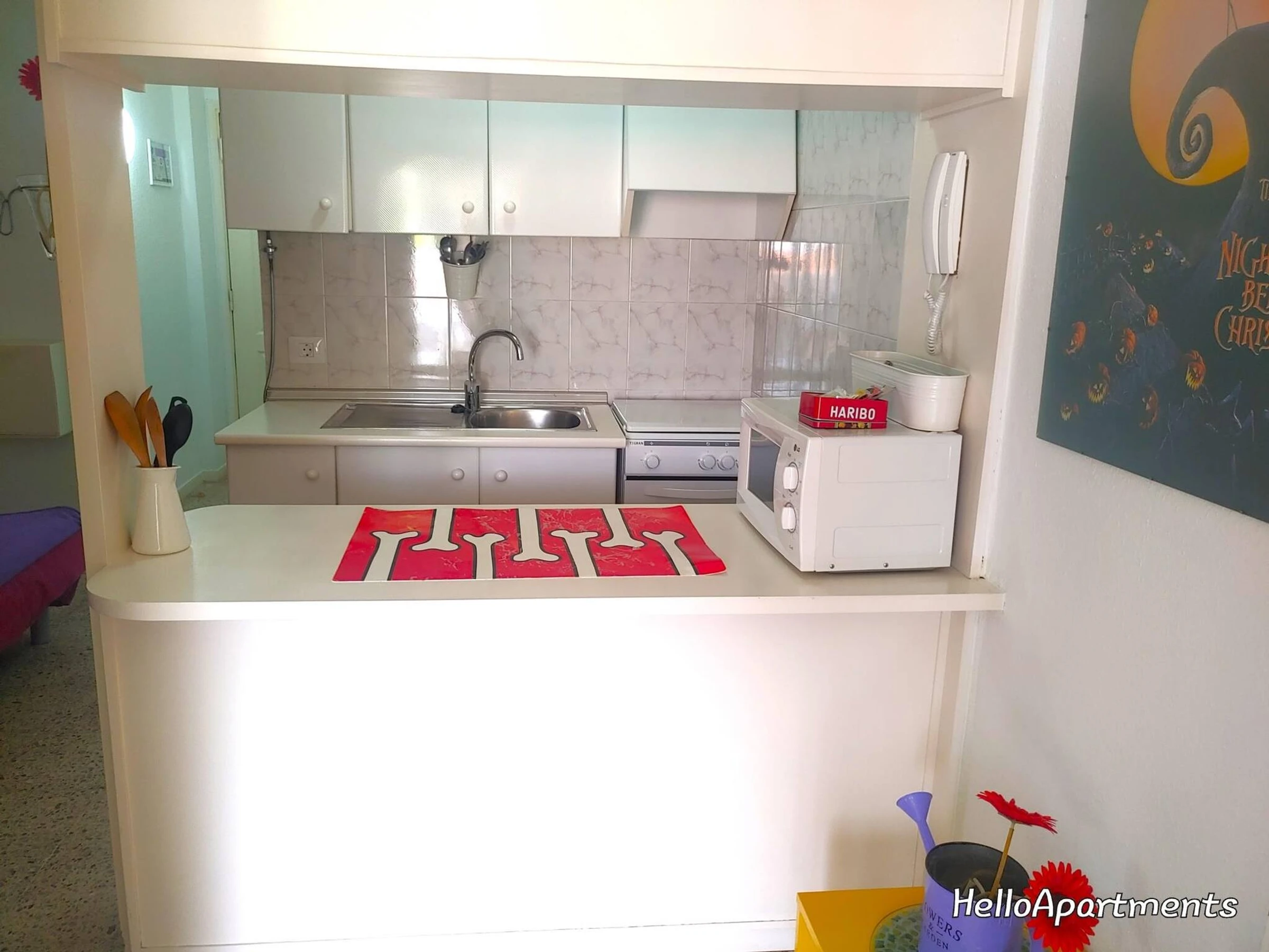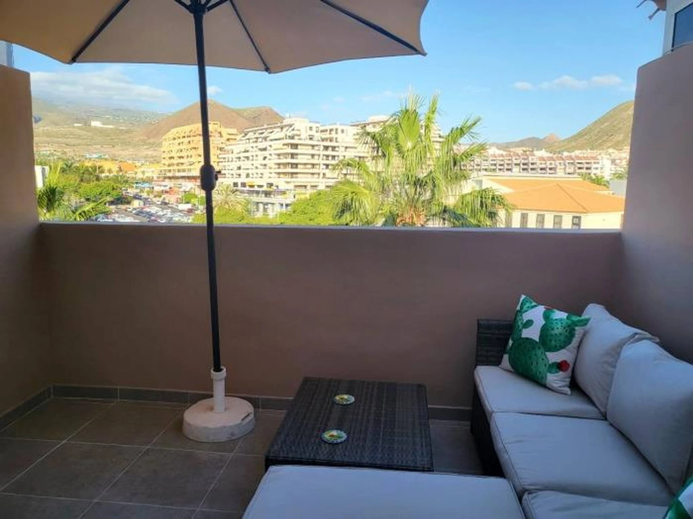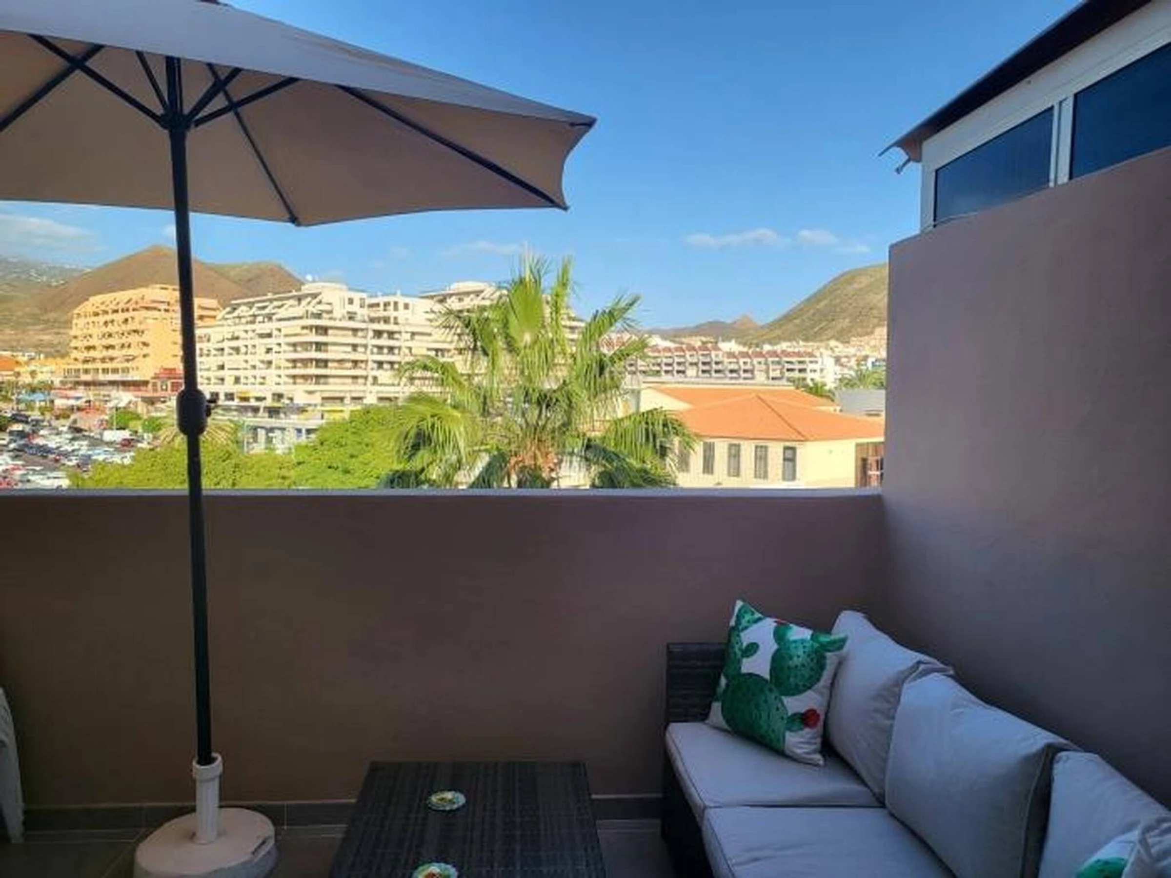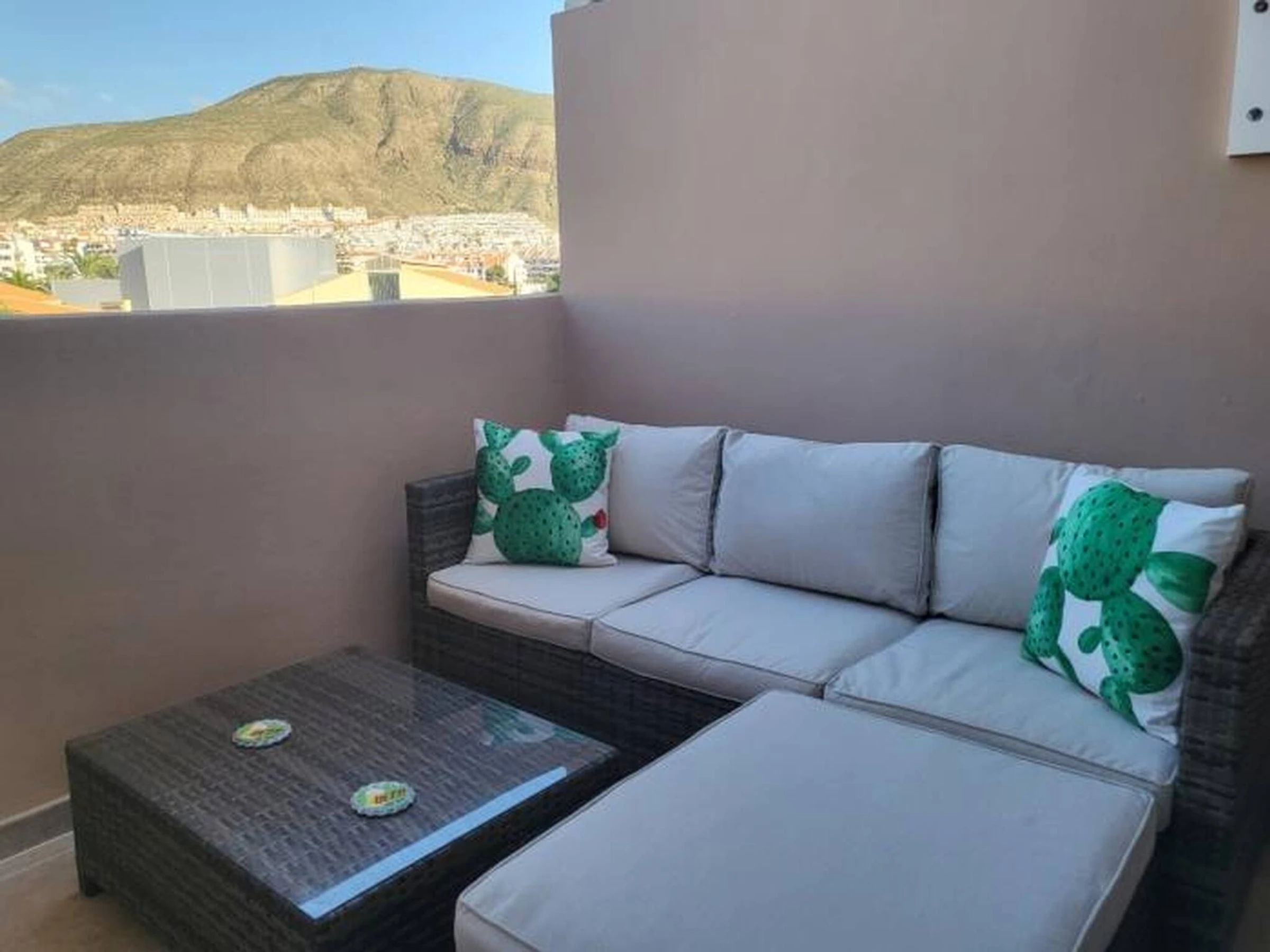 The Vacation Rental Home is located on the top floor of a 4-storey building (with lift). It consists of a comfortable double bed, fully equipped kitchenette, bathroom with bathtub and a terrace overlooking Los Cristianos framed by the mountains. It is equipped with outdoor sofas and a parasol, where you can relax and enjoy the views in a reserved and very quiet space.