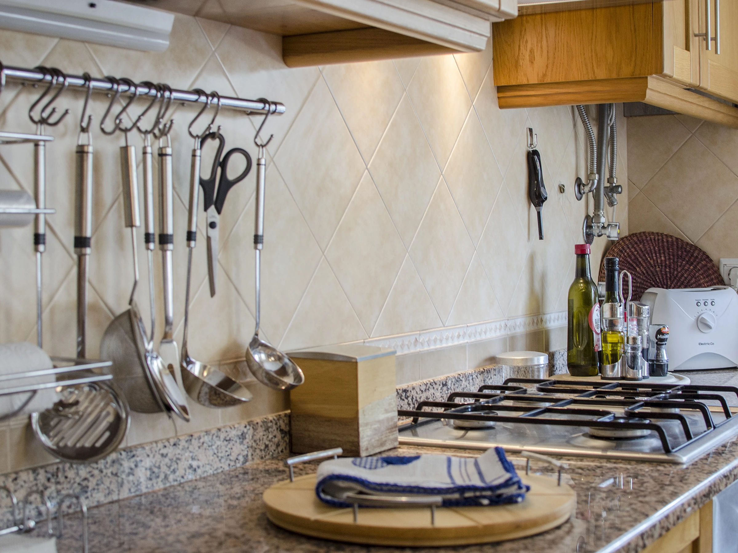 The dining and living area is bright and welcoming, with windows on both sides and a decor that mixes rustic charm with modern touches. The living room offers a flat‑screen TV with cable and English‑speaking channels, Wi‑Fi and comfy seating so you can relax after a day out. The kitchen is fully equipped and practical, with everything you need to prepare simple snacks or easy home‑cooked meals.