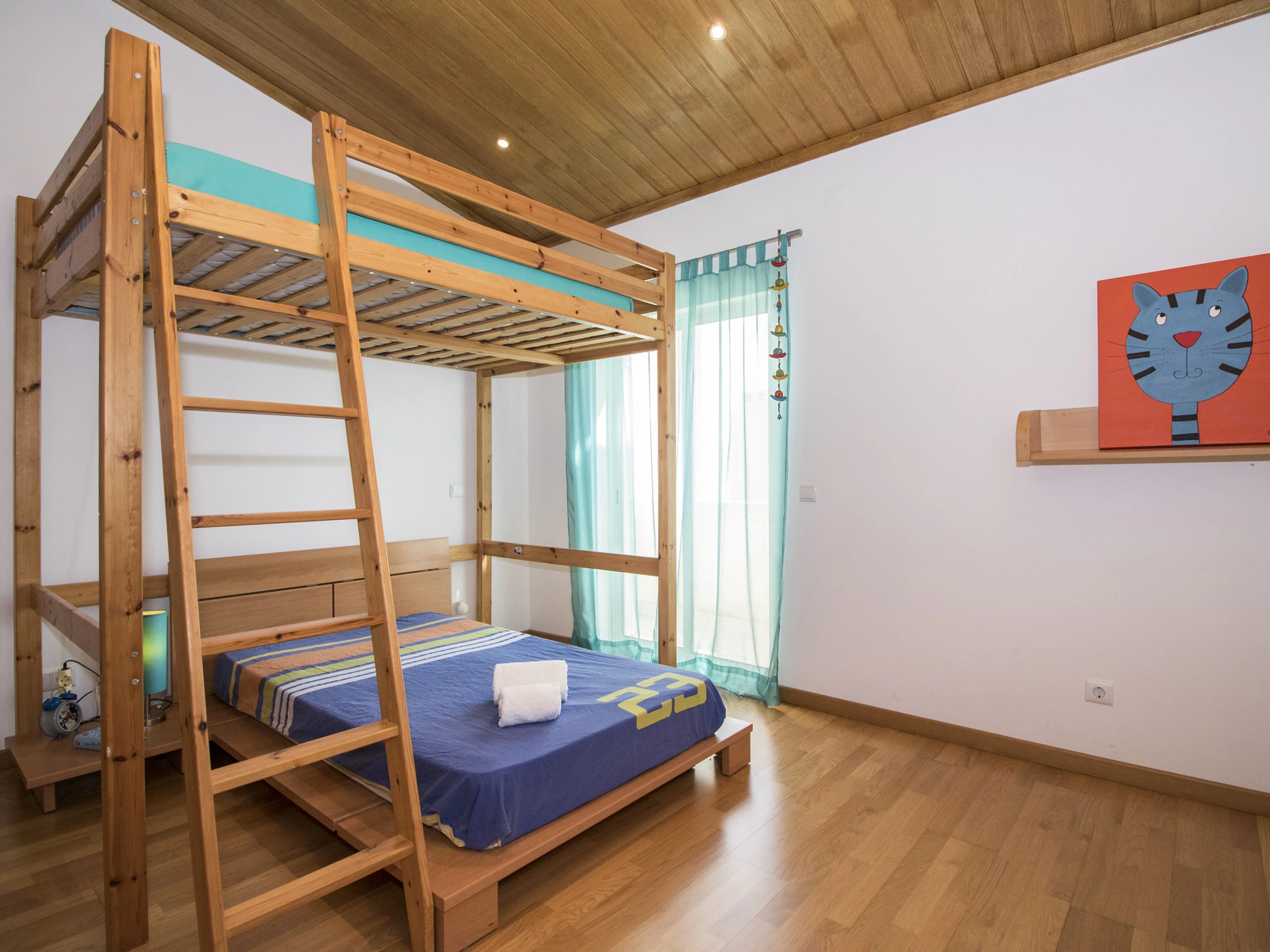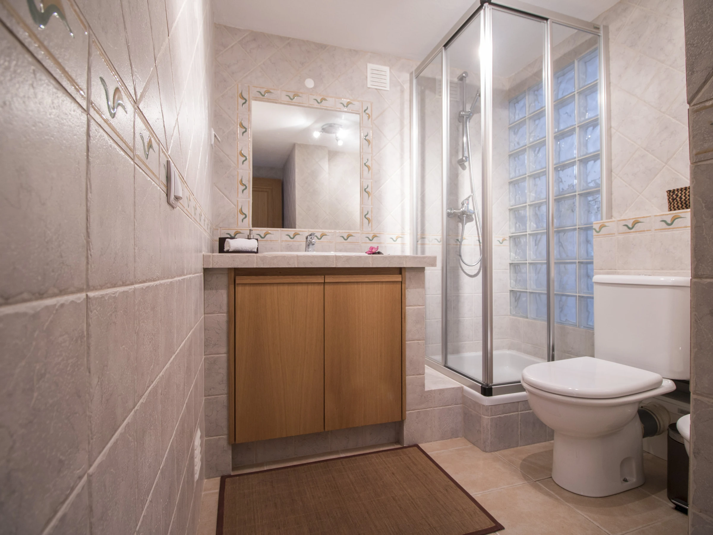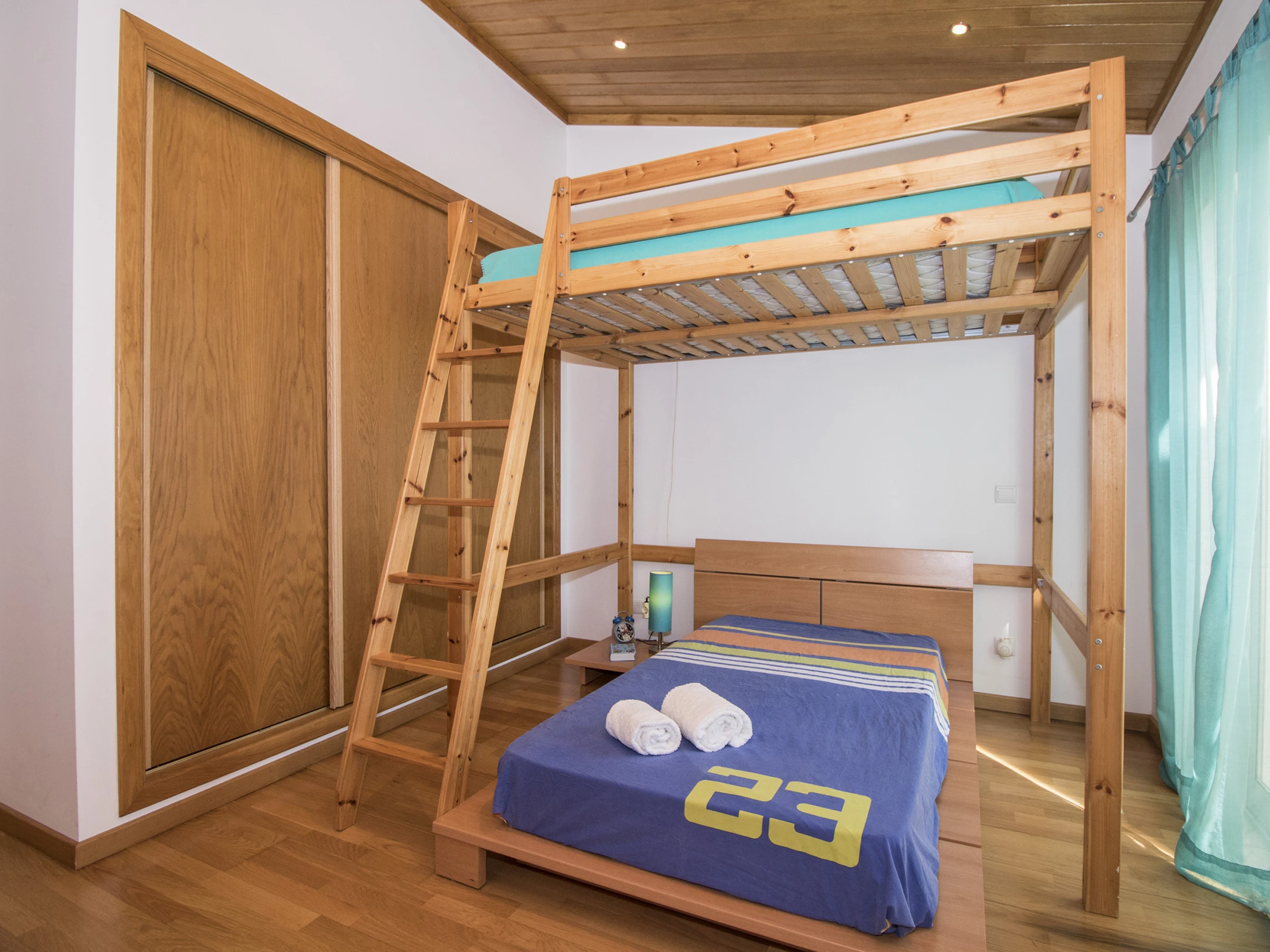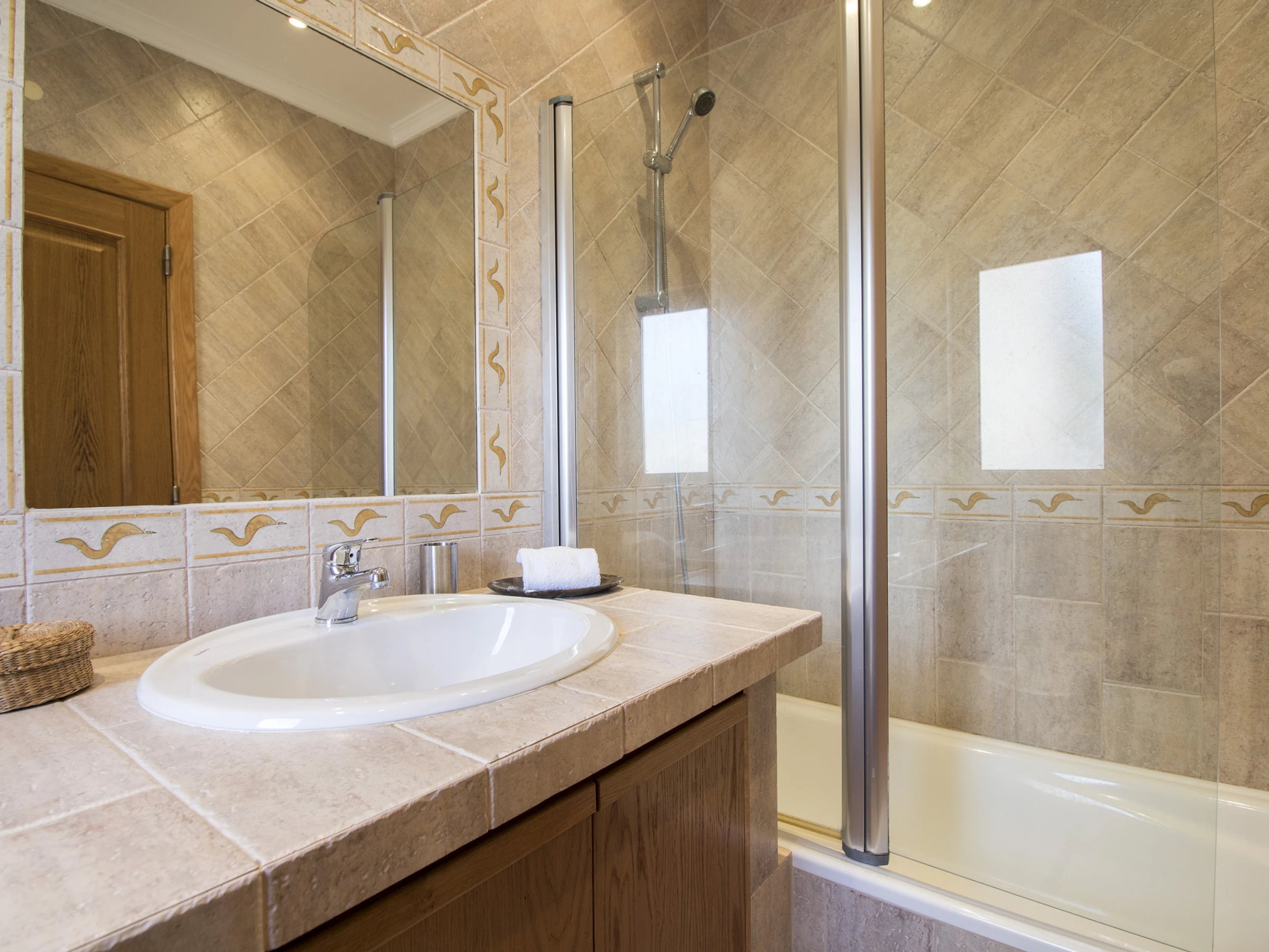 Step inside to three comfortable bedrooms and four bathrooms, giving everyone space and privacy. On the first floor, there’s a double bedroom with en‑suite bathroom with bathtub and air conditioning, plus a second bedroom with bunk bed, en‑suite shower and air conditioning—great for children or friends. On the lower level, you’ll find another double bedroom with en‑suite shower, while a guest WC on the ground floor helps keep busy mornings hassle‑free.
