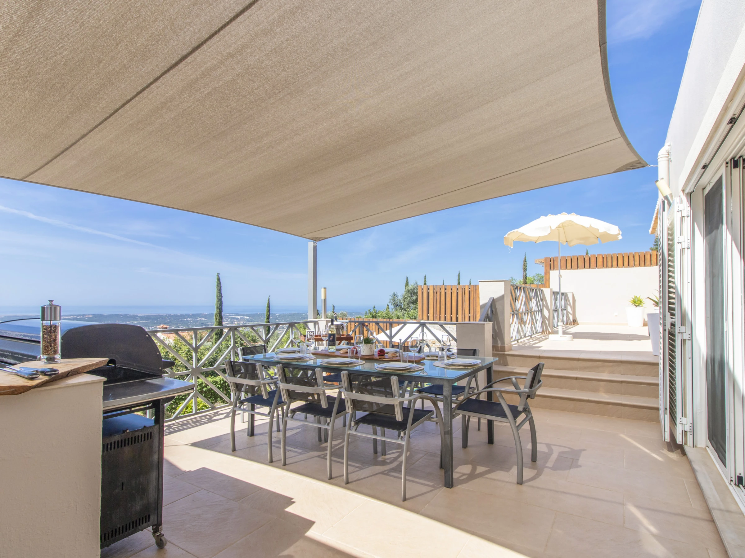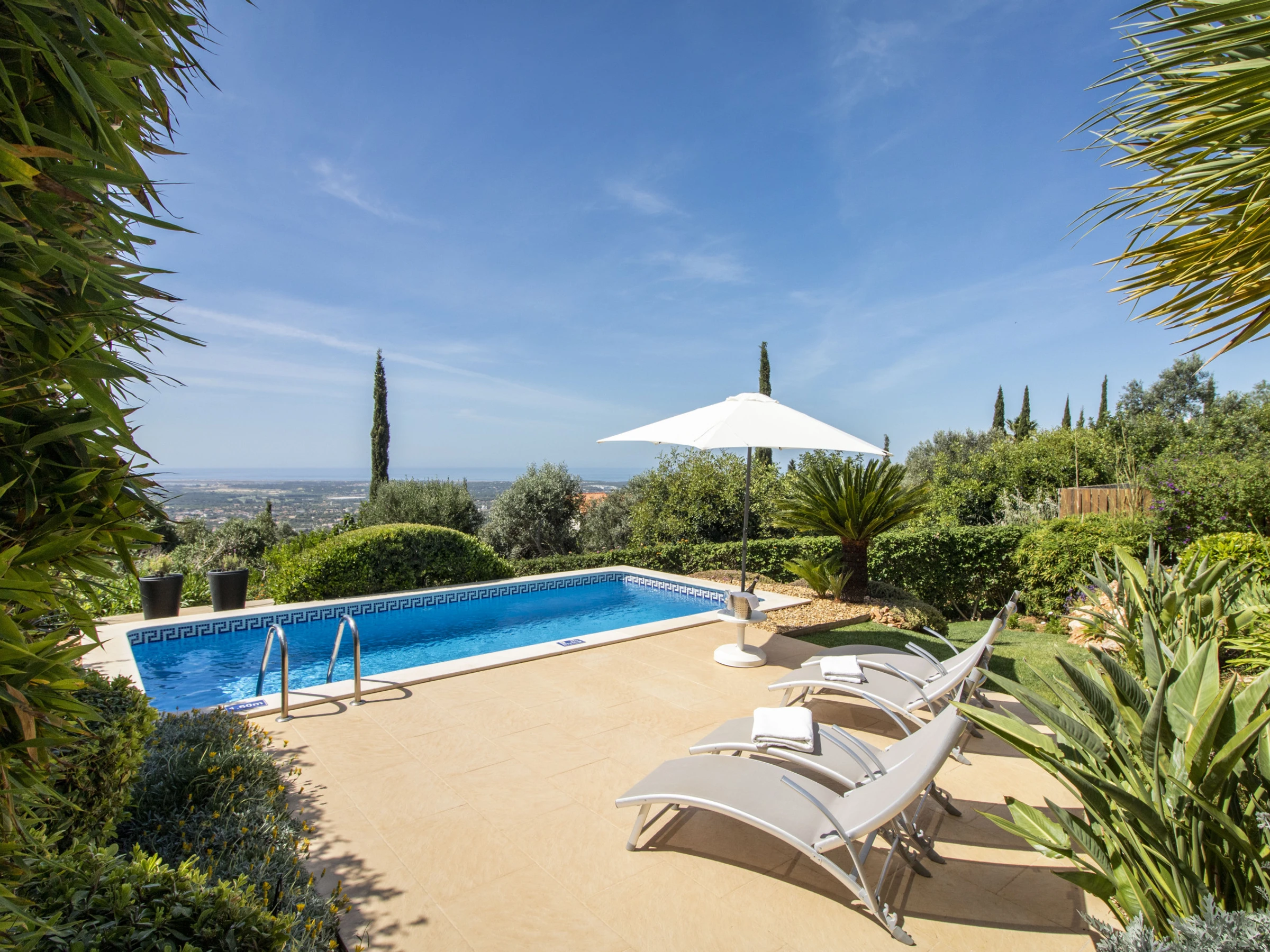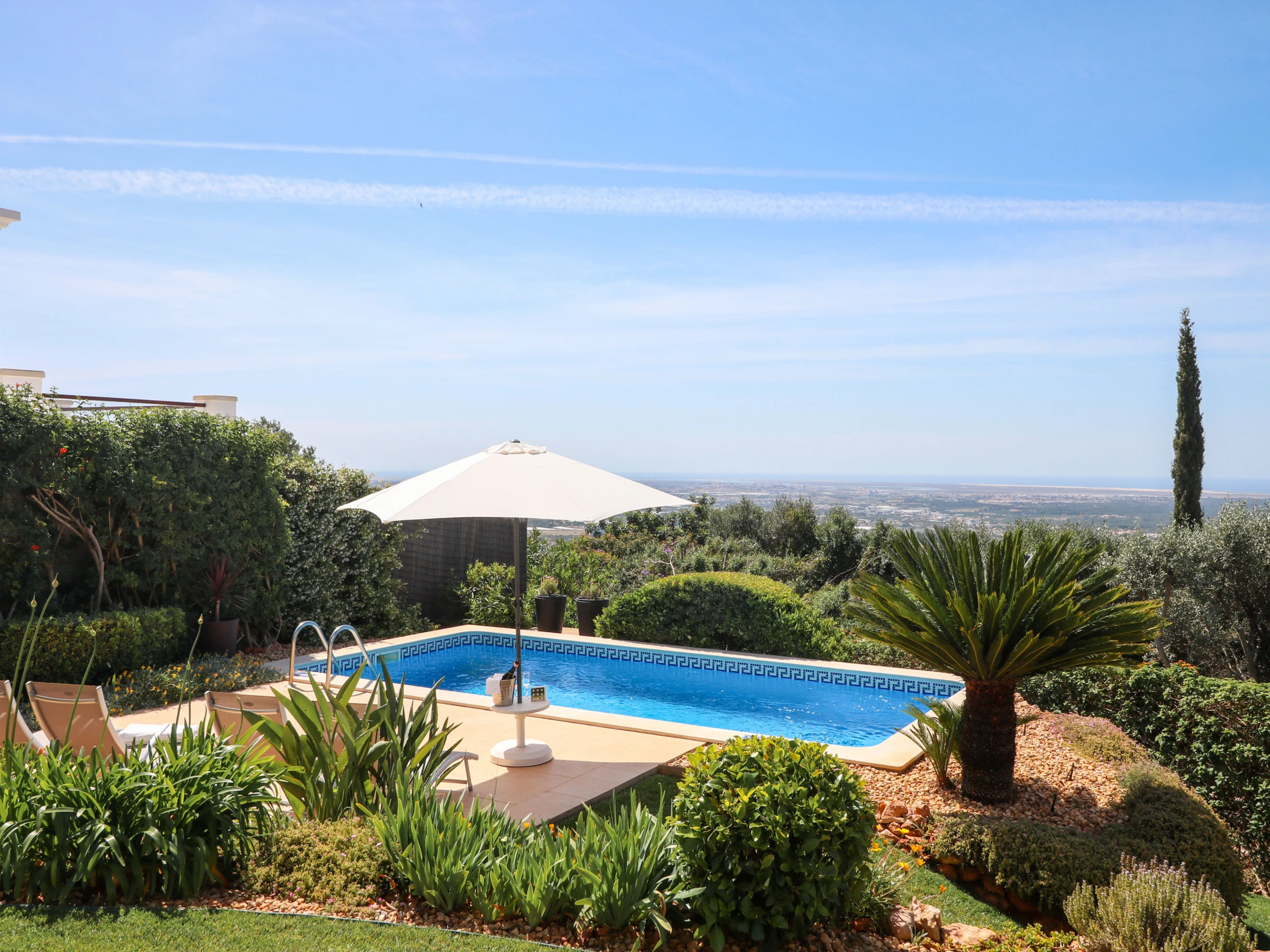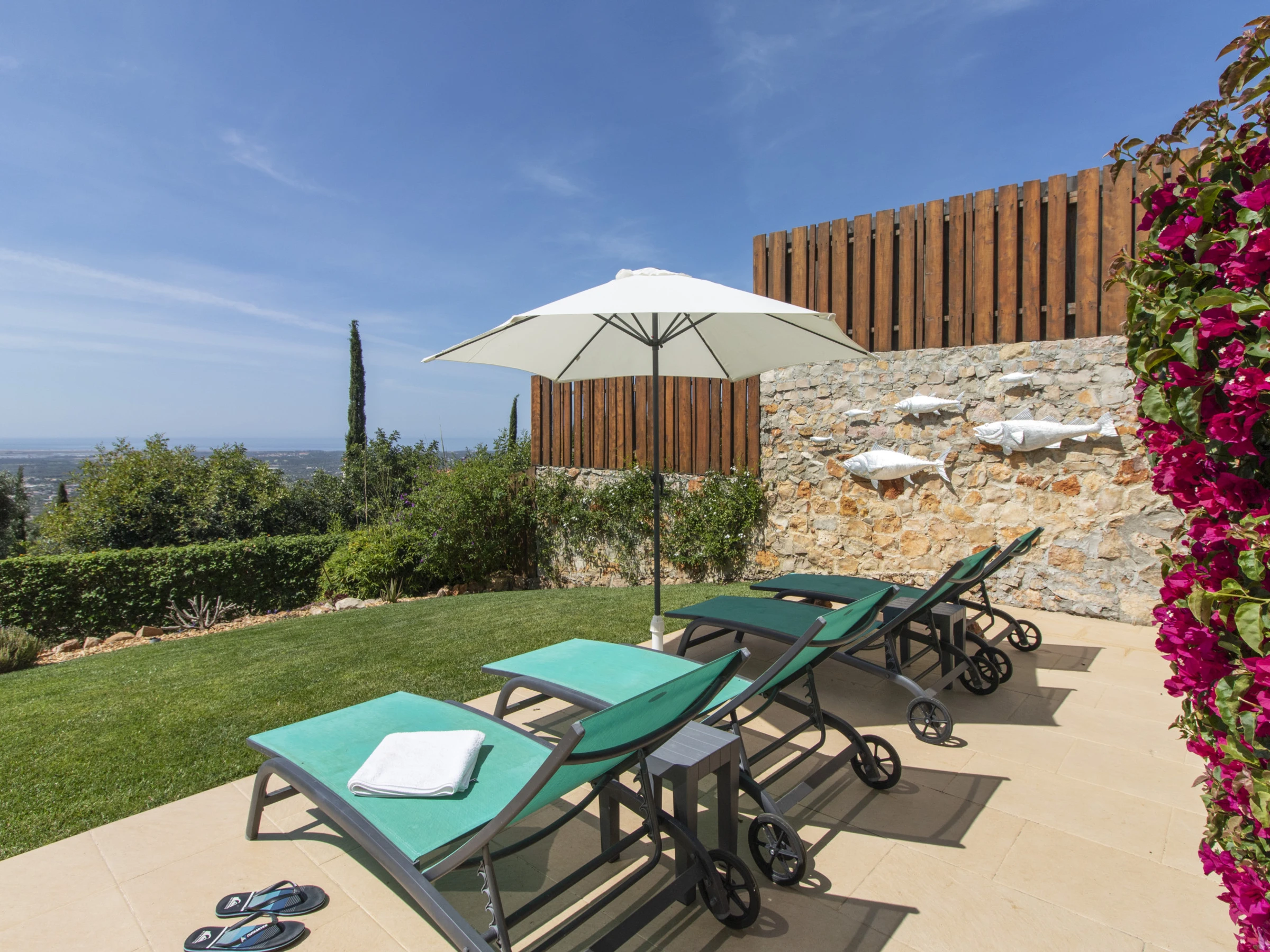 Outside, the entire plot is enclosed by walls and hedges, enhancing the sense of privacy. The terrace running along the bedrooms and living room features a gas BBQ and outdoor table with eight chairs under a shade sail, so you can enjoy al fresco meals by day or night while taking in the view. Down by the lawn at the edge of the plot sits the swimming pool (around 6.6 × 3.25 m and 1.5 m deep), surrounded by bushes and sharing the same stunning outlook; pool heating is available between April and October at extra cost, with at least 48 hours’ notice and subject to suitable temperatures.