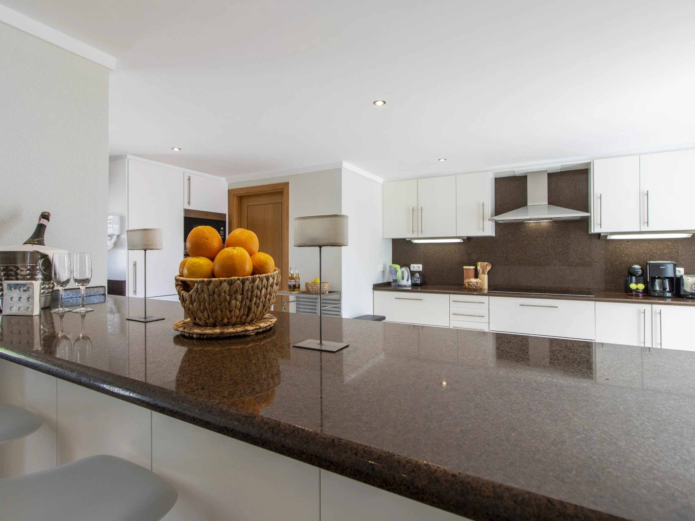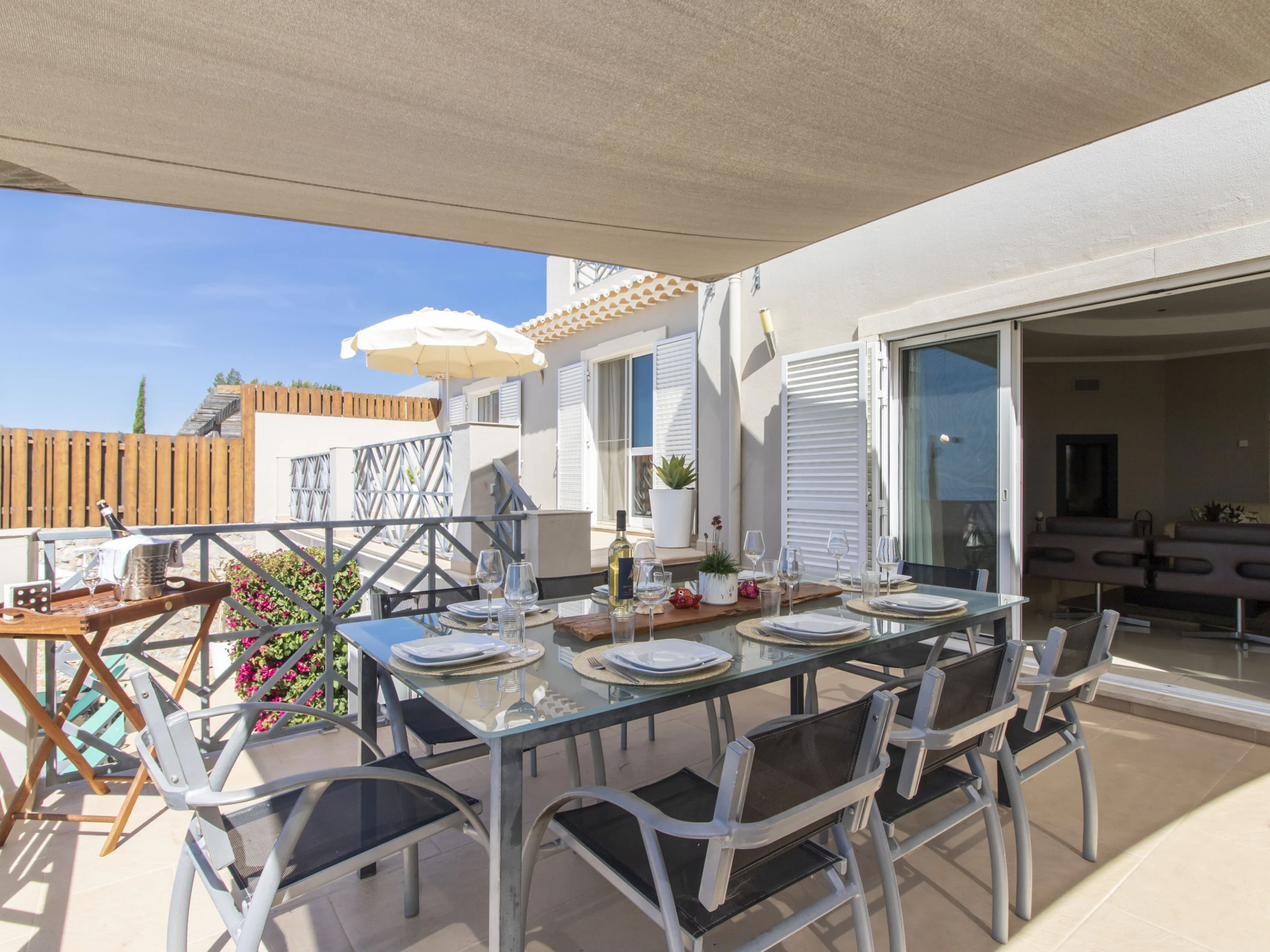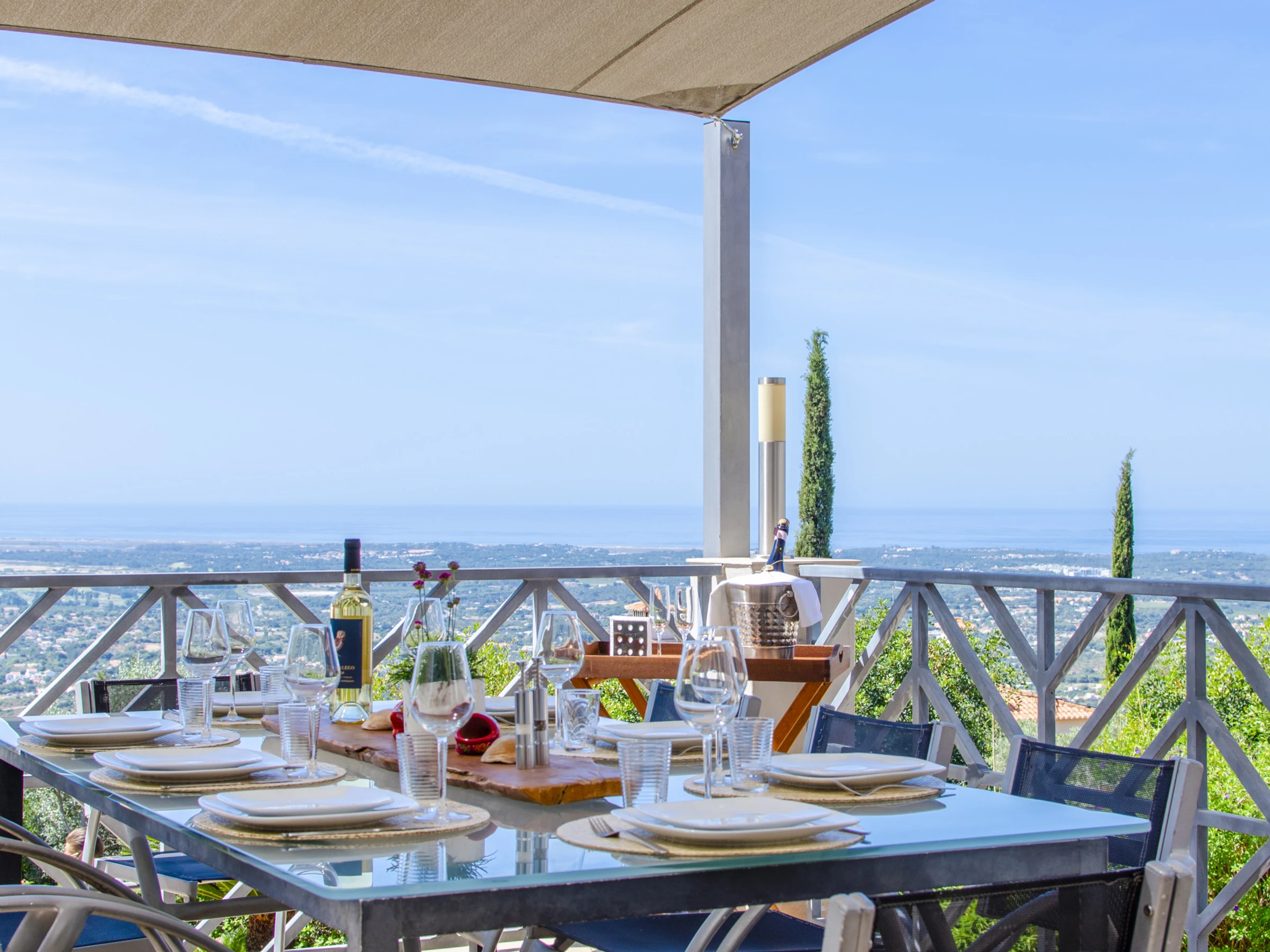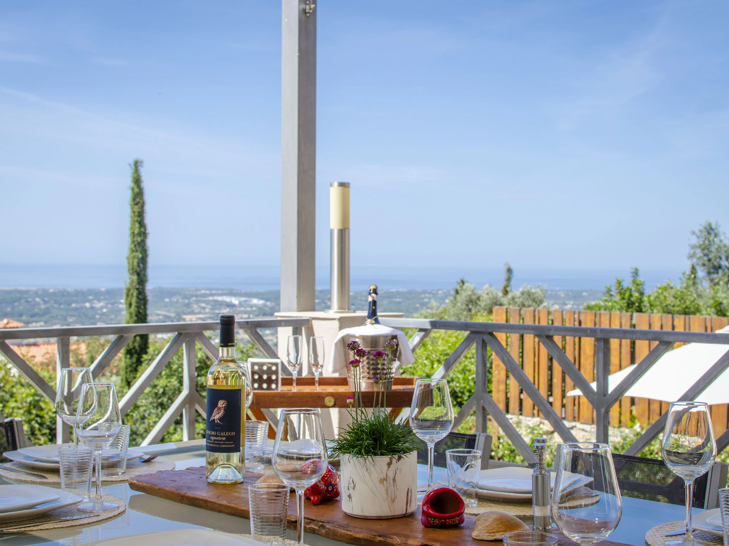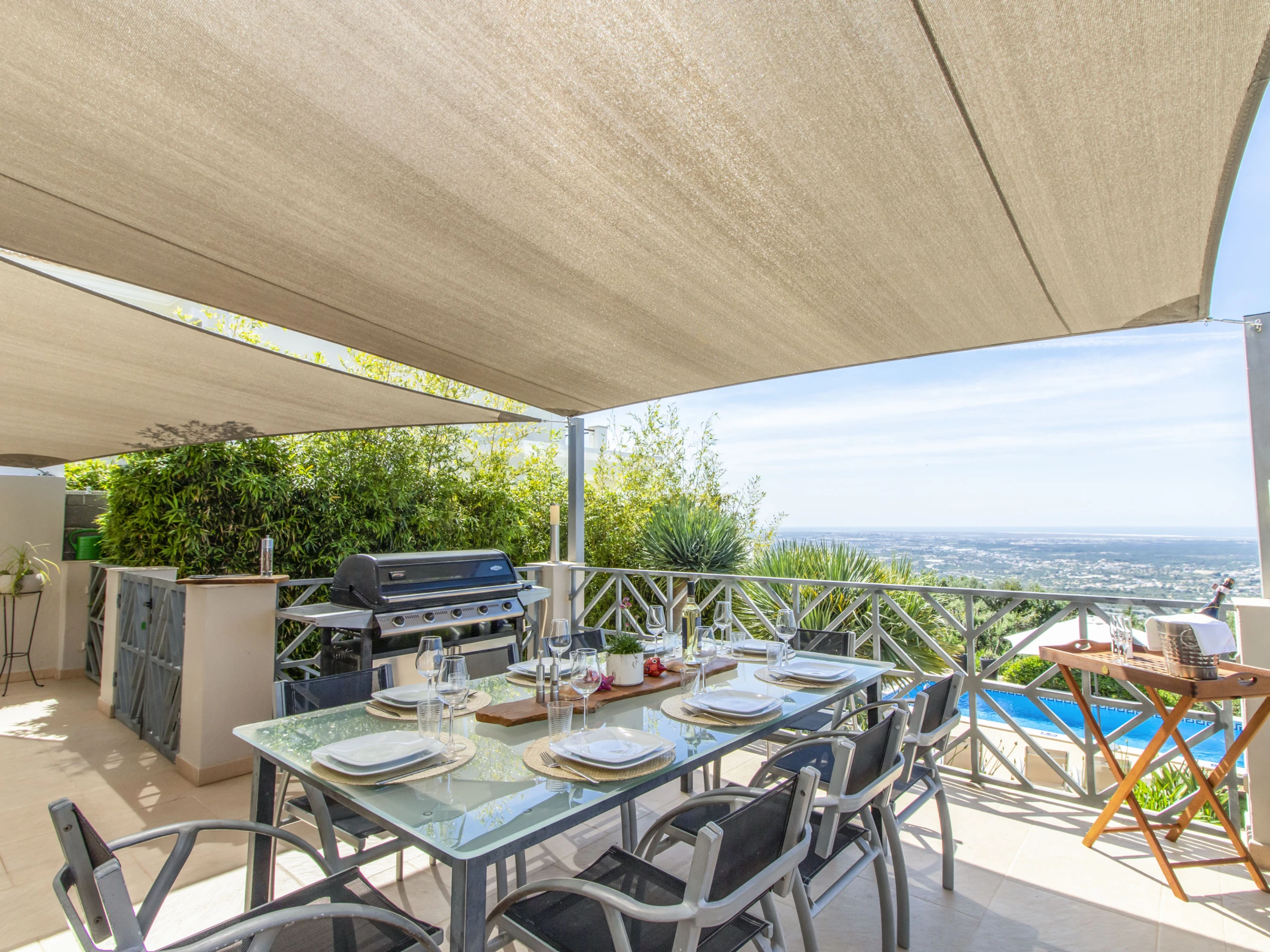 Outside, the entire plot is enclosed by walls and hedges, enhancing the sense of privacy. The terrace running along the bedrooms and living room features a gas BBQ and outdoor table with eight chairs under a shade sail, so you can enjoy al fresco meals by day or night while taking in the view. Down by the lawn at the edge of the plot sits the swimming pool (around 6.6 × 3.25 m and 1.5 m deep), surrounded by bushes and sharing the same stunning outlook; pool heating is available between April and October at extra cost, with at least 48 hours’ notice and subject to suitable temperatures.