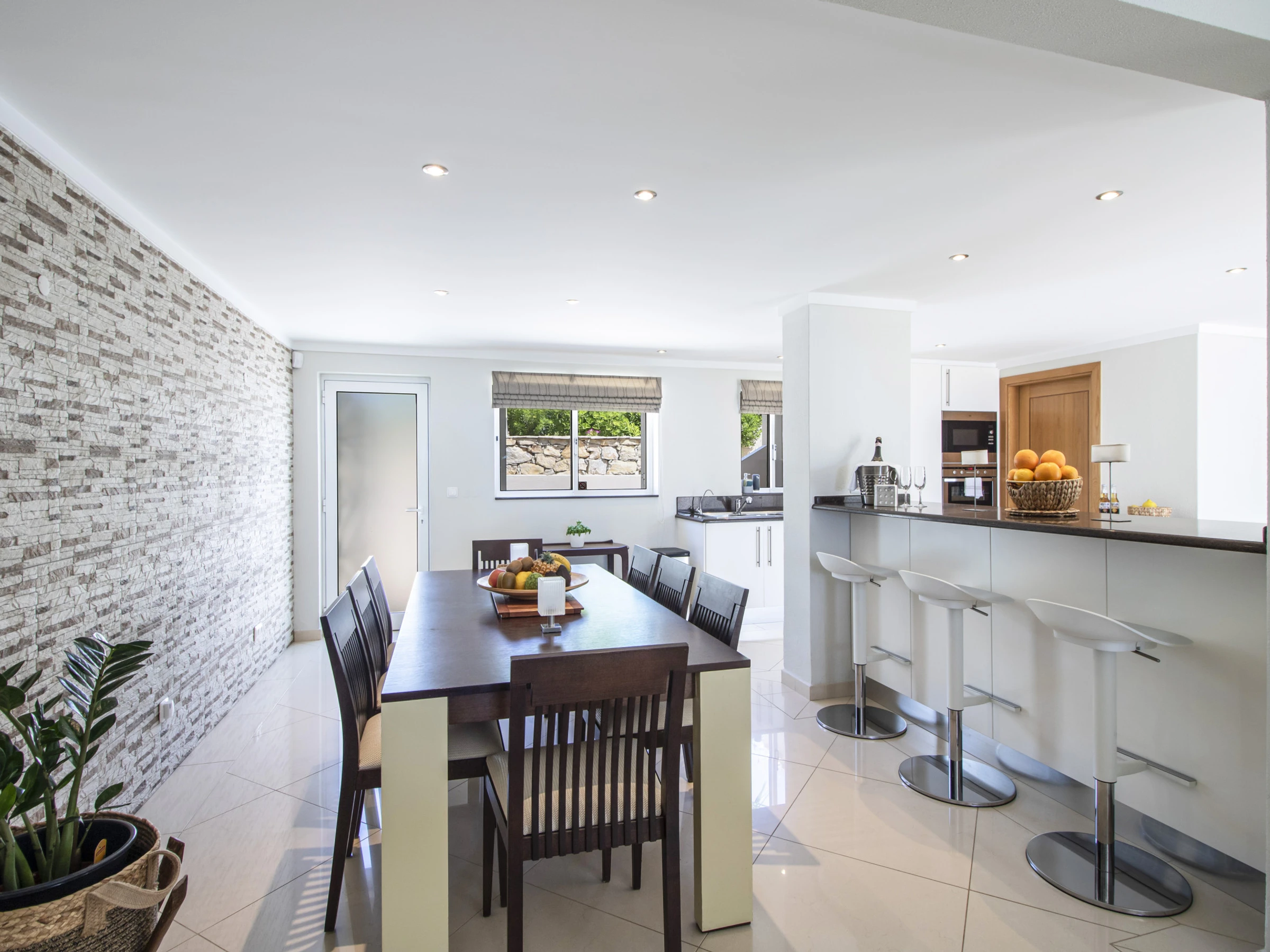 The kitchen is modern and fully equipped with all the appliances you need, plus an island with plenty of storage and bar stools for casual meals. The dining room has a large table and chairs for eight, with direct access to the front and back gardens and to the laundry room with washer and dryer. The living room shares the same open‑plan space and feels warm and welcoming thanks to the fireplace, sofas, and armchairs with seating for eight, a large flat‑screen TV (with fibre box and 200+ channels, including French TV), DVD, sound bar and fibre Wi‑Fi, as well as a large sliding door out to the terrace, BBQ area, garden, pool, and views.