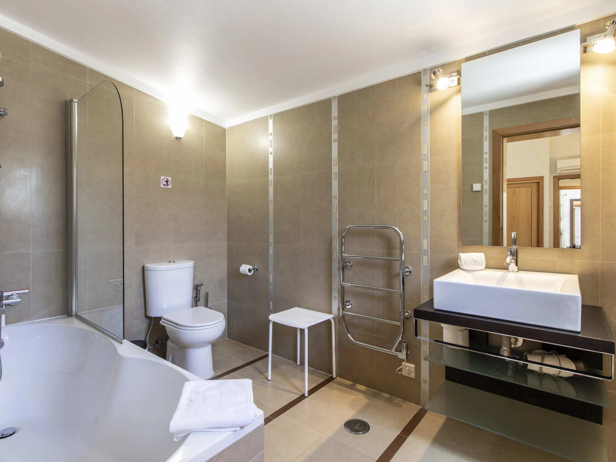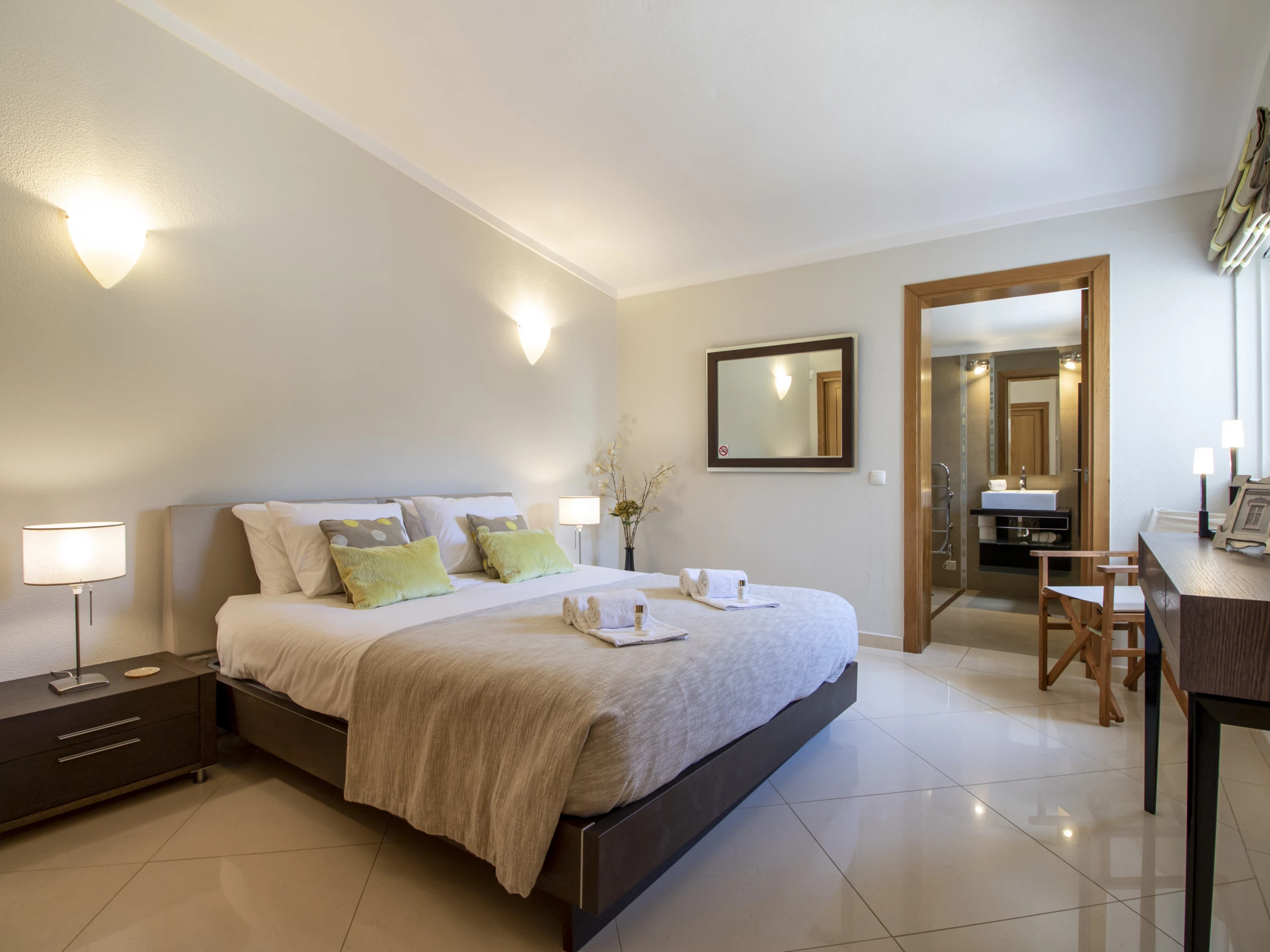 Step inside to four comfortable, air‑conditioned bedrooms, three bathrooms and a guest WC, giving everyone space and convenience. On the first floor, there is a king‑size bedroom with a private bathroom, while on the ground floor you will find a double bedroom with a private bathroom with bathtub and two twin bedrooms sharing a bathroom.