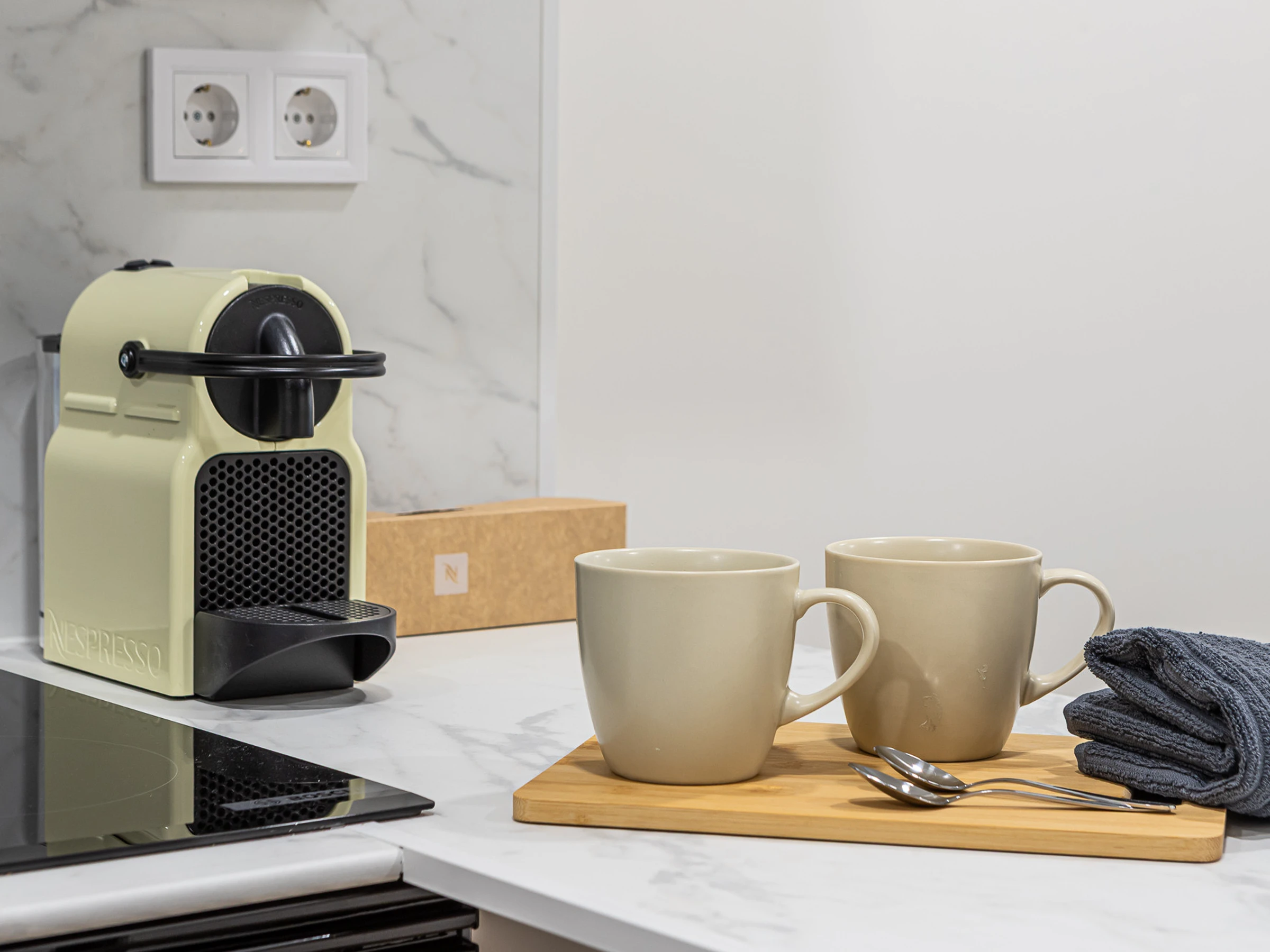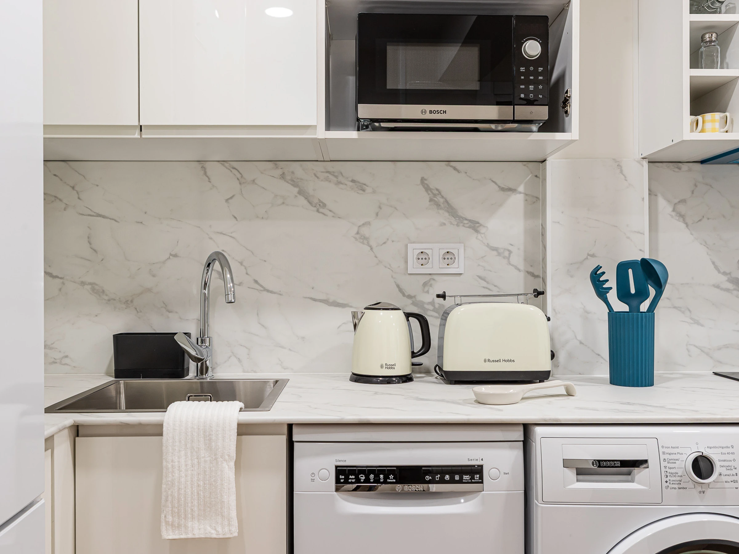 The American kitchen is fully equipped with state-of-the-art appliances, including a fridge, washing machine, oven, microwave, coffee maker, toaster, kettle, juicer and a wide variety of kitchenware. Perfect for preparing quick breakfasts or intimate dinners.