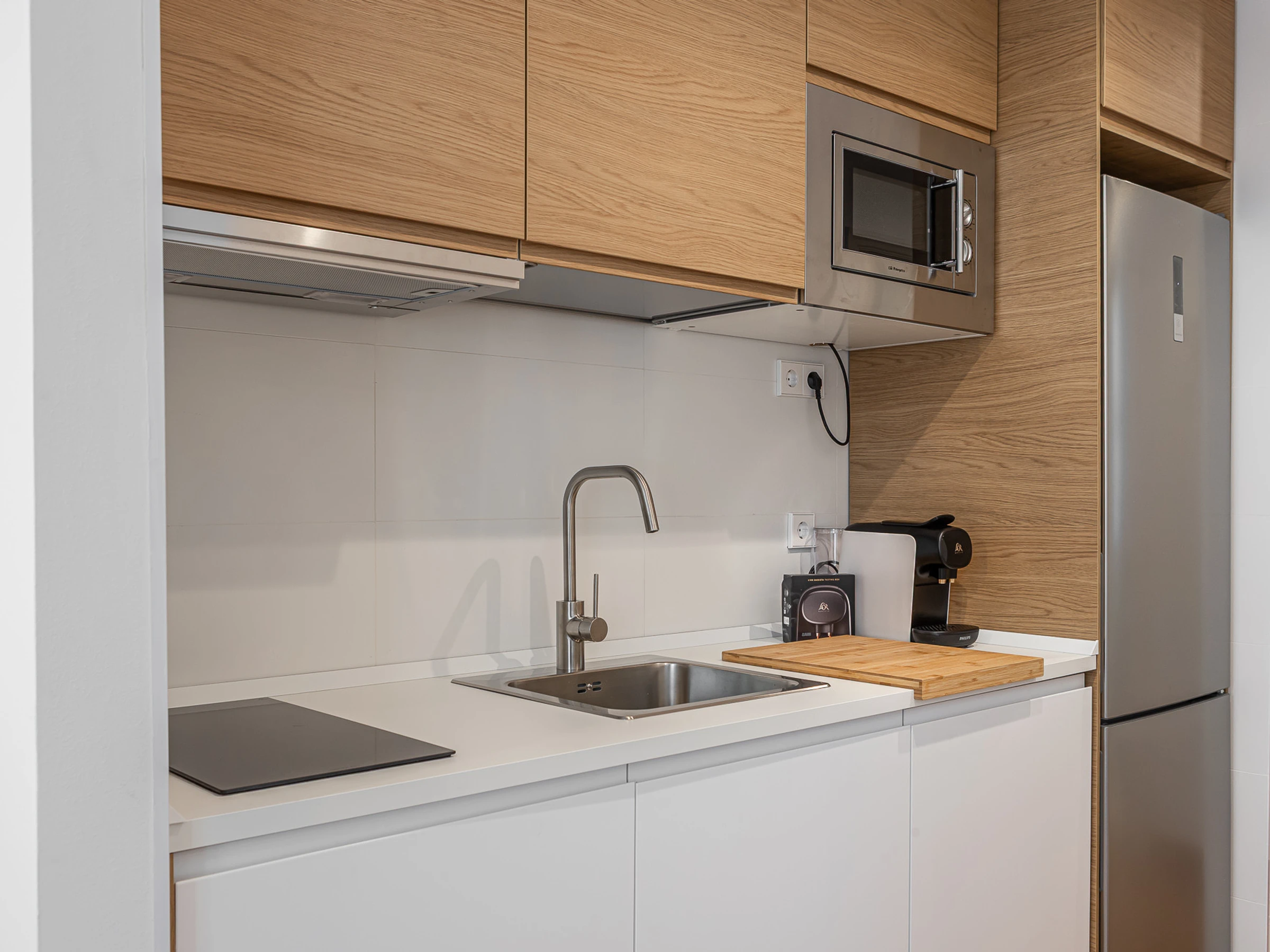 The American kitchen is fully equipped with state-of-the-art appliances: fridge, washing machine, dishwasher, microwave, coffee maker, toaster, kettle, juicer and complete kitchenware. Ideal for preparing your own meals during your stay.