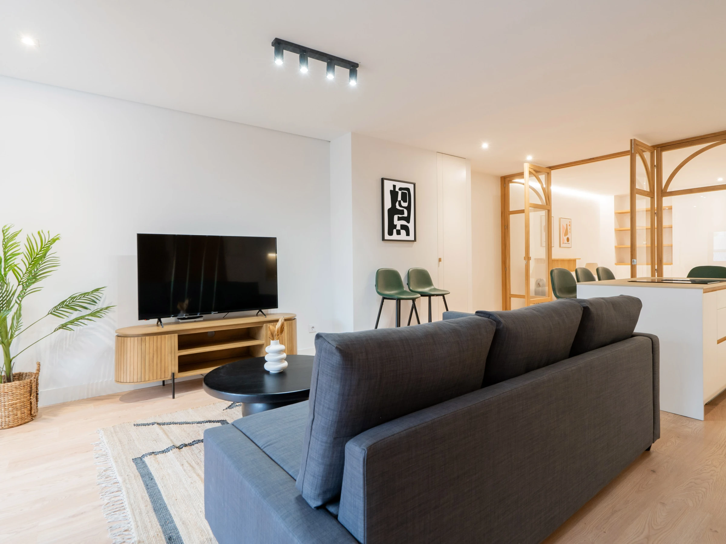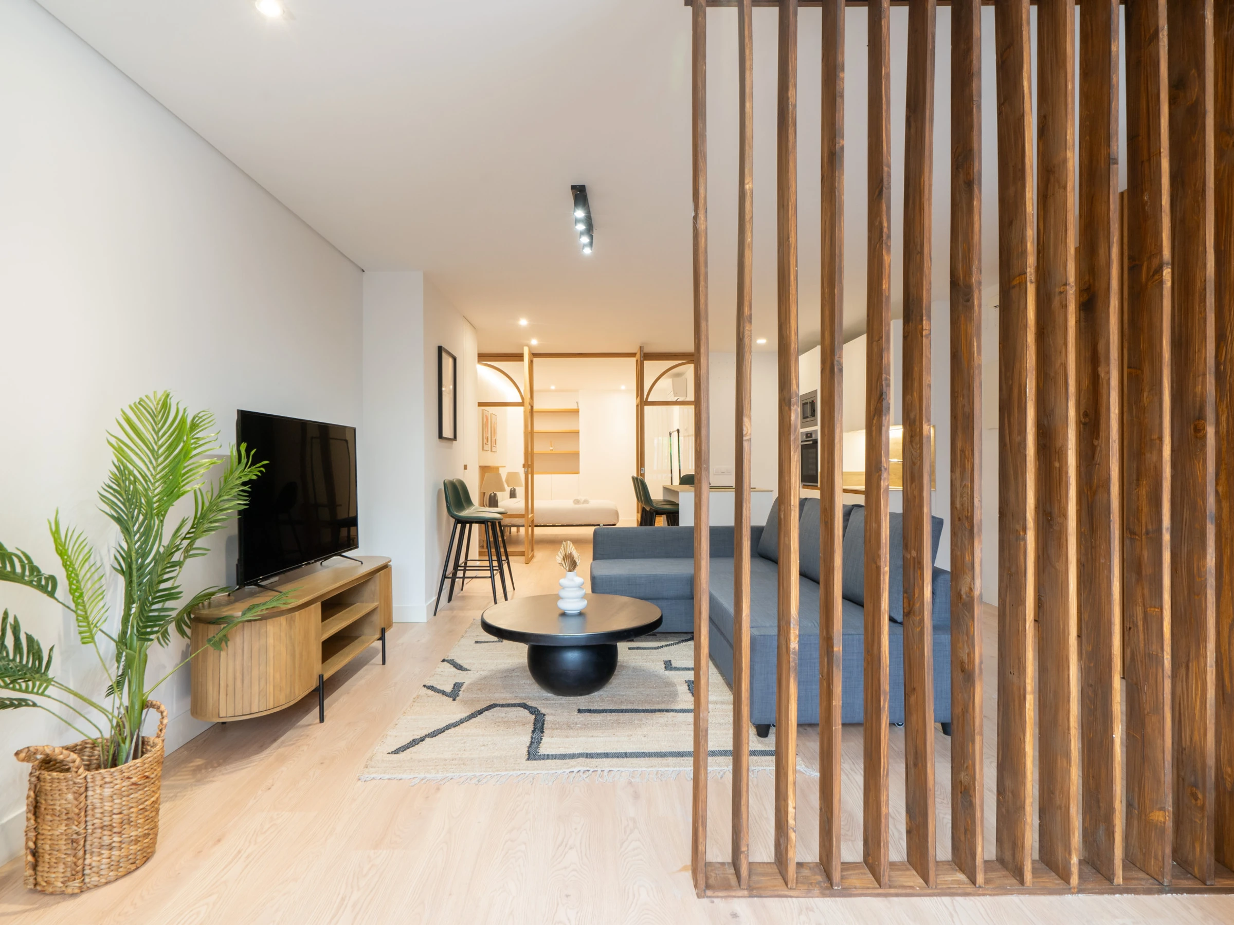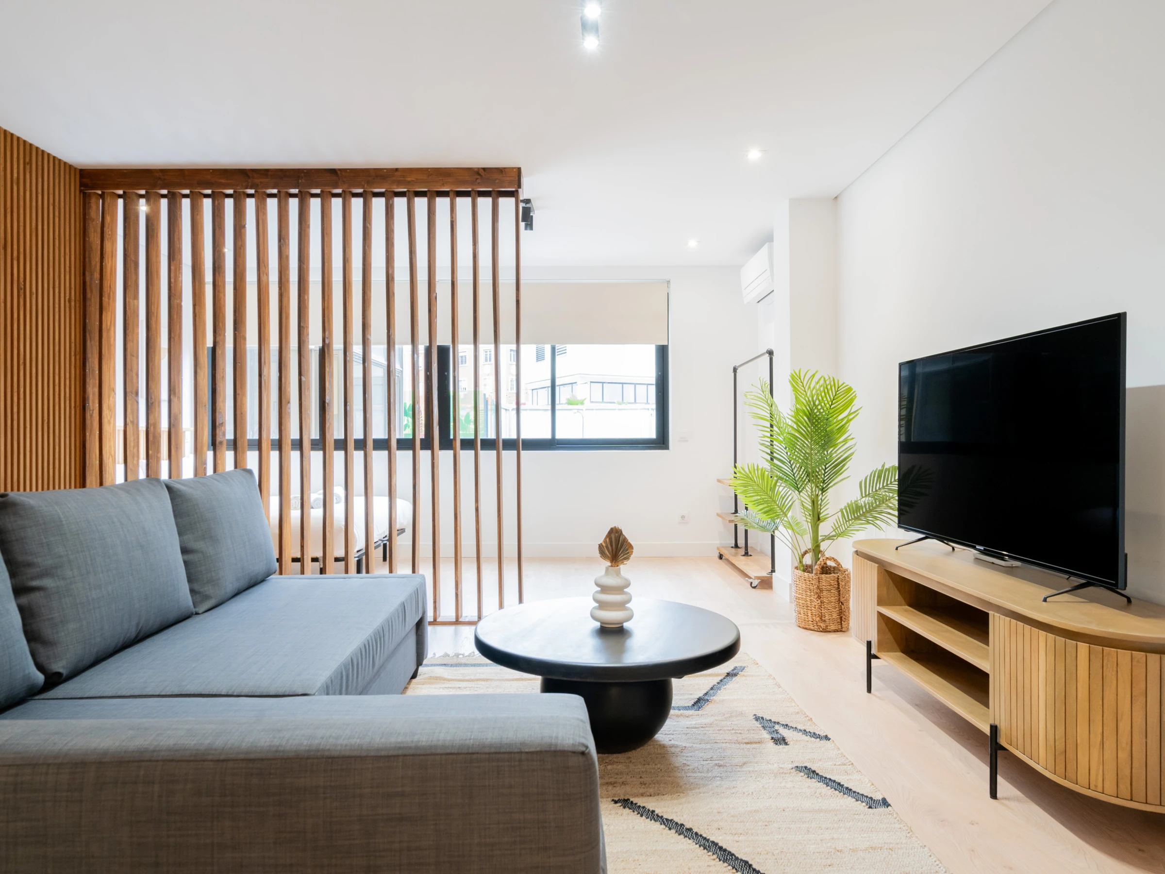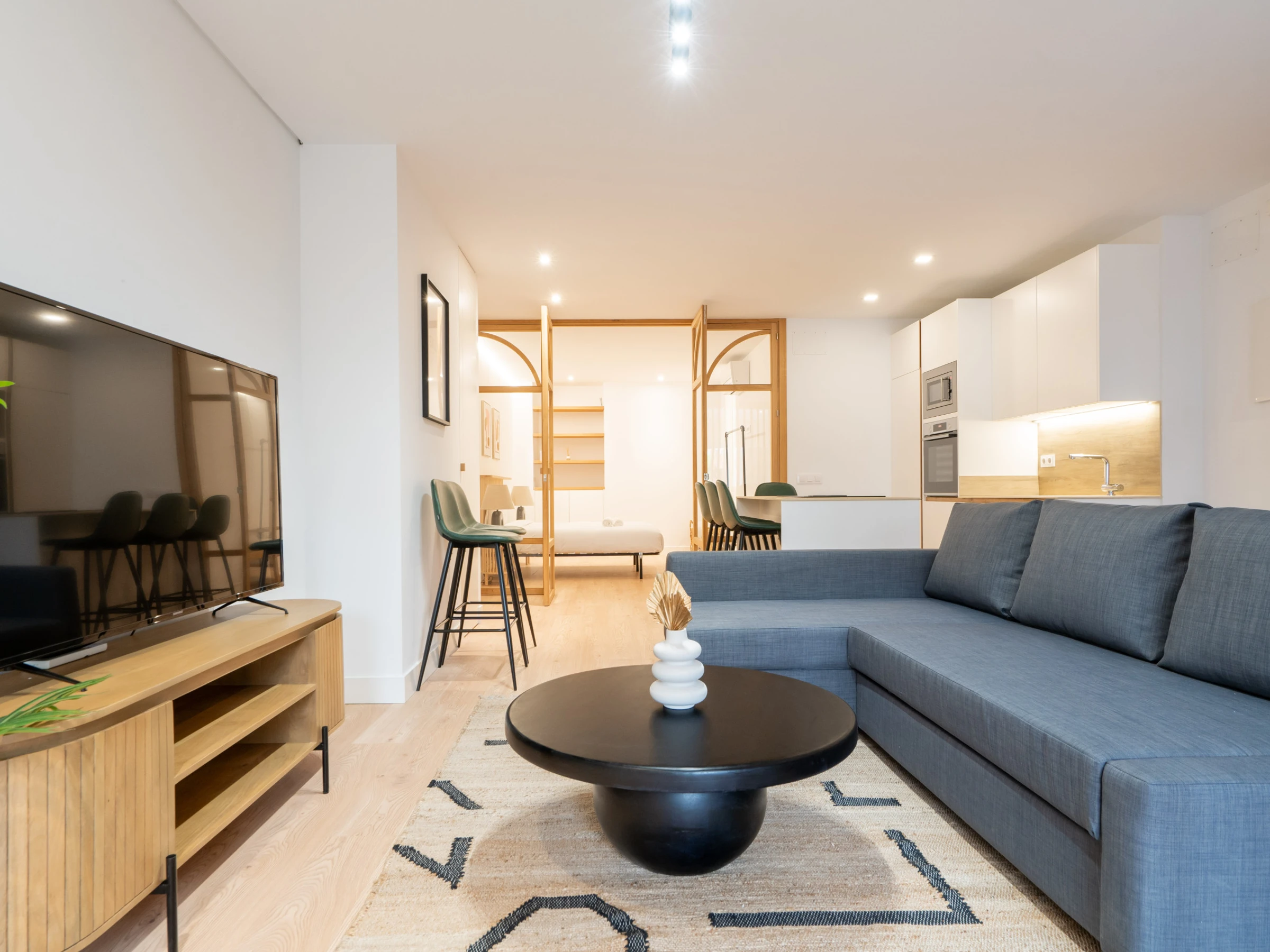 Spacious living room: The living room includes a double sofa bed, flat-screen TV, and a small dining area, creating a perfect space to relax and socialize.