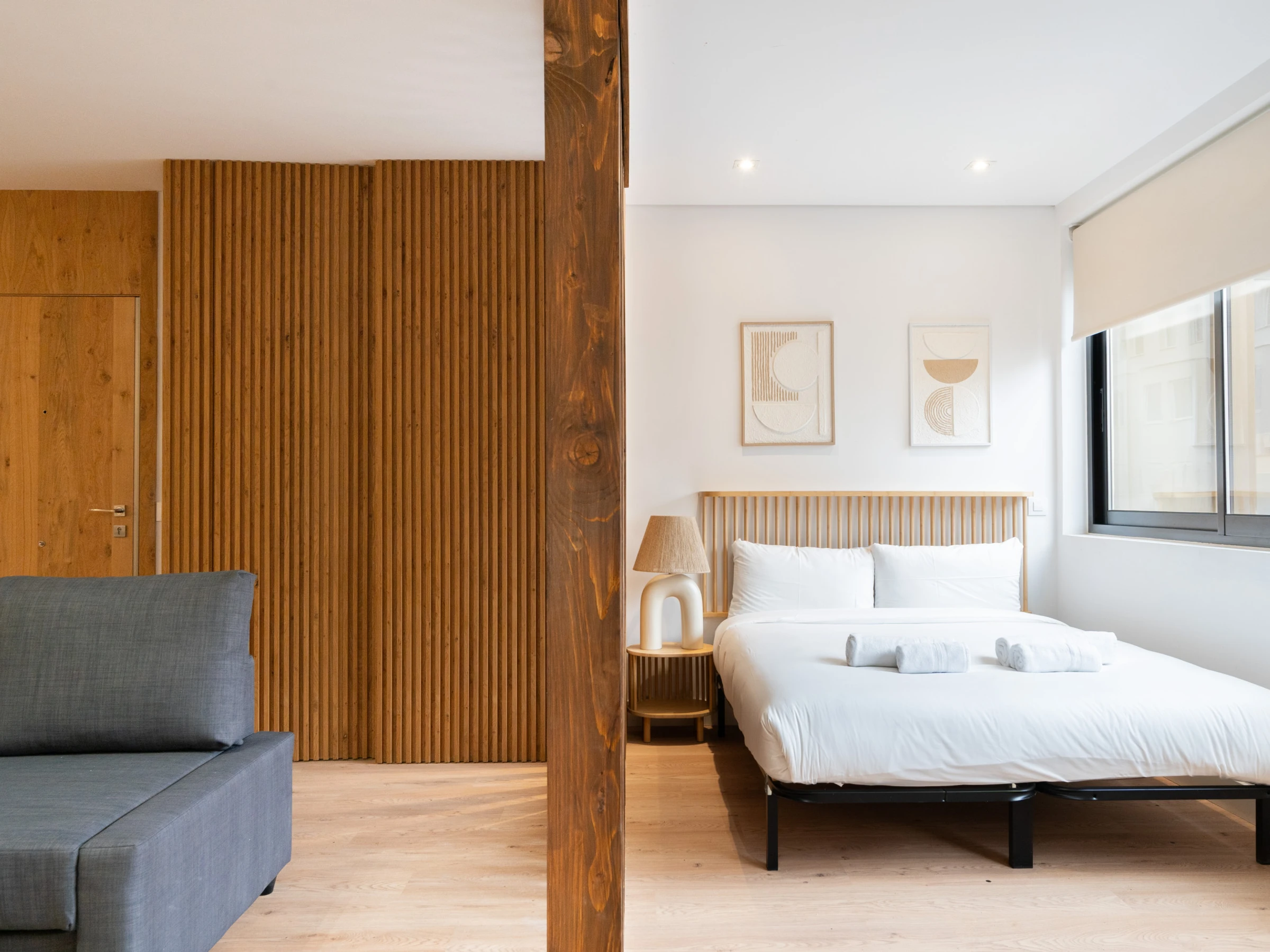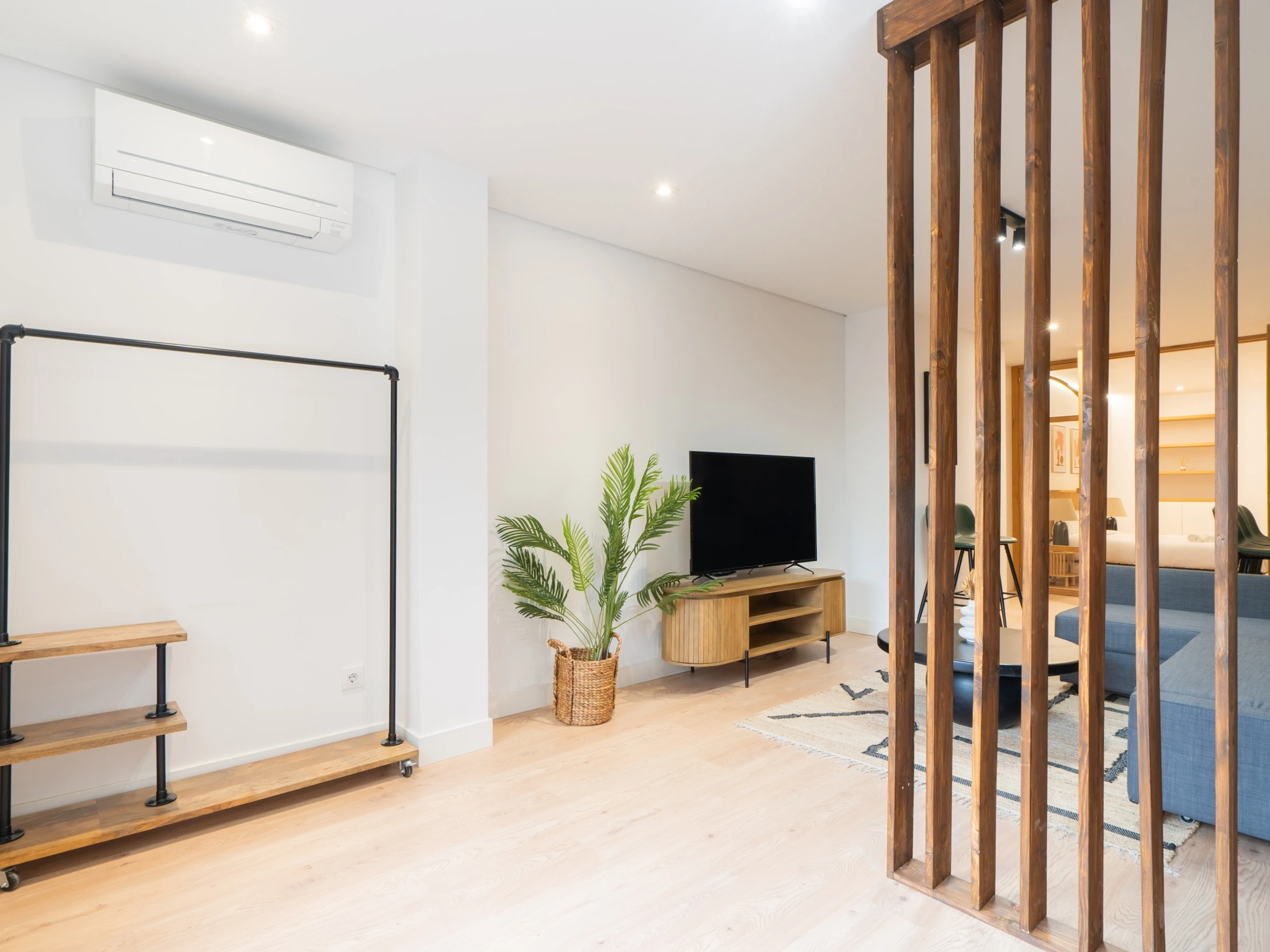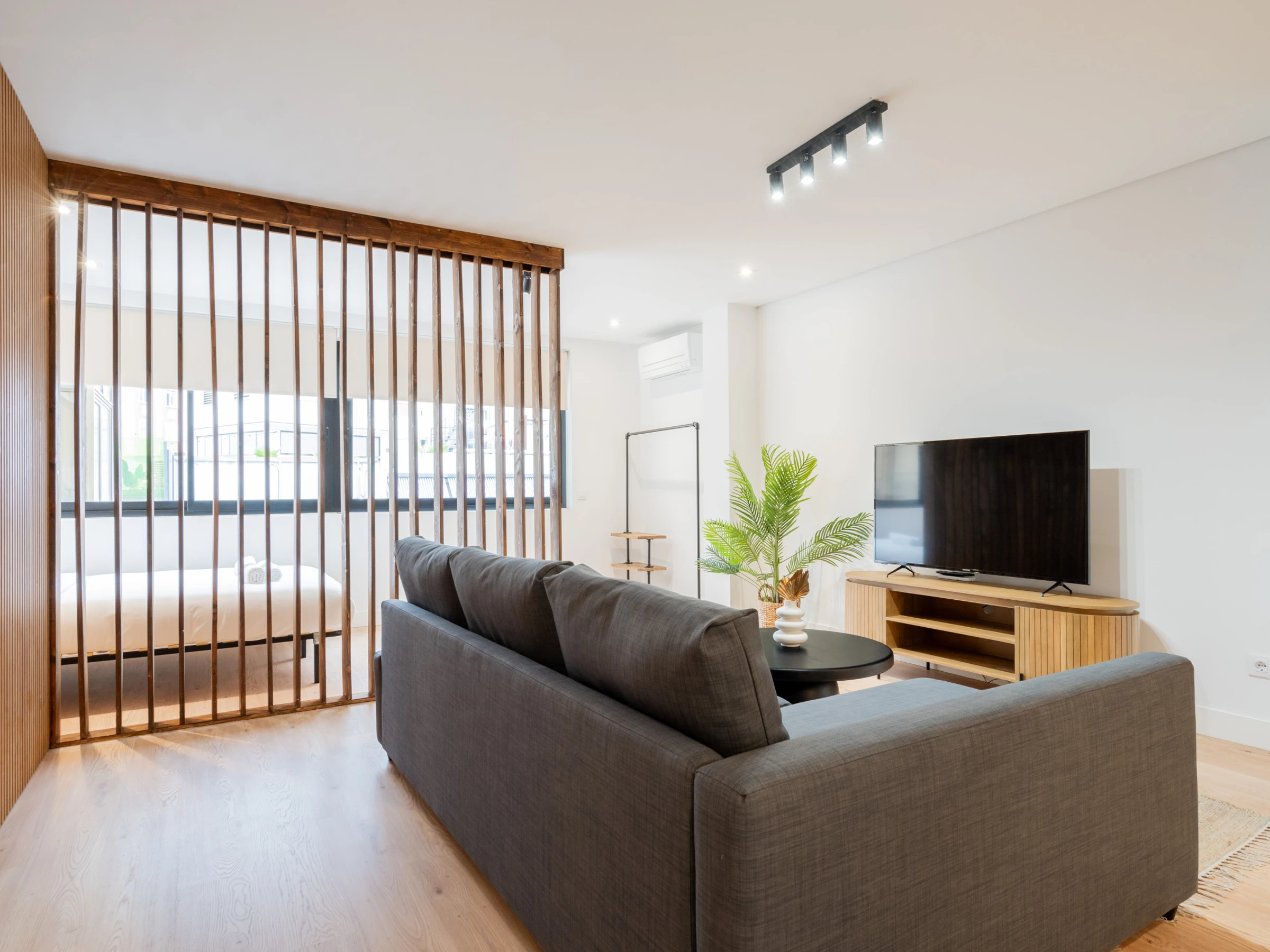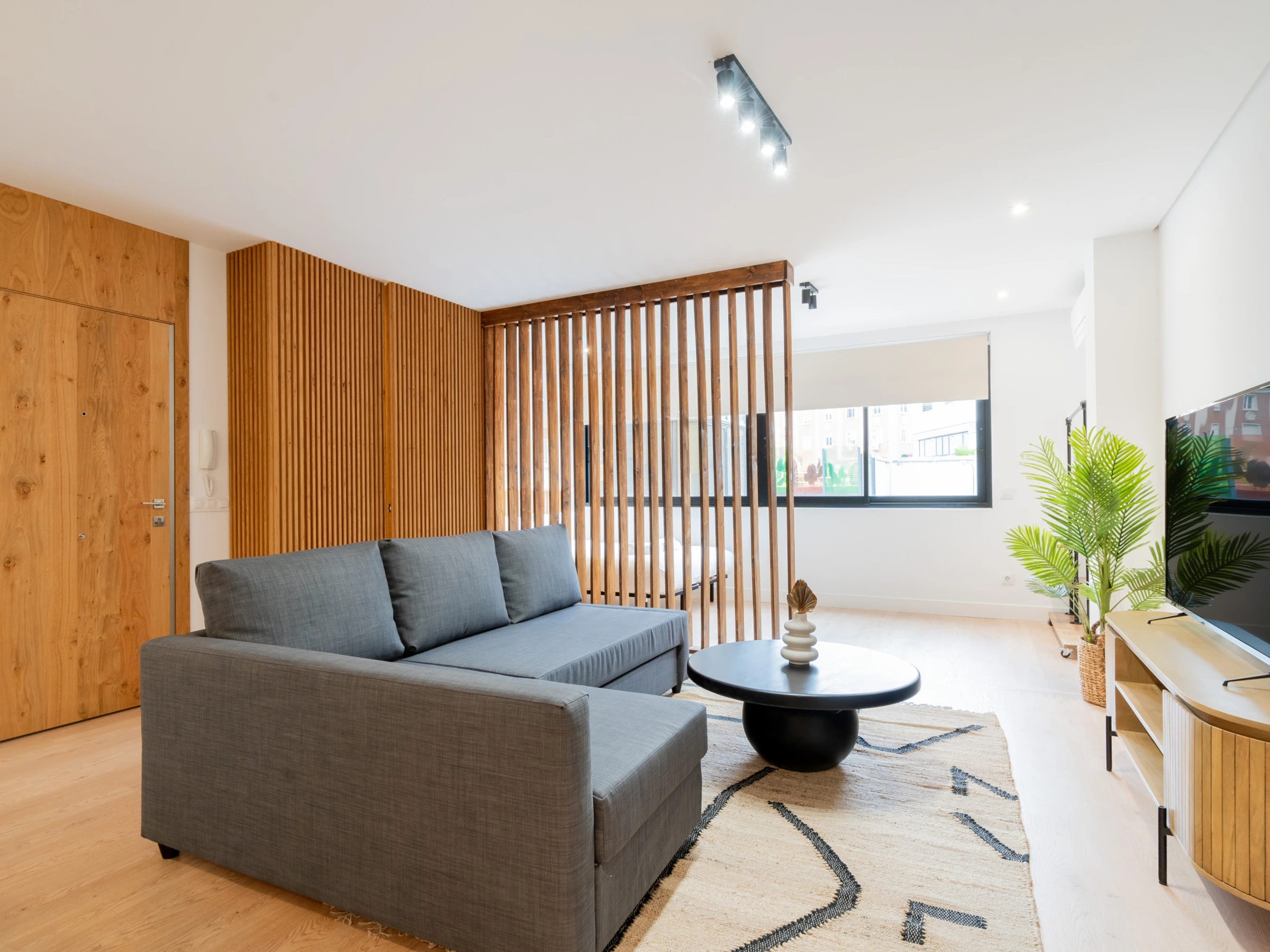 Spacious living room: The living room includes a double sofa bed, flat-screen TV, and a small dining area, creating a perfect space to relax and socialize.