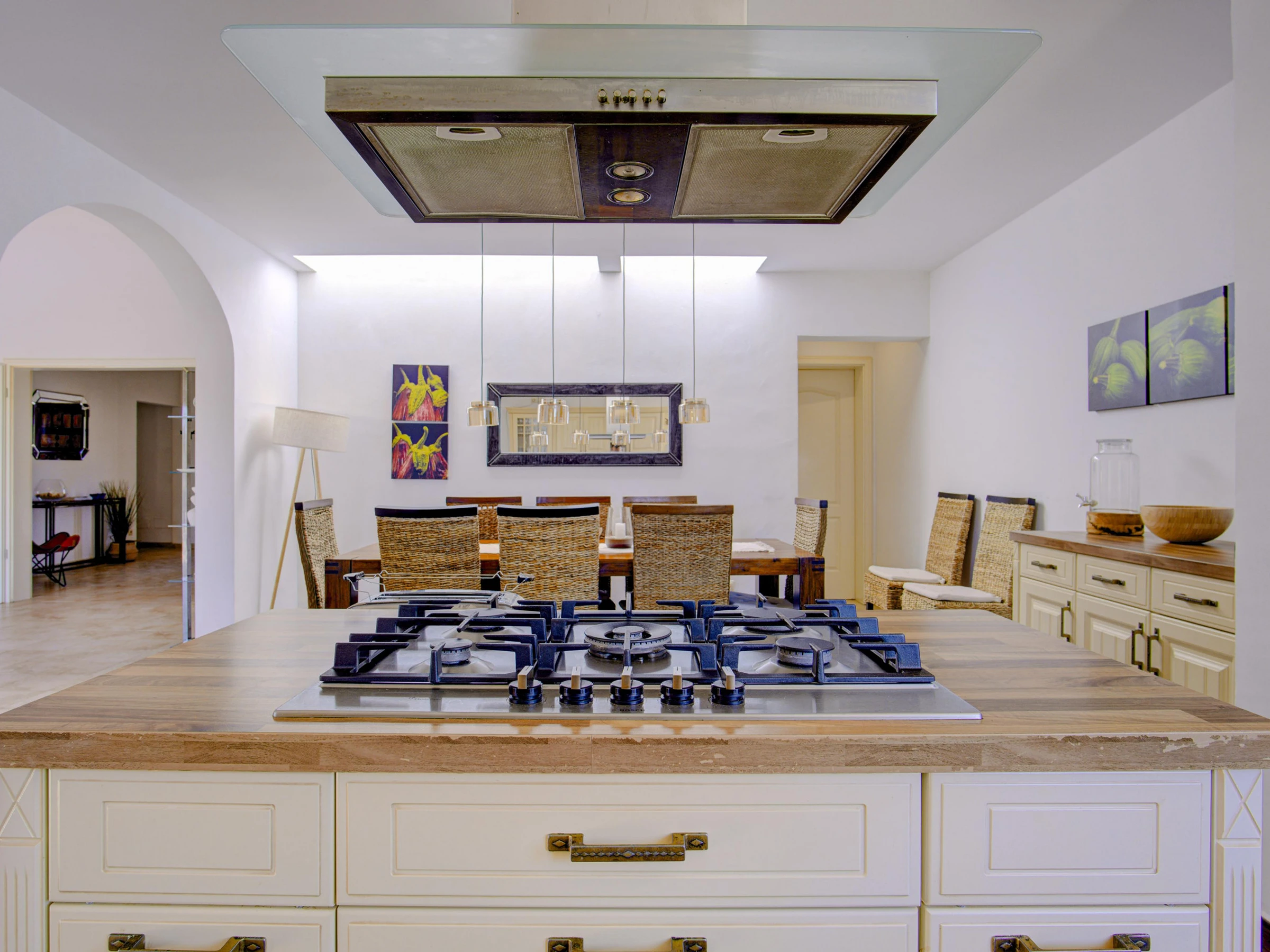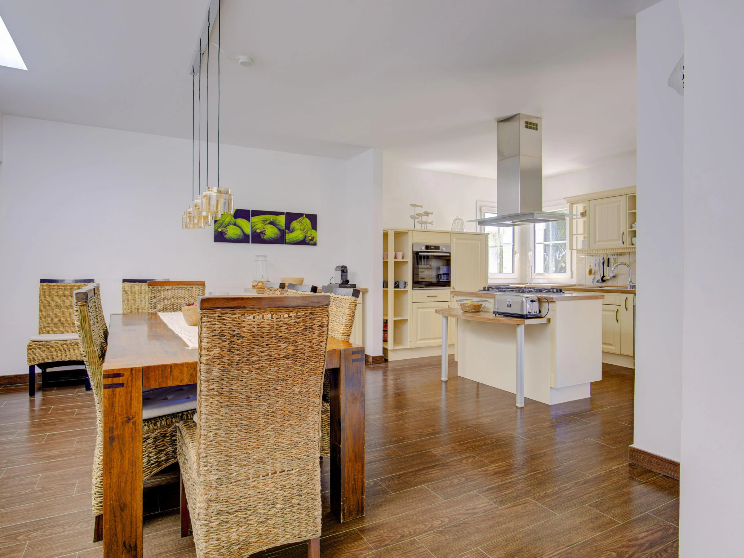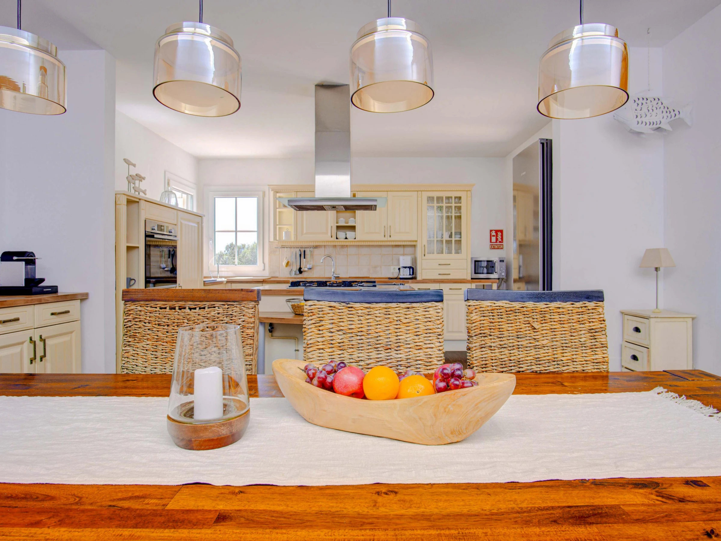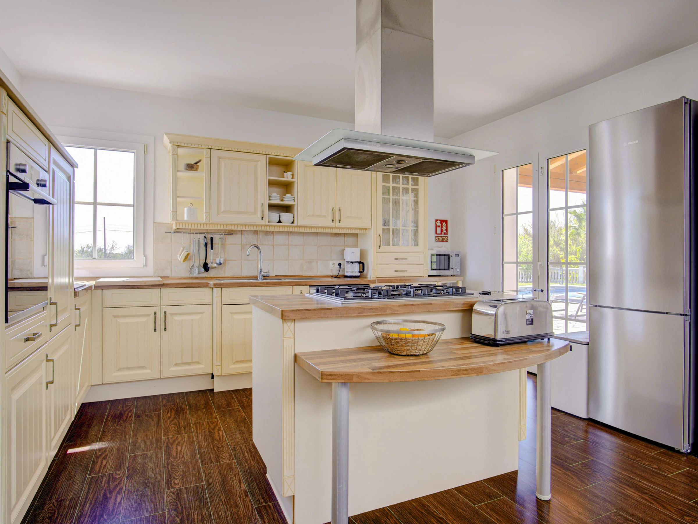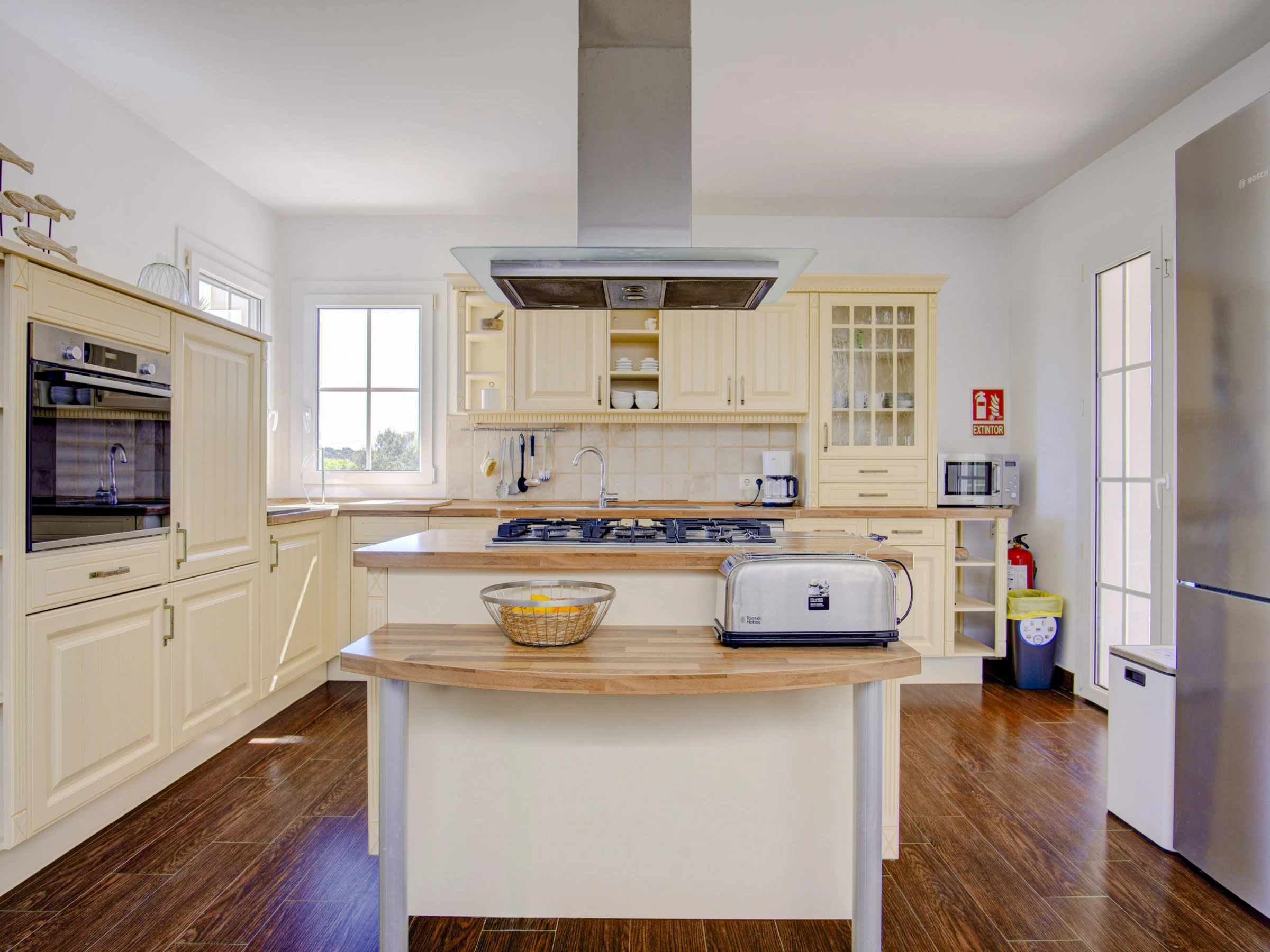 The single-story interior offers a comfortable and welcoming style. In the large living room you can watch satellite TV. It is connected to the eat-in kitchen through an archway and the kitchen has a gas cooktop. In the house there are 5 bedrooms, all with a double bed except one with twin beds. Three of them have an en suite bathroom with a shower and there is also another bathroom with a bathtub and a toilet. The separate laundry room is equipped with a washing machine, iron and ironing board. The equipment is completed by a cot, a high chair, and 3 fans.