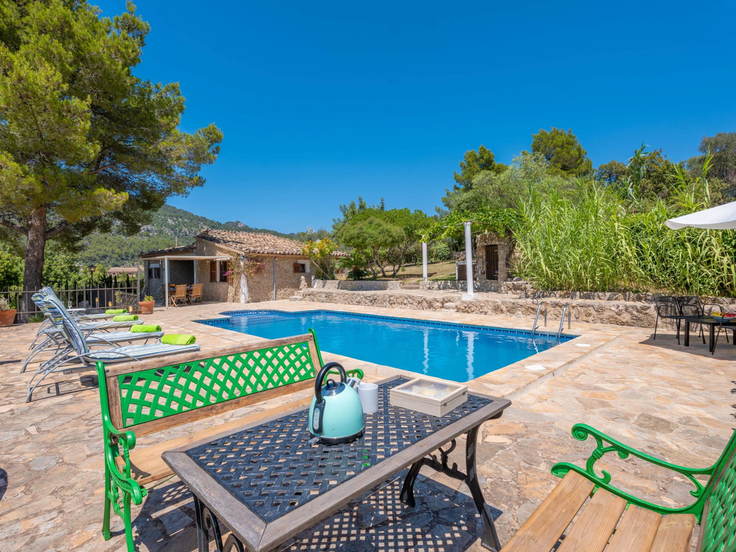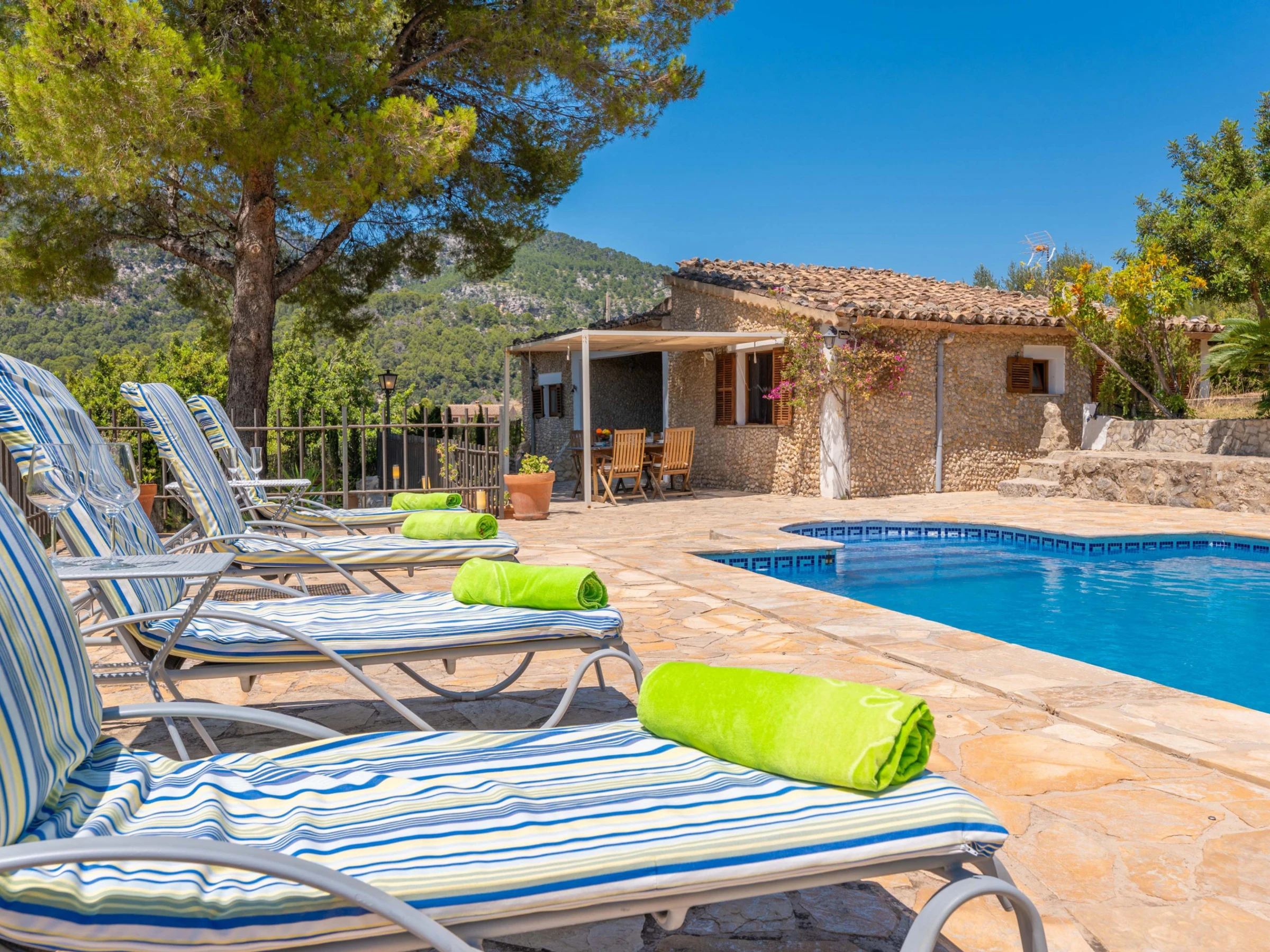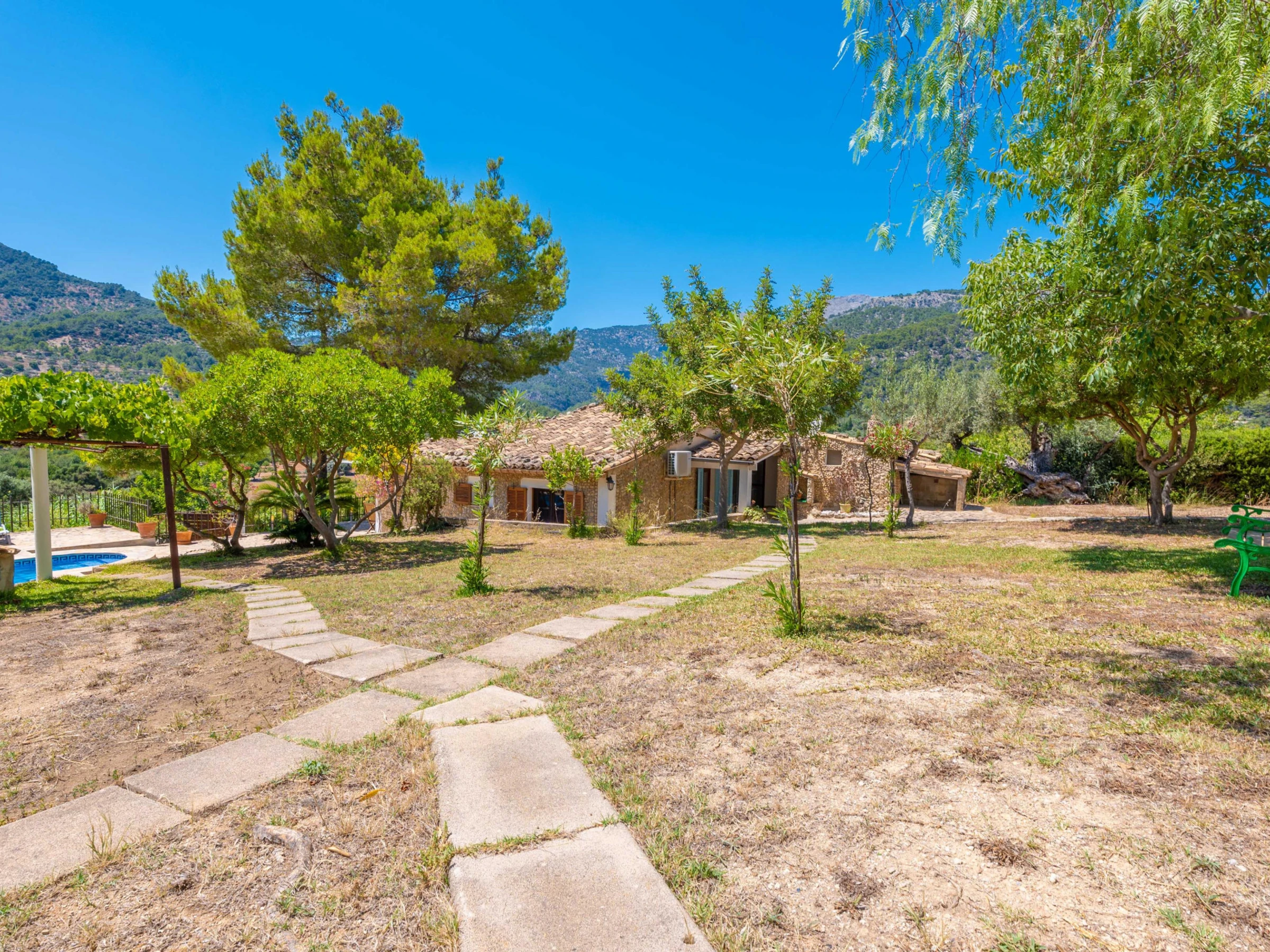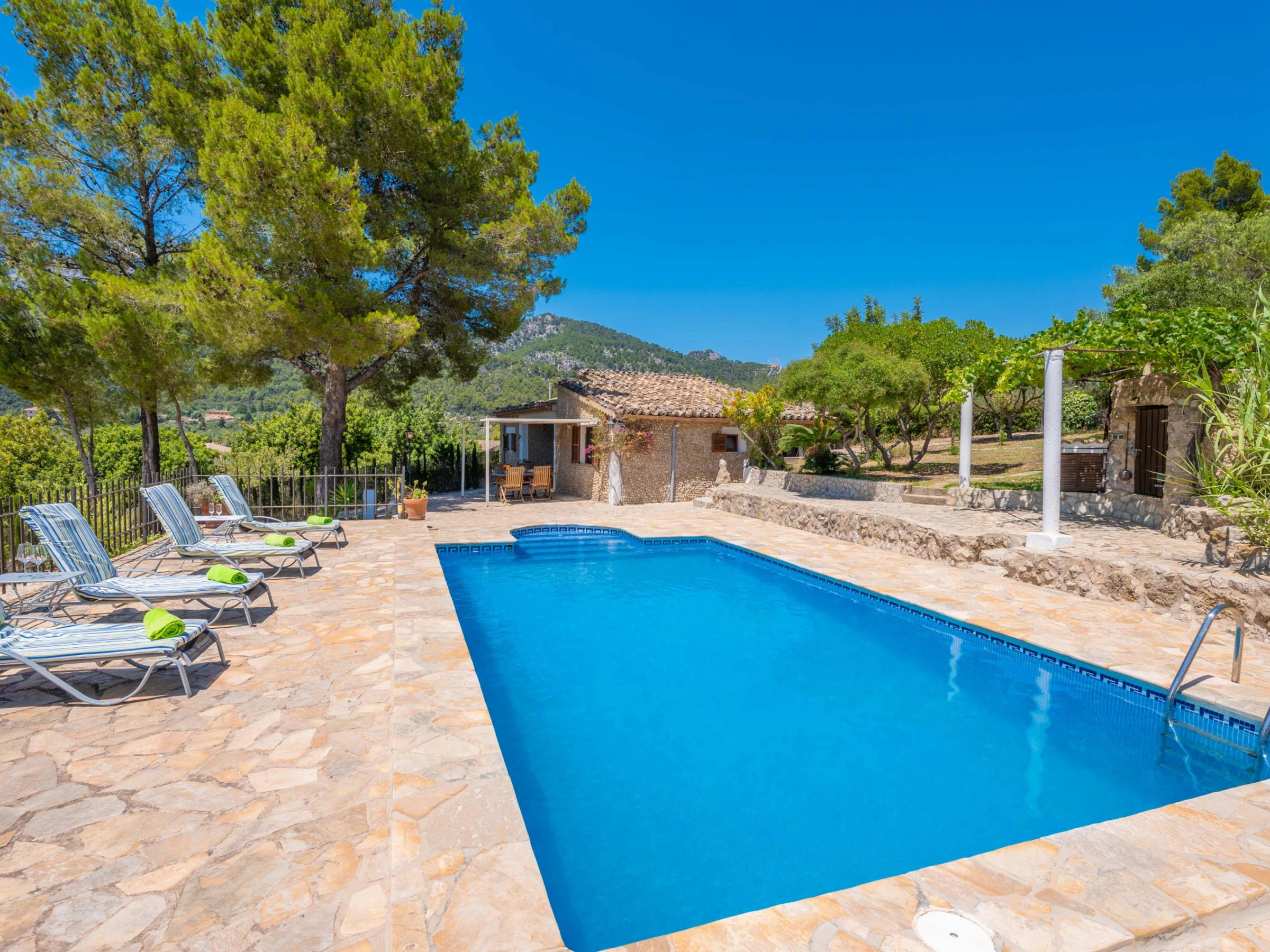In this house, at the foot of the Tramuntana mountain range, you are going to enjoy an authentic vacation of peace and calm. Outside, enjoy the surroundings and the wonderful views after a refreshing dip in the beautiful salt pool. It sizes 8x4 meters and its depth goes from 0.8 to 1.8 meters. The place is ideal to sunbathe on one of the sunbeds while listening to the chirping birds or having a drink on one of the several tables outdoors. The area provides rest and relax from the everyday life in the middle of an extraordinary setting. It features also a barbecue to prepare delicious grilled meats and vegetables and a playing ground area where the little ones will spend funny moments. There's an exterior bath with bathtub. The property is fenced and privacy is total.