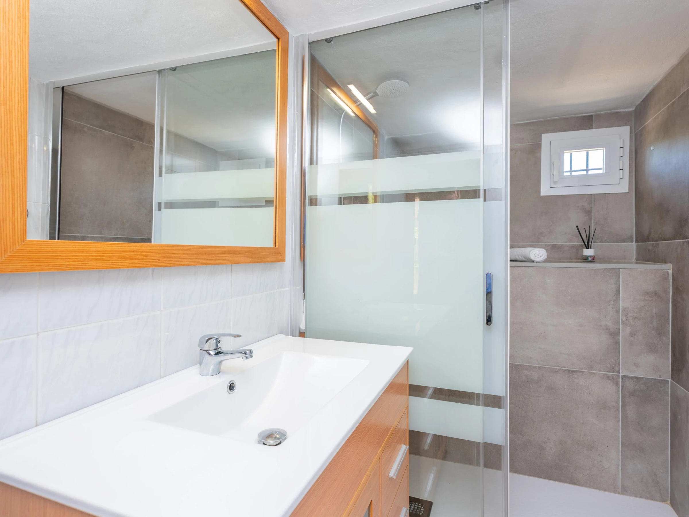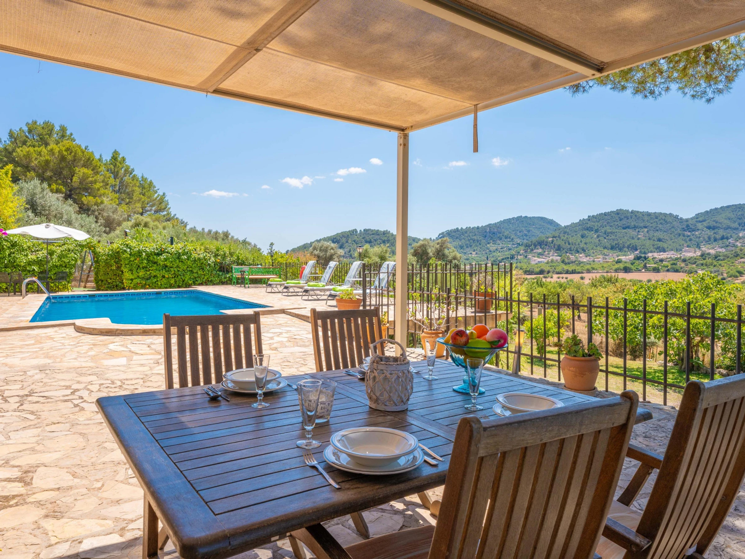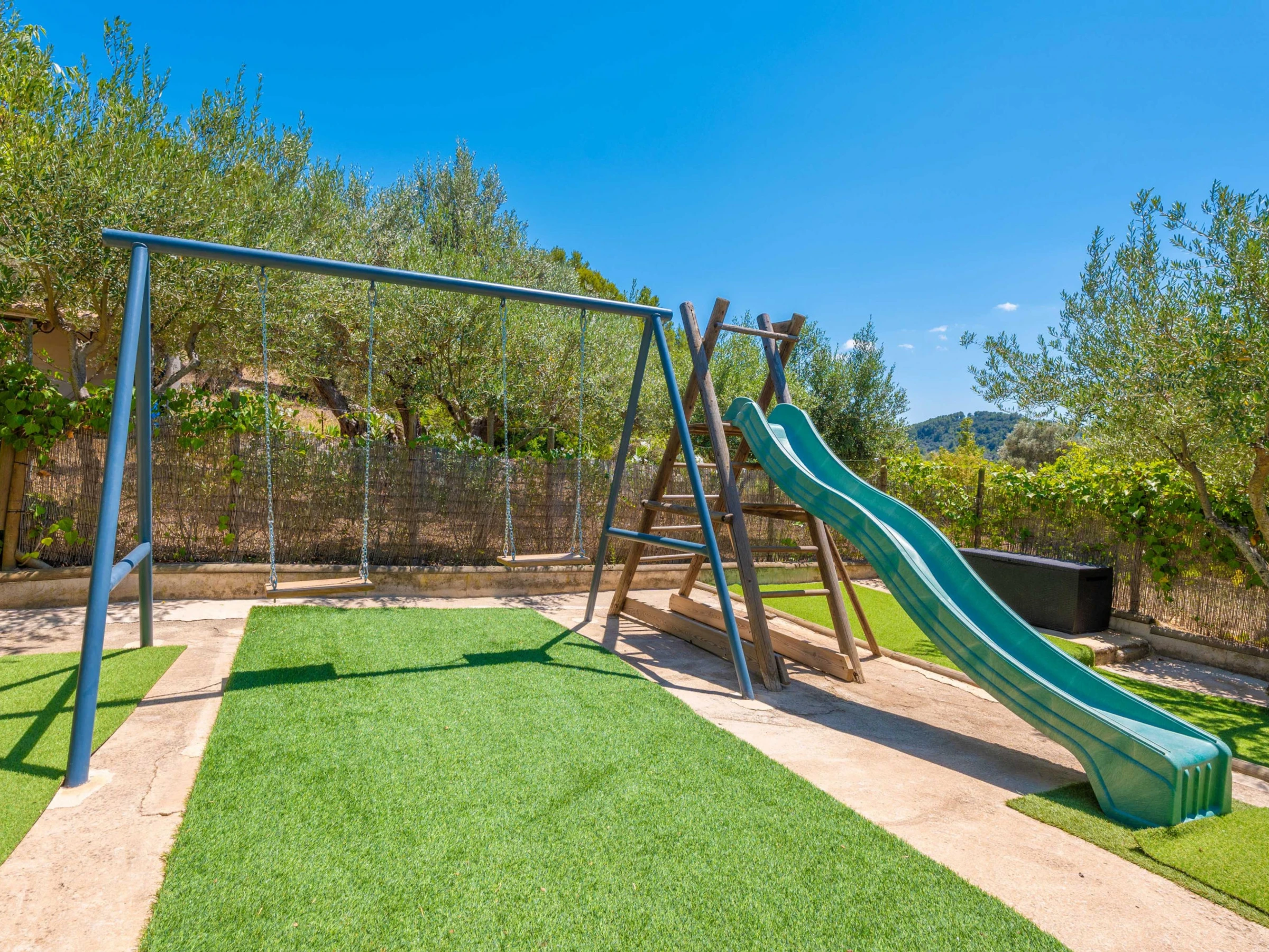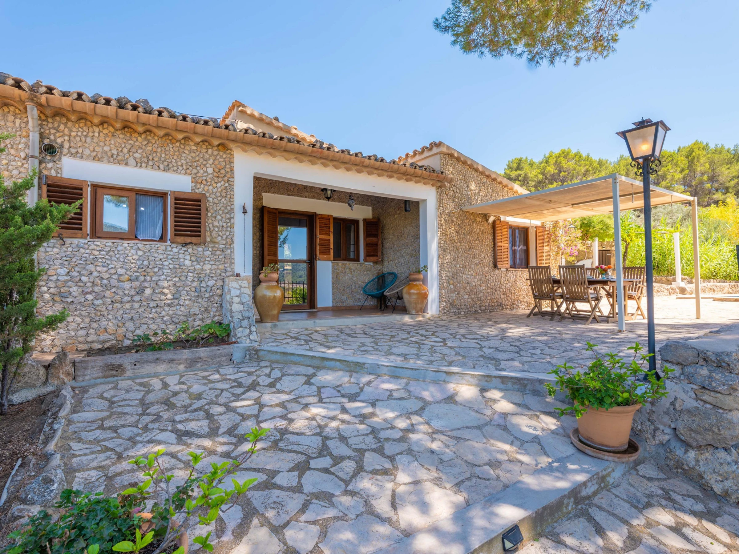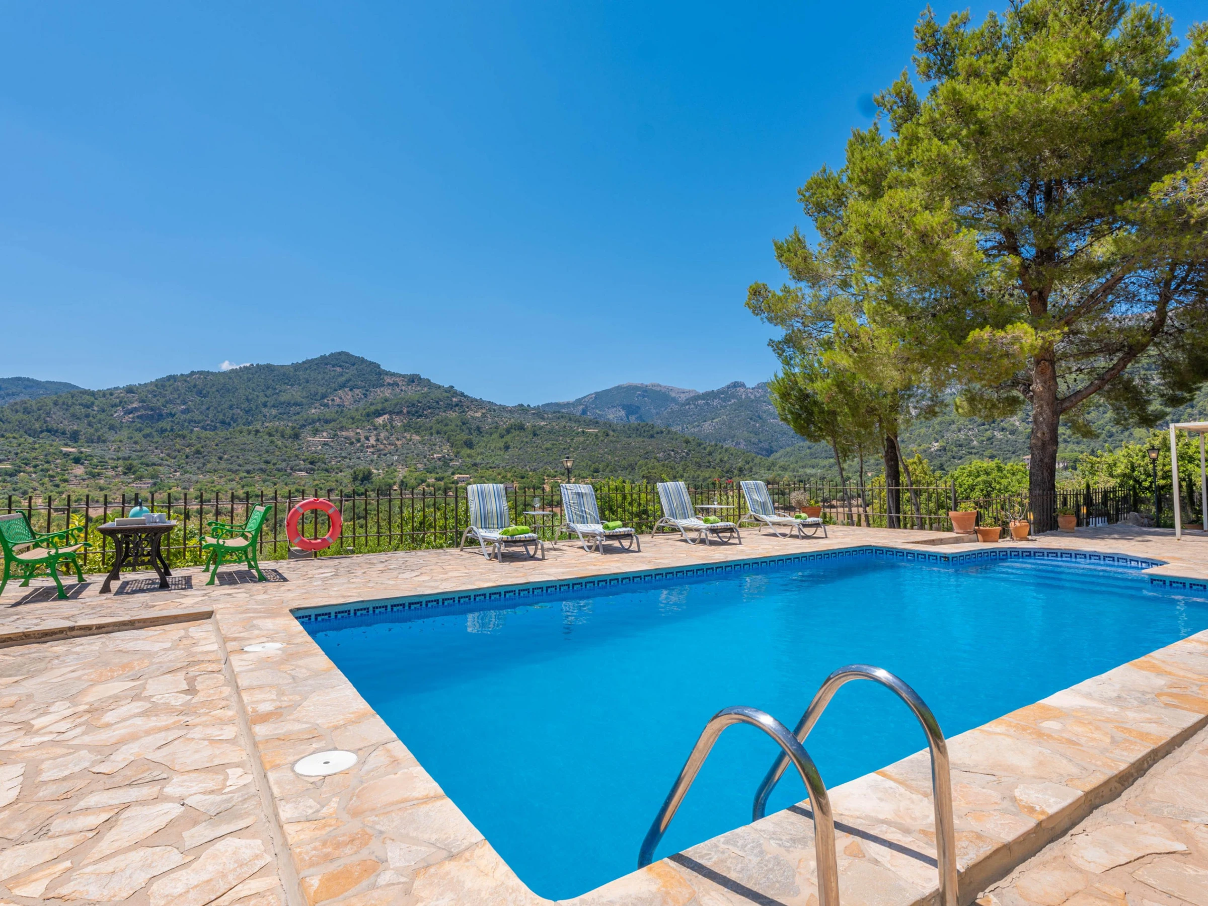In this house, at the foot of the Tramuntana mountain range, you are going to enjoy an authentic vacation of peace and calm. Outside, enjoy the surroundings and the wonderful views after a refreshing dip in the beautiful salt pool. It sizes 8x4 meters and its depth goes from 0.8 to 1.8 meters. The place is ideal to sunbathe on one of the sunbeds while listening to the chirping birds or having a drink on one of the several tables outdoors. The area provides rest and relax from the everyday life in the middle of an extraordinary setting. It features also a barbecue to prepare delicious grilled meats and vegetables and a playing ground area where the little ones will spend funny moments. There's an exterior bath with bathtub. The property is fenced and privacy is total.