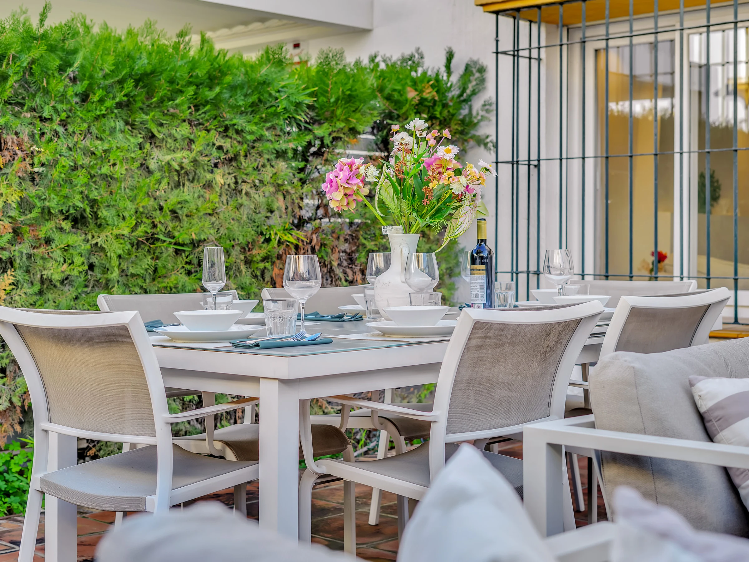 The townhouse has been beautifully refurbished to blend timeless style with modern luxury. The fully equipped kitchen includes every convenience—right down to a Nespresso machine—while the elegant living and dining areas open through French doors to a private west-facing terrace, complete with an outdoor dining area and comfortable lounge seating. For morning sunshine, an additional east-facing patio with a utility area sits just off the kitchen—perfect for a peaceful breakfast with a sea breeze.