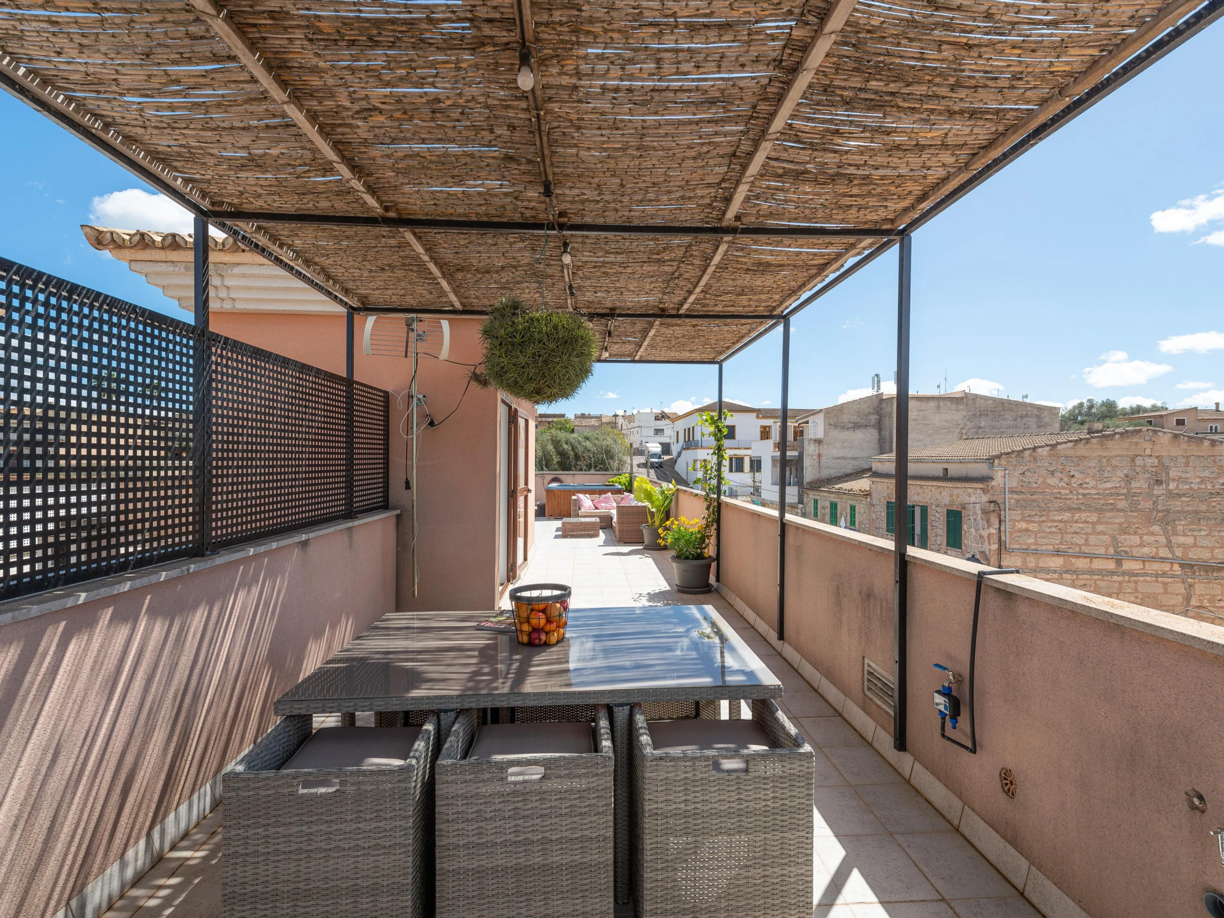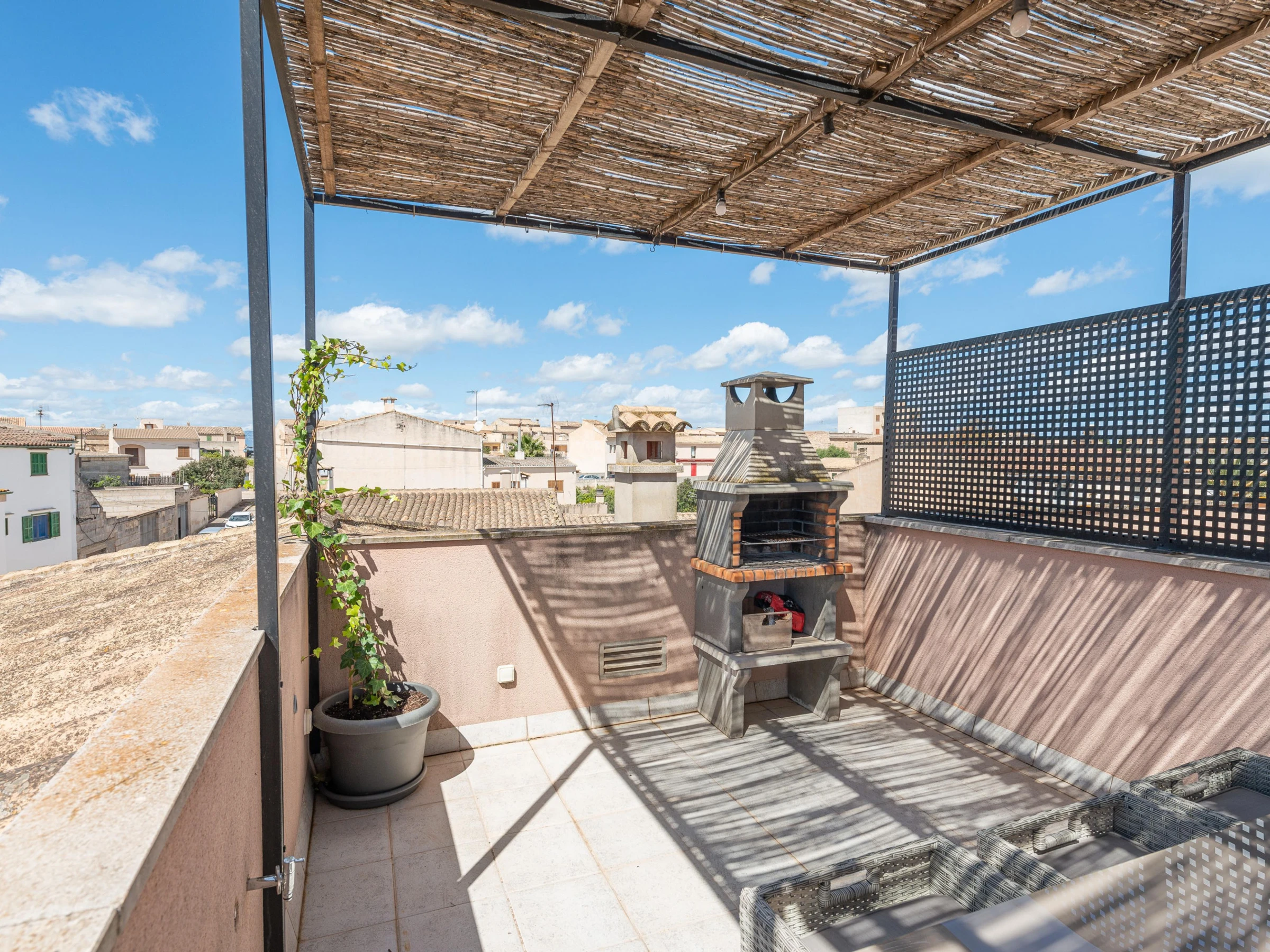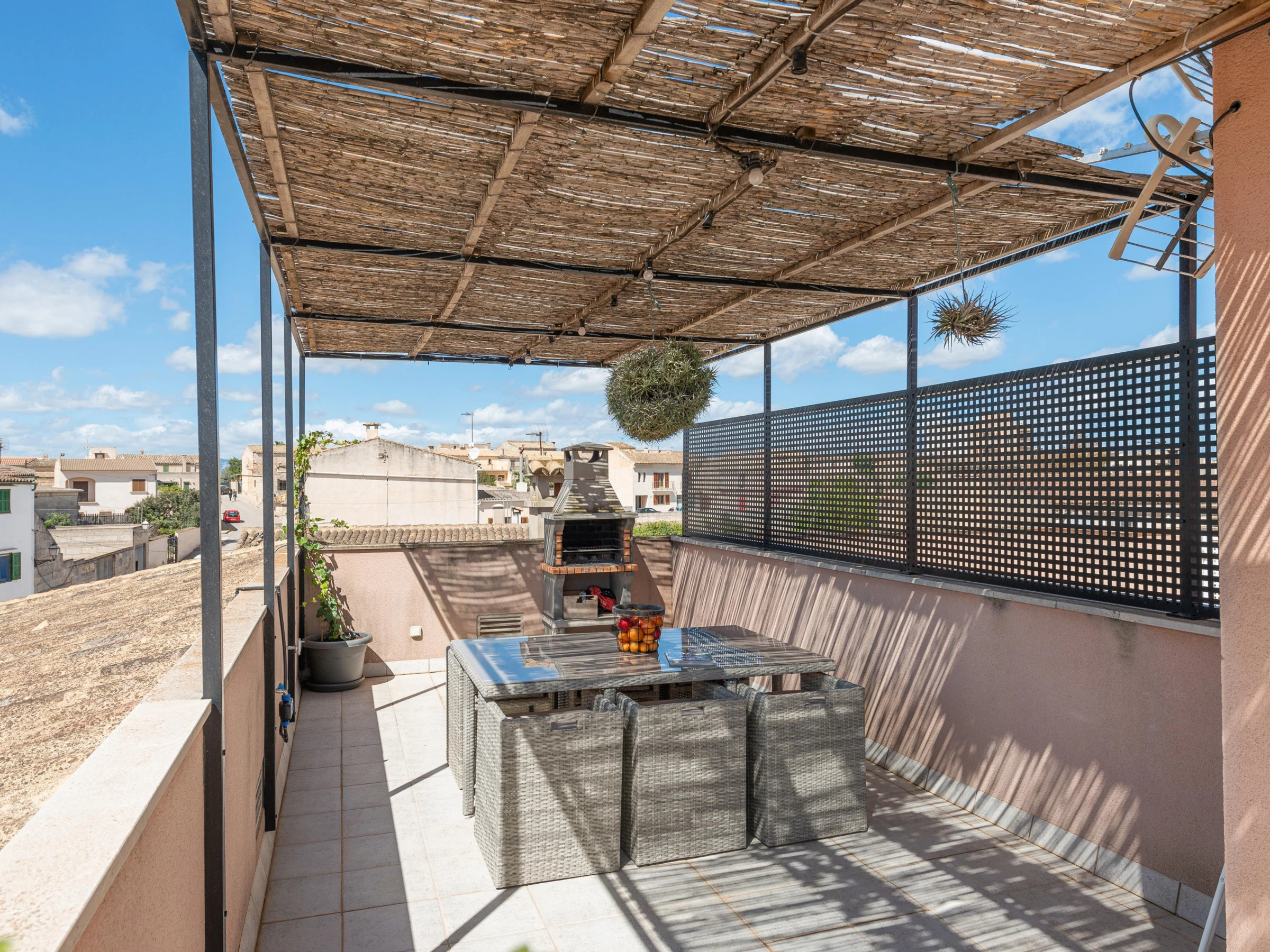 This charming village house stands out for its beautiful exterior design, which includes a patio, a balcony, and a terrace. On the ground floor, the cozy patio features a chlorine pool measuring 6 meters in length and 3.4 meters in width, with a depth ranging from 0.90 to 1.65 meters. Equipped with sun loungers, a refreshing outdoor shower, and a practical barbecue, the patio is perfect for relaxing and enjoying the sun. There is also an upper terrace that provides an idyllic spot to unwind and take in the panoramic views.