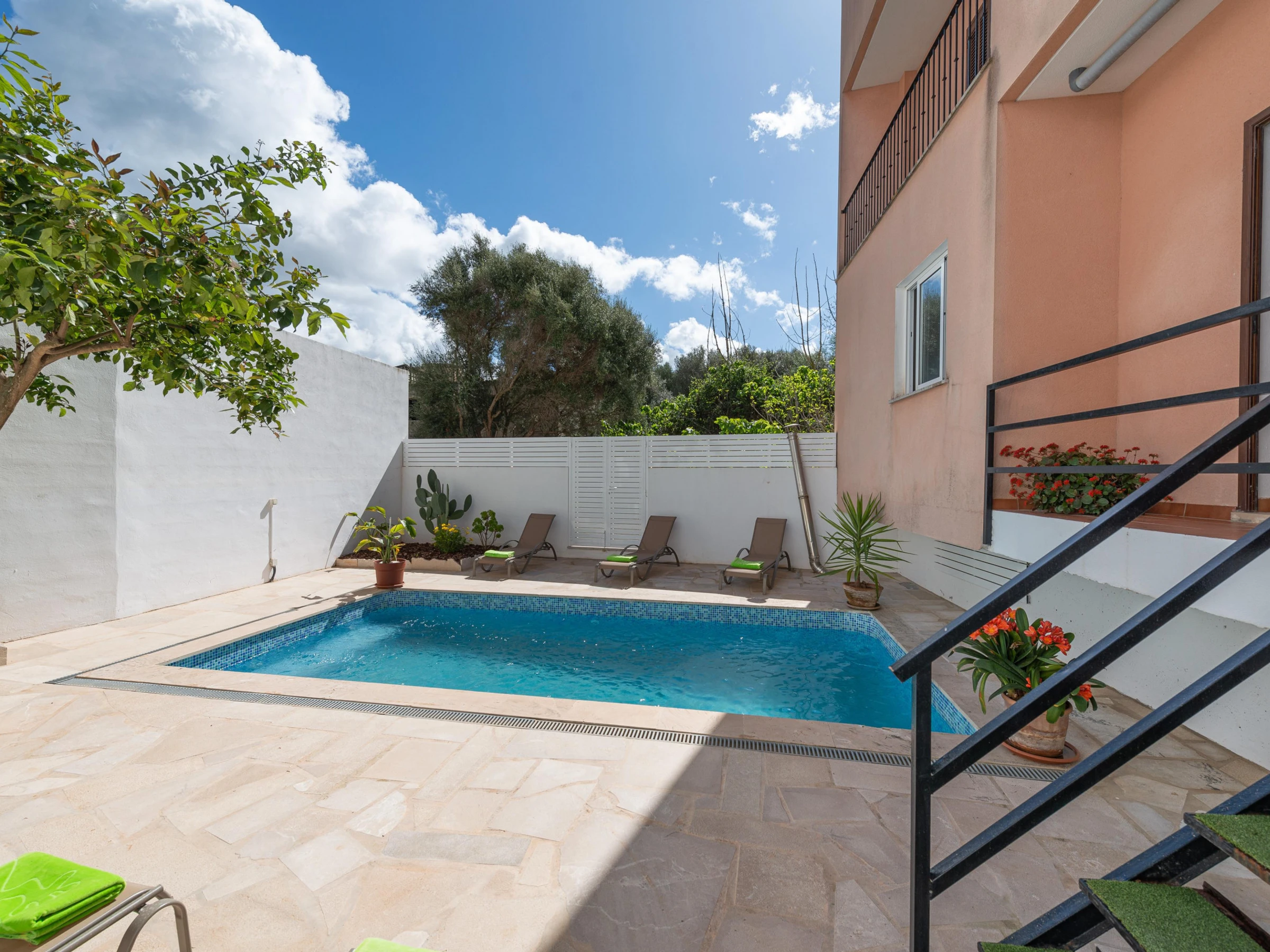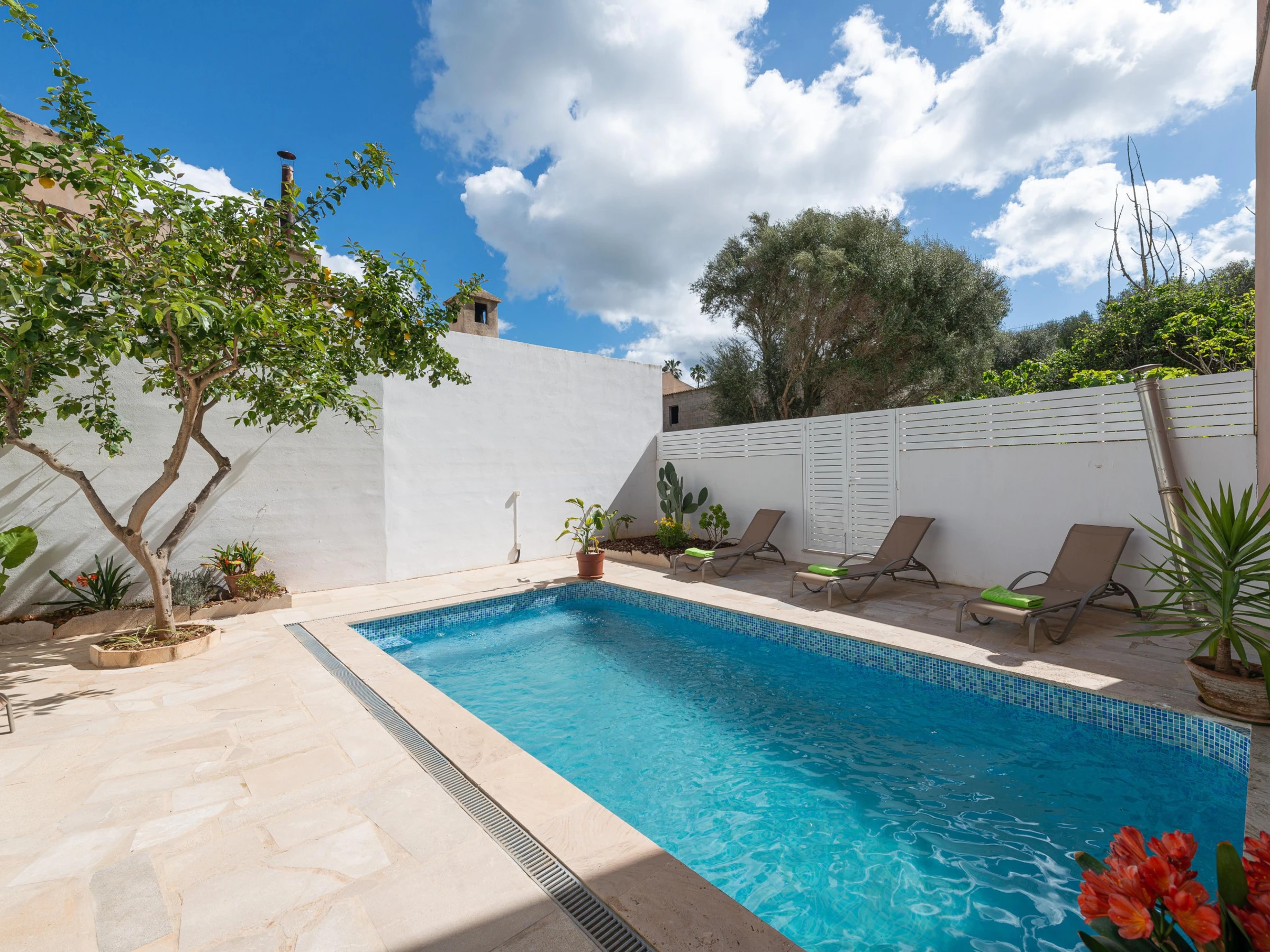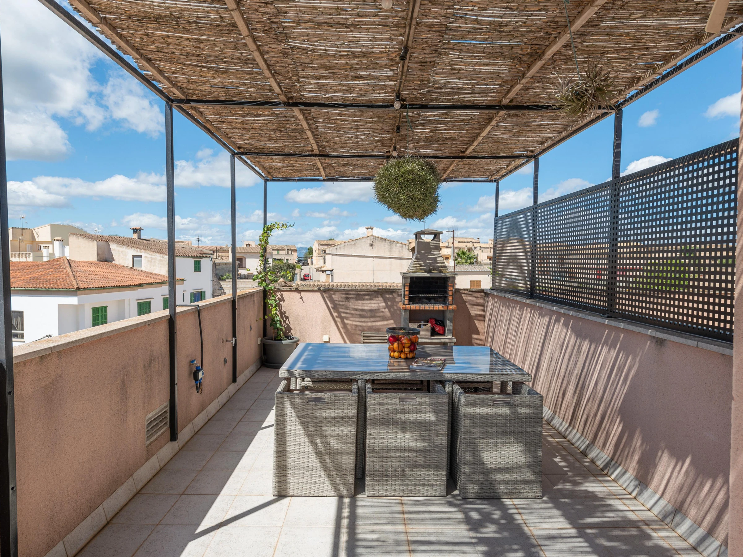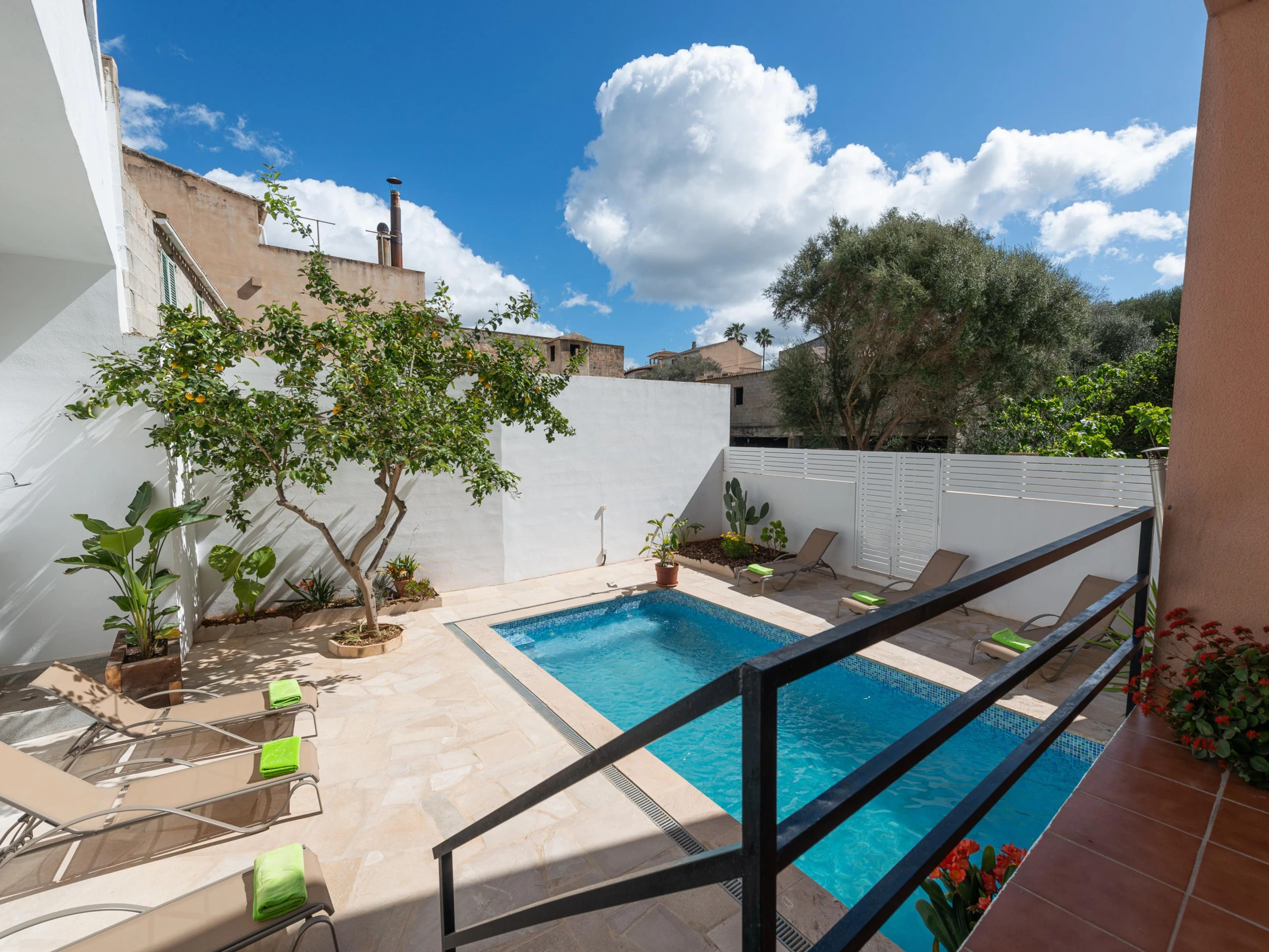 This charming village house stands out for its beautiful exterior design, which includes a patio, a balcony, and a terrace. On the ground floor, the cozy patio features a chlorine pool measuring 6 meters in length and 3.4 meters in width, with a depth ranging from 0.90 to 1.65 meters. Equipped with sun loungers, a refreshing outdoor shower, and a practical barbecue, the patio is perfect for relaxing and enjoying the sun. There is also an upper terrace that provides an idyllic spot to unwind and take in the panoramic views.