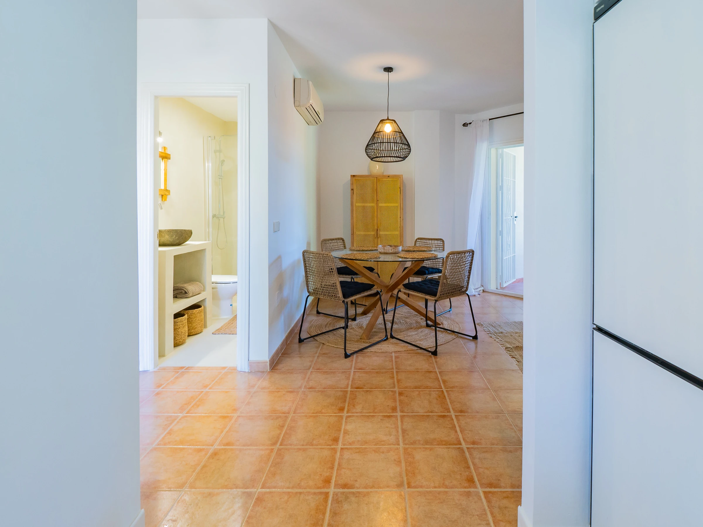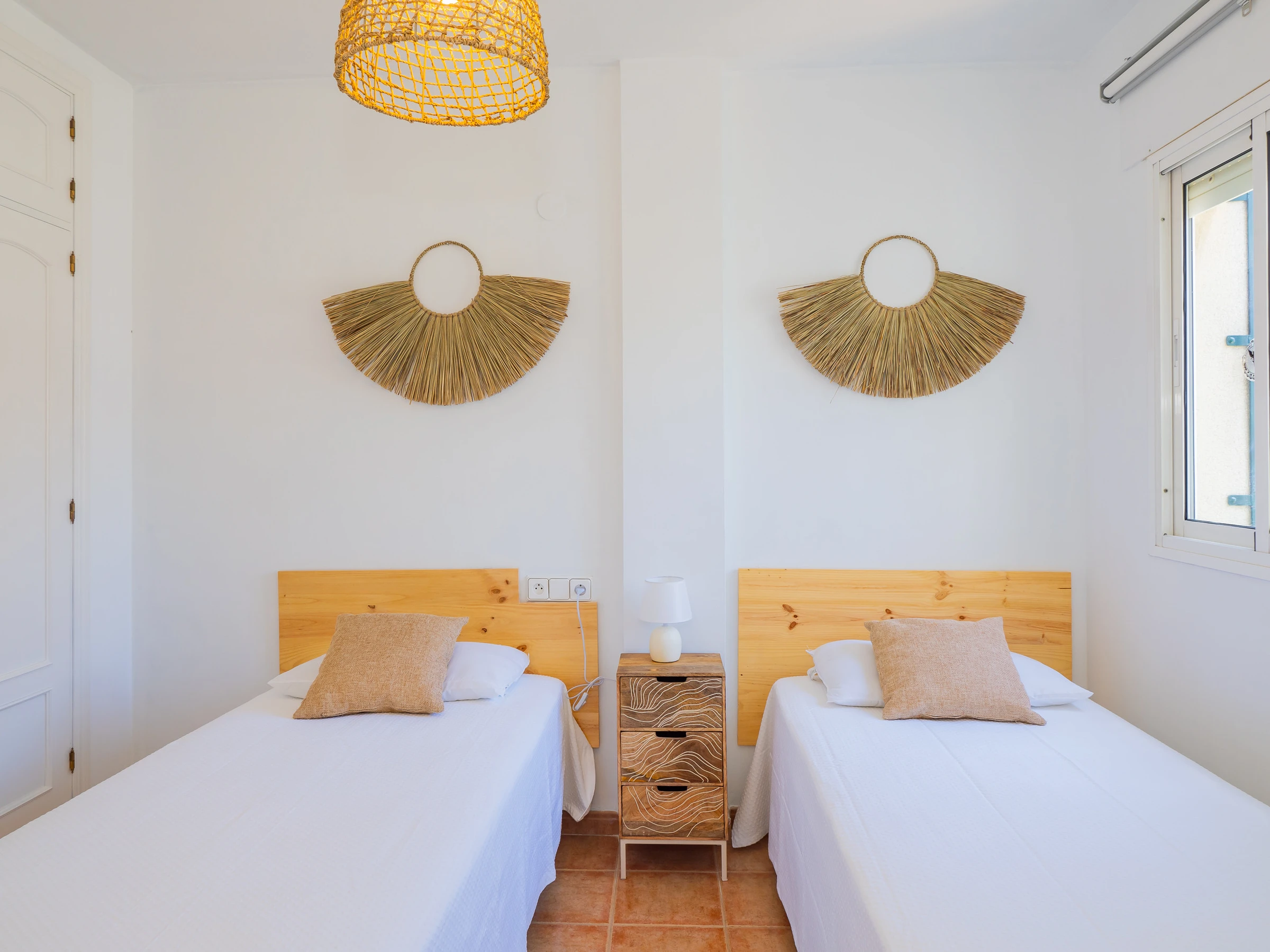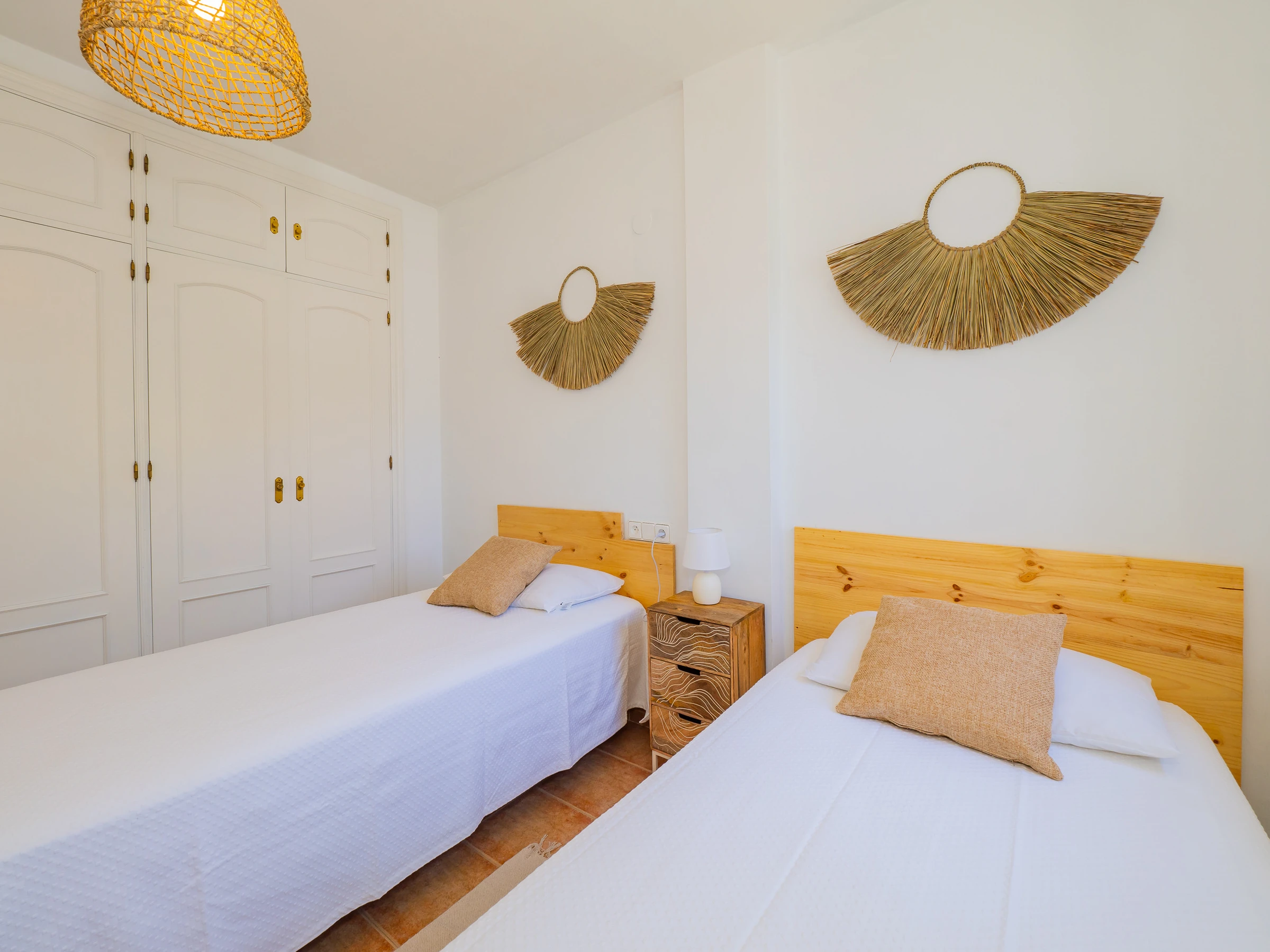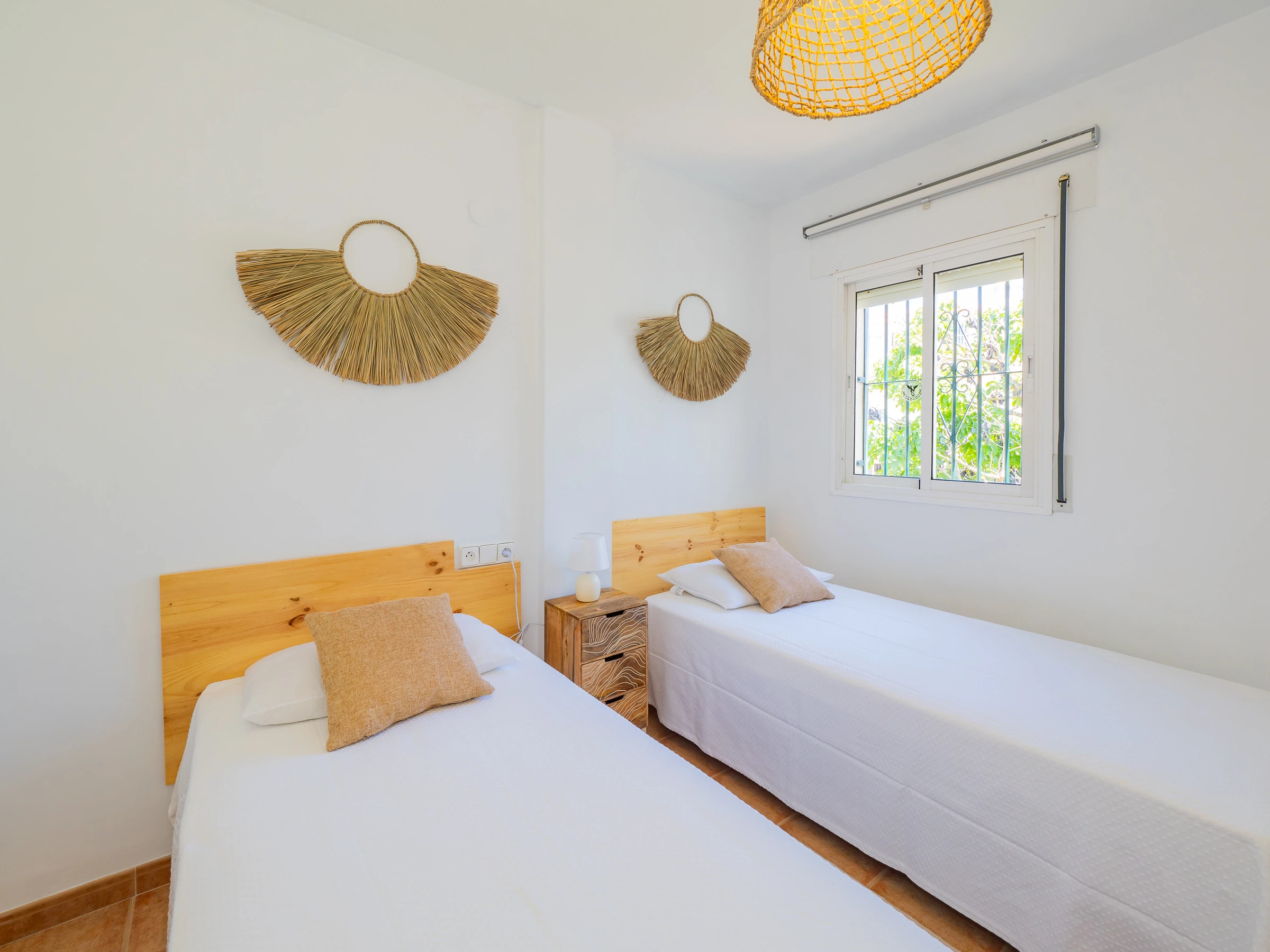 On the upper floor, two air-conditioned bedrooms with centralised air conditioning offer a cosy space for rest. One has a double bed, access to an external terrace and a wardrobe, while the other has two single beds and also a wardrobe. A bathroom with a shower tray serves this floor. The modern and practical decoration ensures a comfortable stay for all. 🛏️🌬️