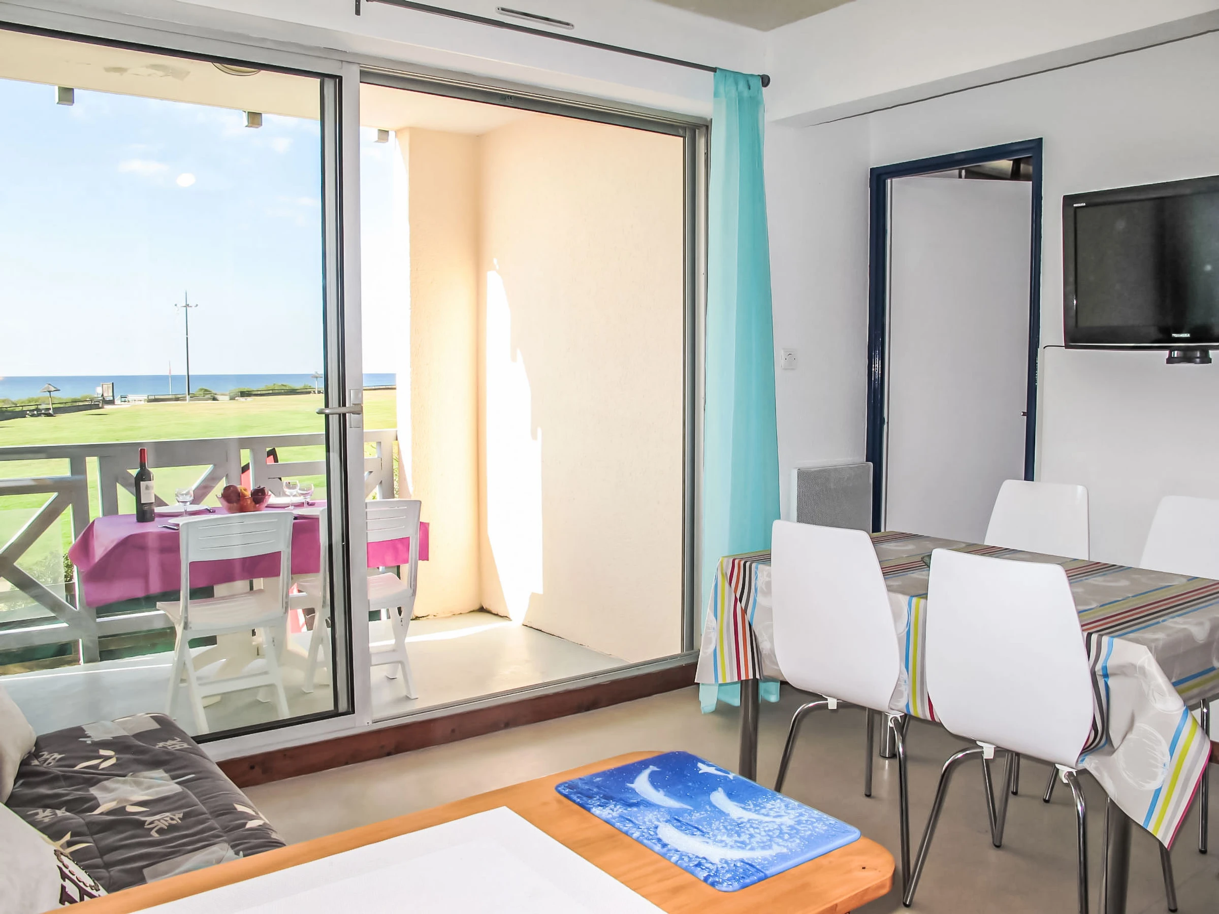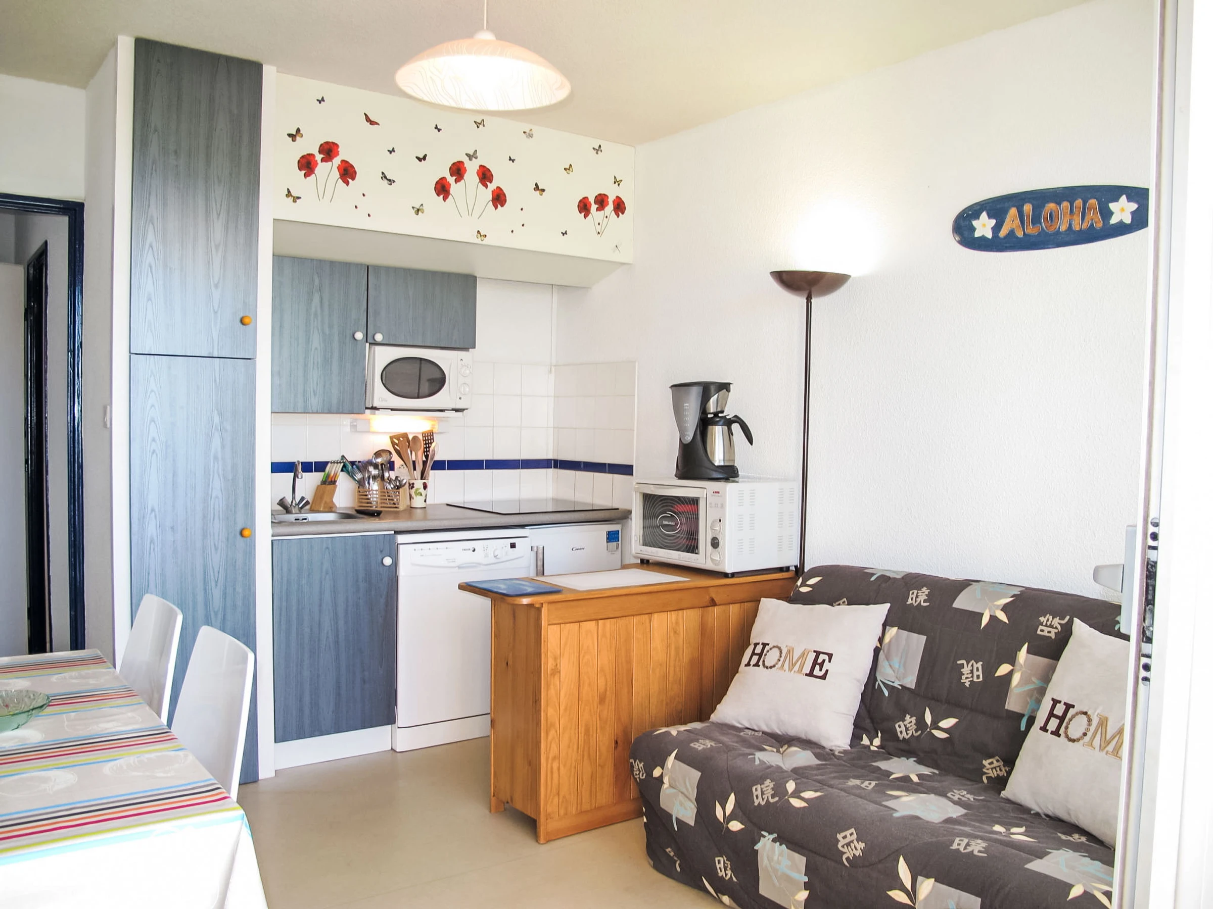 2-room apartment 28 m2 on 1st floor. Practical and beautiful furnishings: living/dining room with 1 double sofabed (1 x [hidden] cm), TV (flat screen). Exit to the balcony. 1 small room 9 m2 with 1 french bed (1 x [hidden] cm). Kitchenette (mini-oven, dishwasher, 1 ceramic glass hob hotplate, 4 gas rings, toaster, kettle, electric coffee machine, Capsules for coffee machine (tassimo + filtre) extra). Bath/WC. Electric heating. Balcony 8 m2. Balcony furniture. View of the sea. Facilities: washing machine. Internet (WiFi, extra). Please note: no parking. Maximum 1 pet/ dog allowed. TV only FR. Smoke alarm.