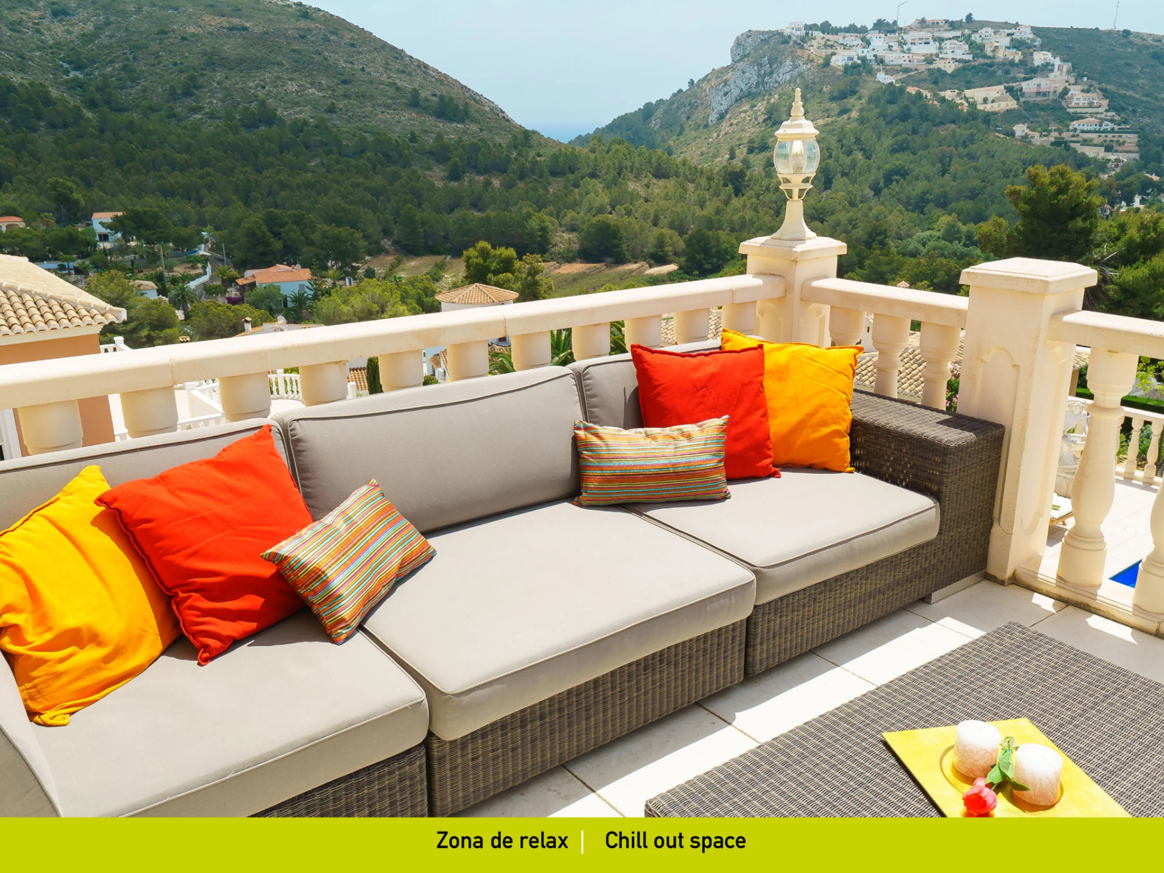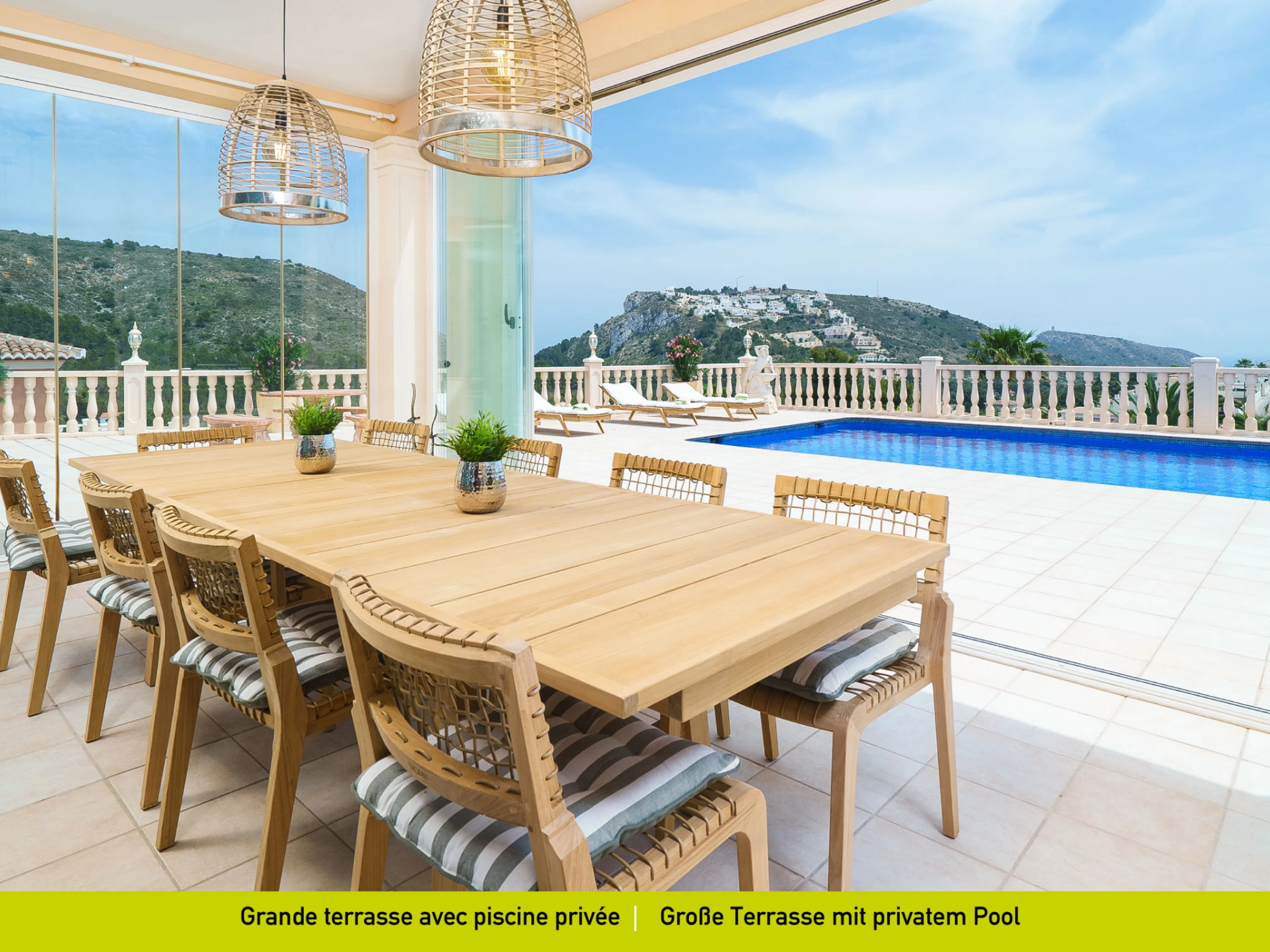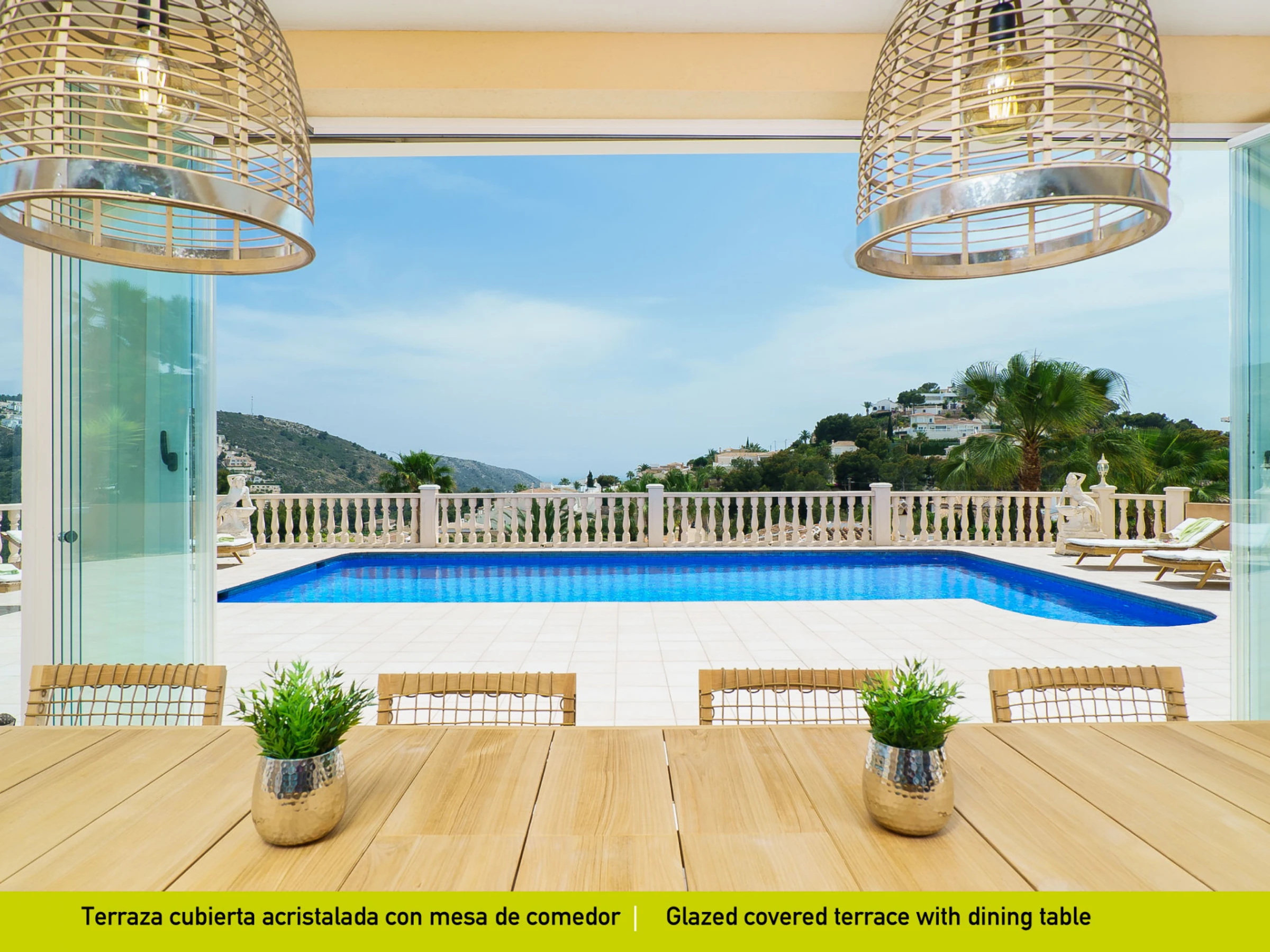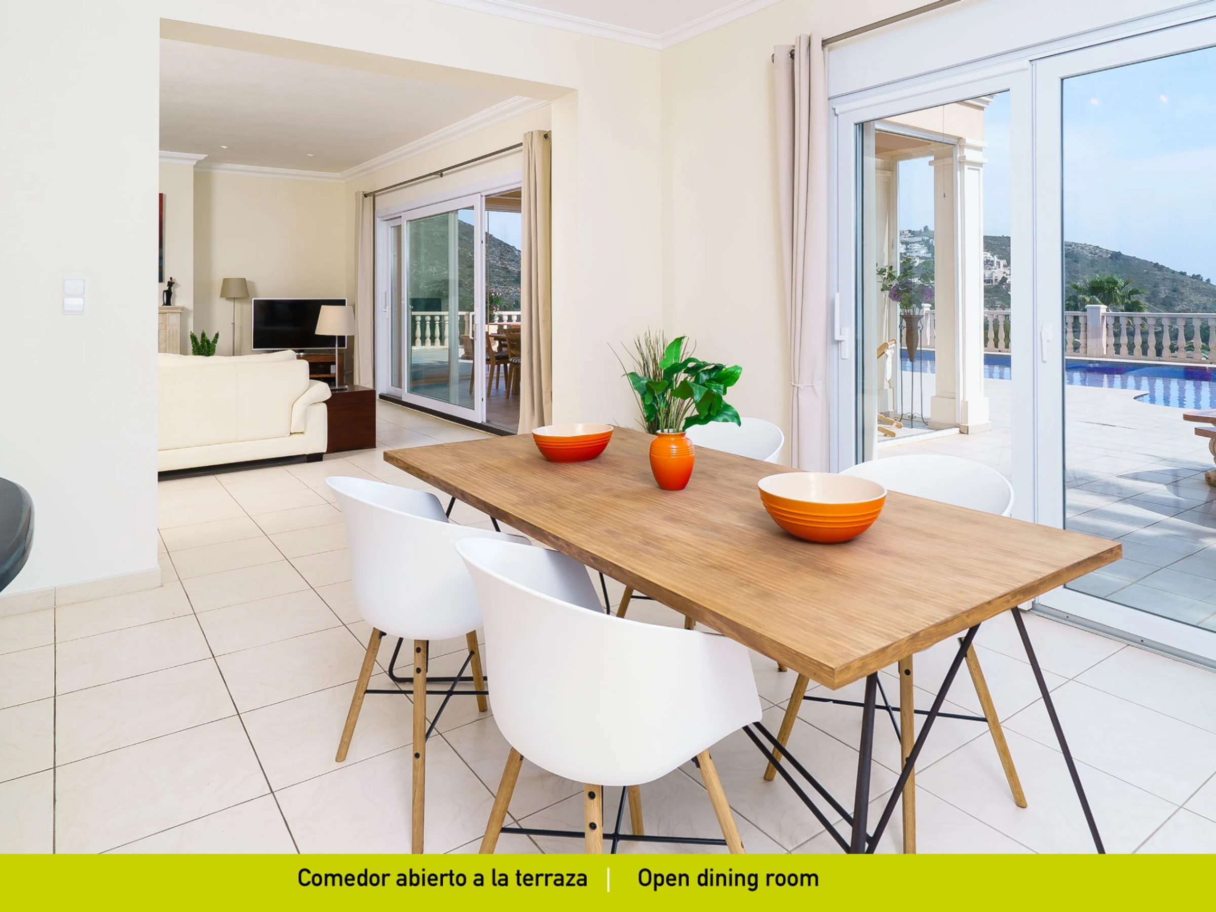 This modern villa with 4 bedrooms and a capacity for 8 people has a large terrace with private swimming pool from where you get a spectacular view of the valley of Moraira with the sea line in the background.