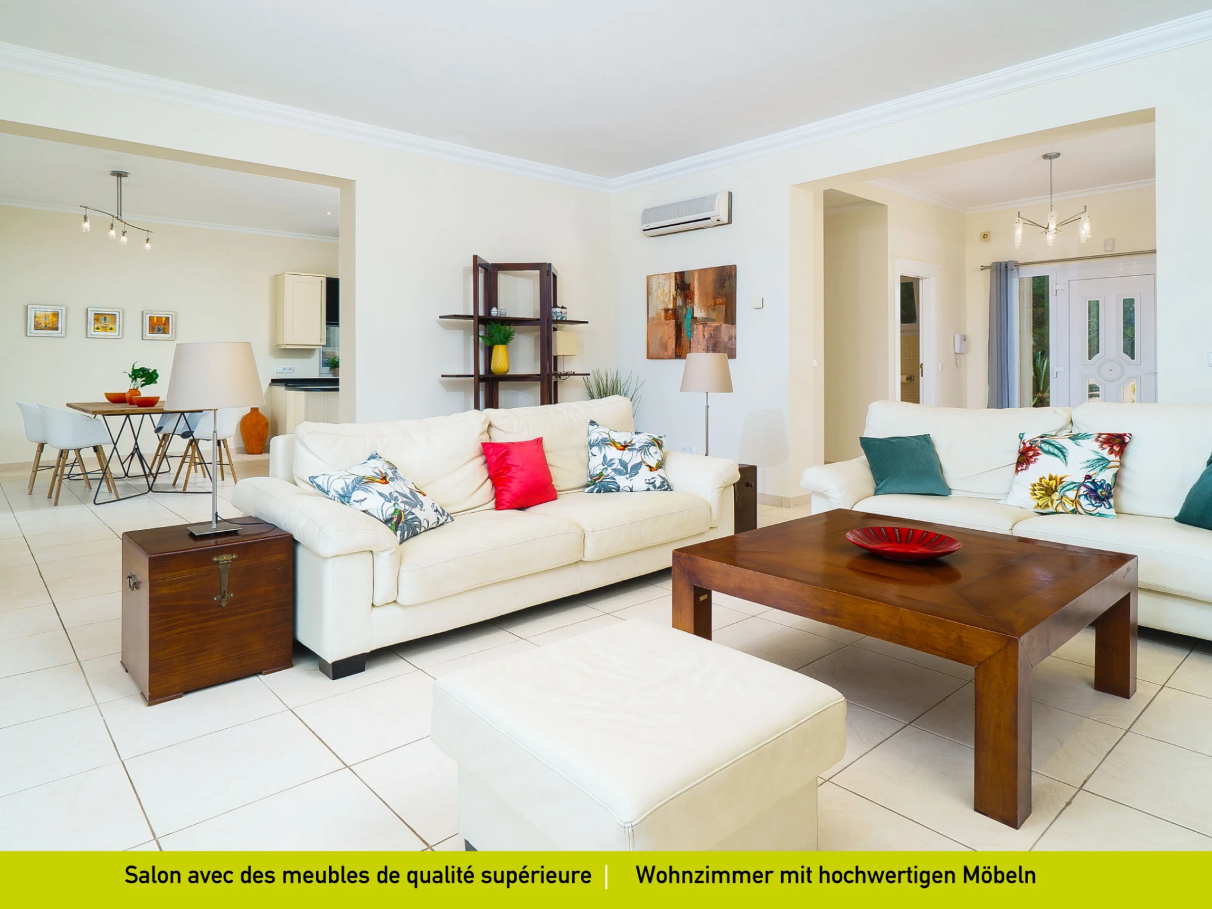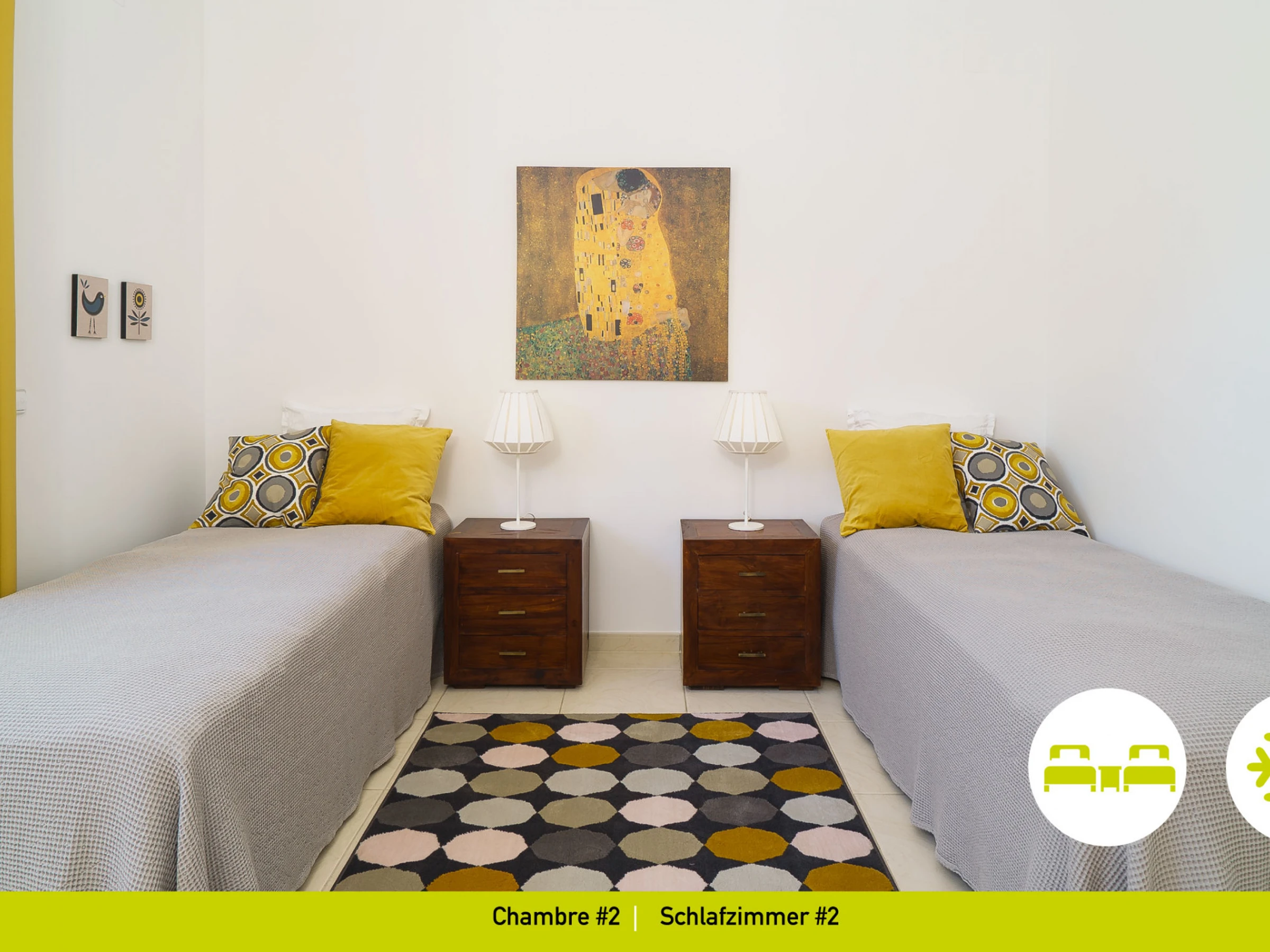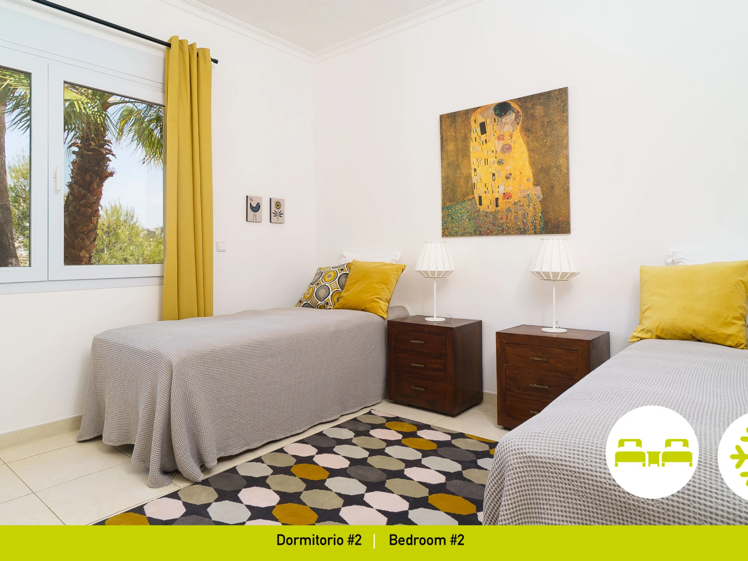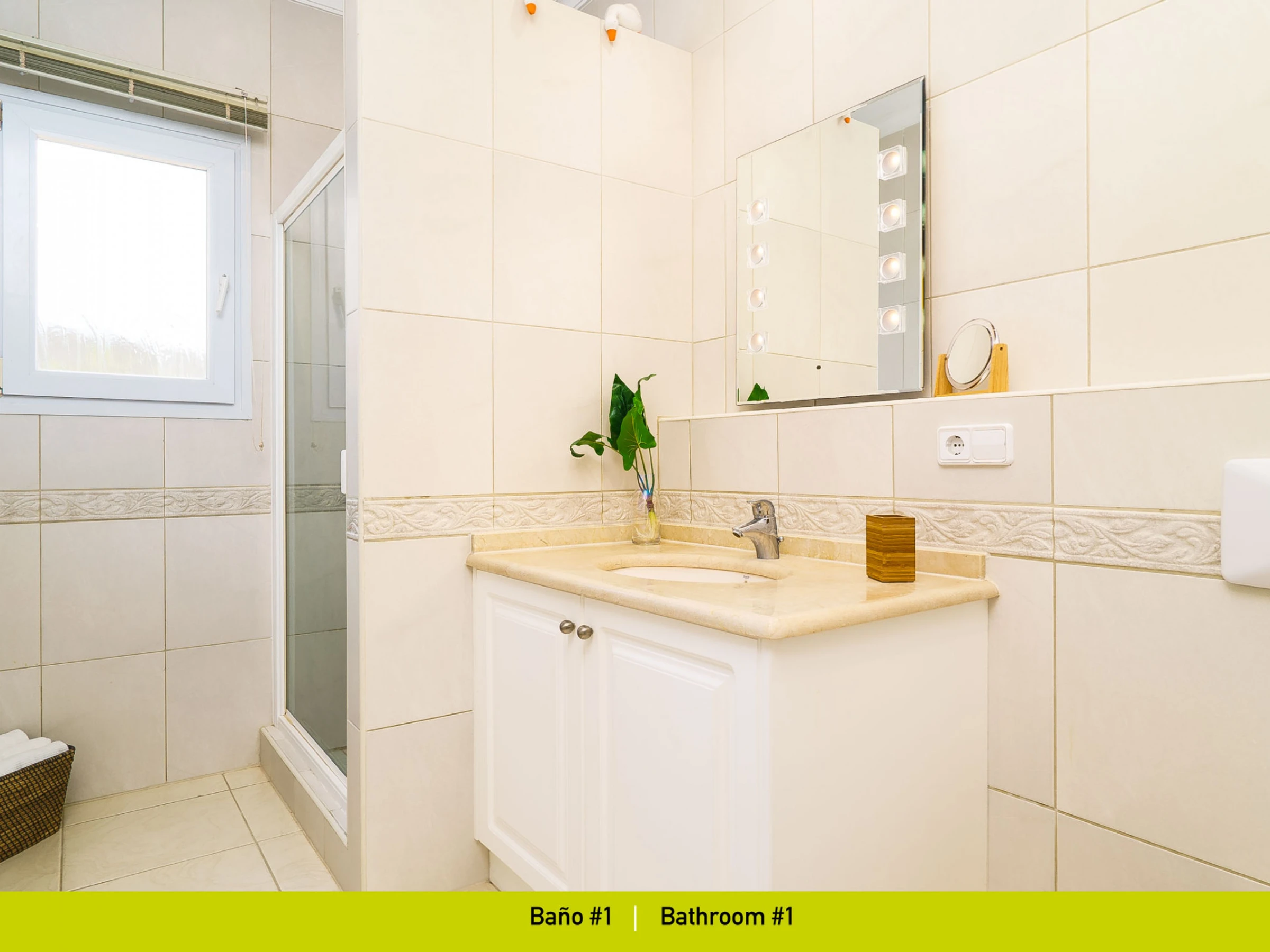 On the main floor, you will find a fully equipped kitchen, a cosy dining room, two bright bedrooms and a bathroom with shower. Bedroom # 1 has a double bed and direct access to the pool. Bedroom # 2 has two single beds and nice views of the garden. Both are equipped with built-in wardrobes, air conditioning and shared bathroom #1.