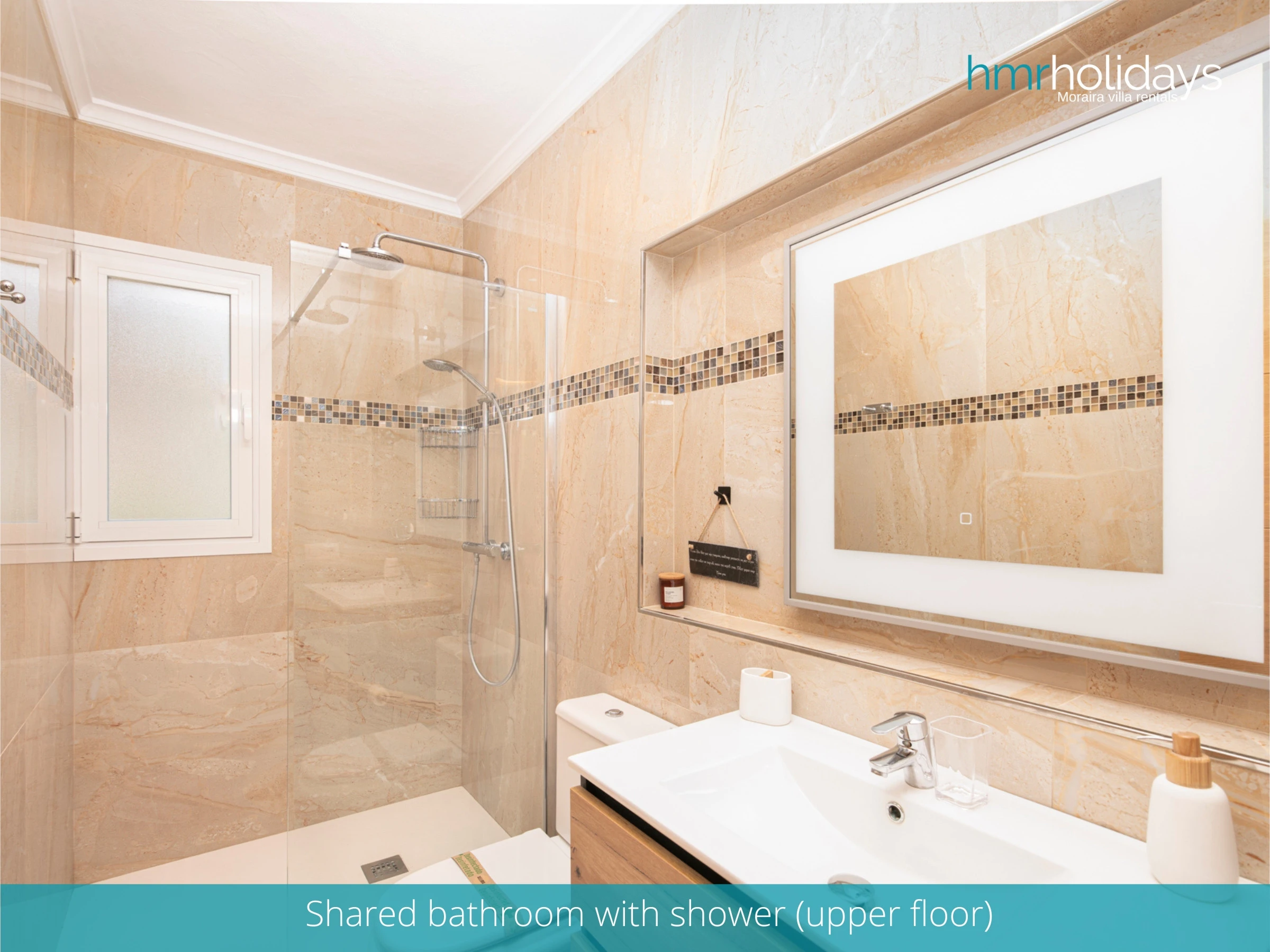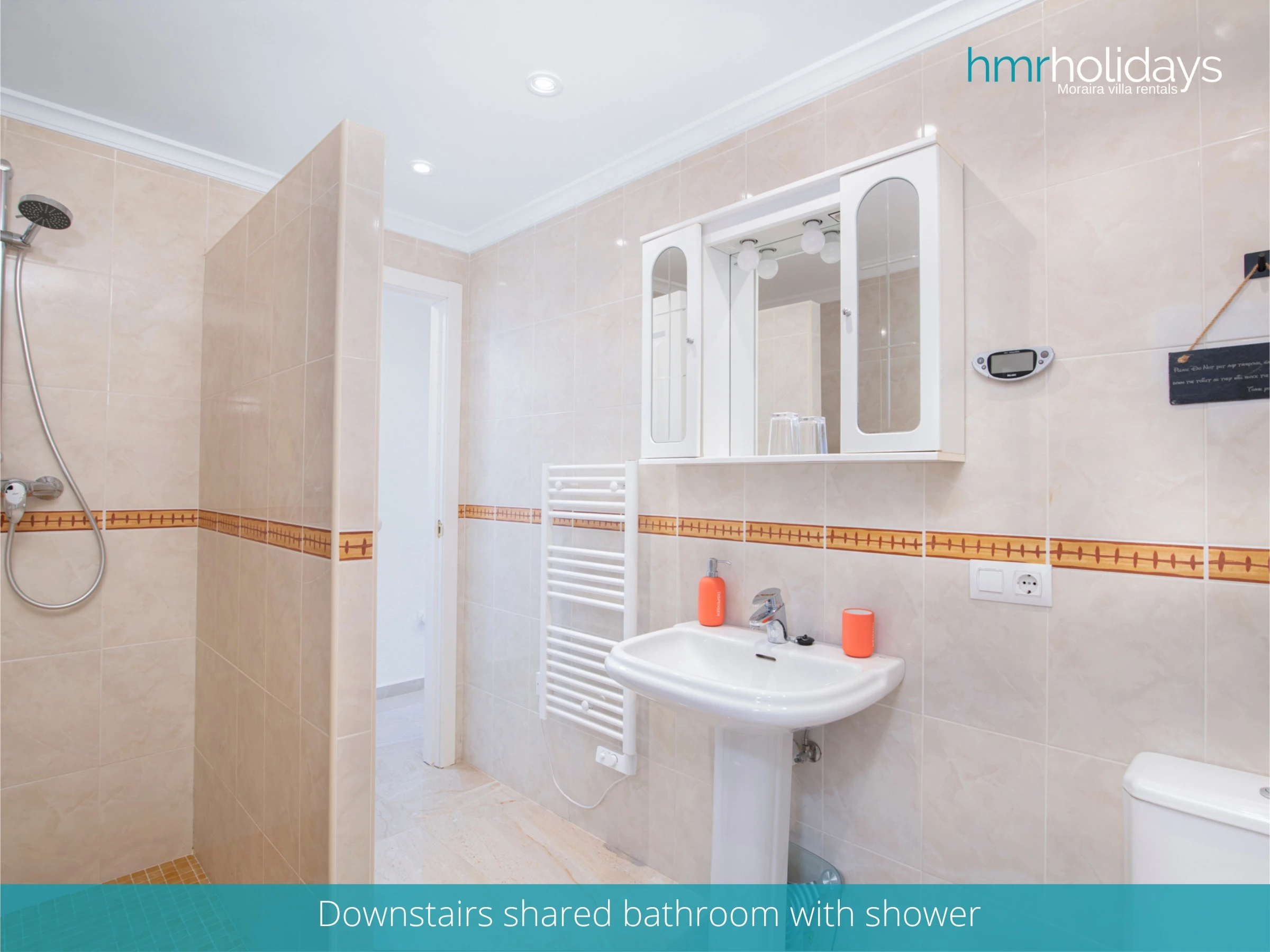 Outside has a lower terrace with covered area housing large sofas, pool (10m x 5m) with an additional shallow sunbathing shelf, large pool terrace with sunbeds, toilet facilities, shower, gardens, and a table tennis table. The brand-new bar area is the centre of evening entertainment together with gas fired BBQ, paella cooker, fridge freezer, bar stools and extensive lighting. Opposite is a spacious pergola with thatched roof and fan, for comfortable al fresco dining.