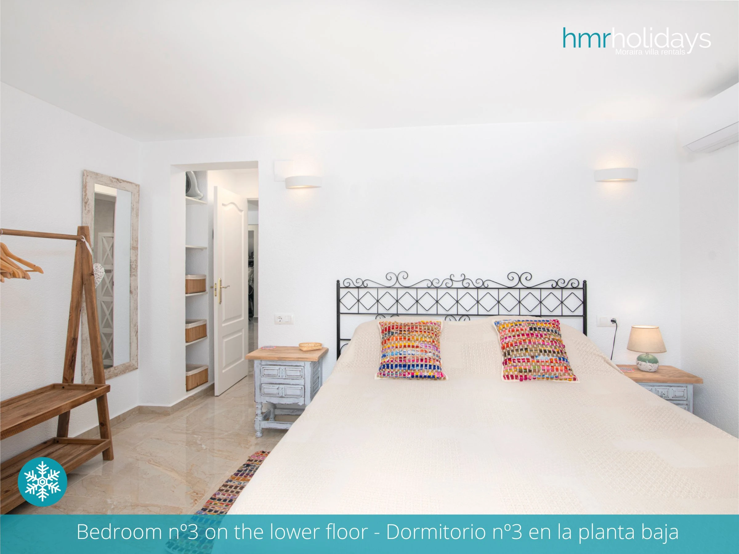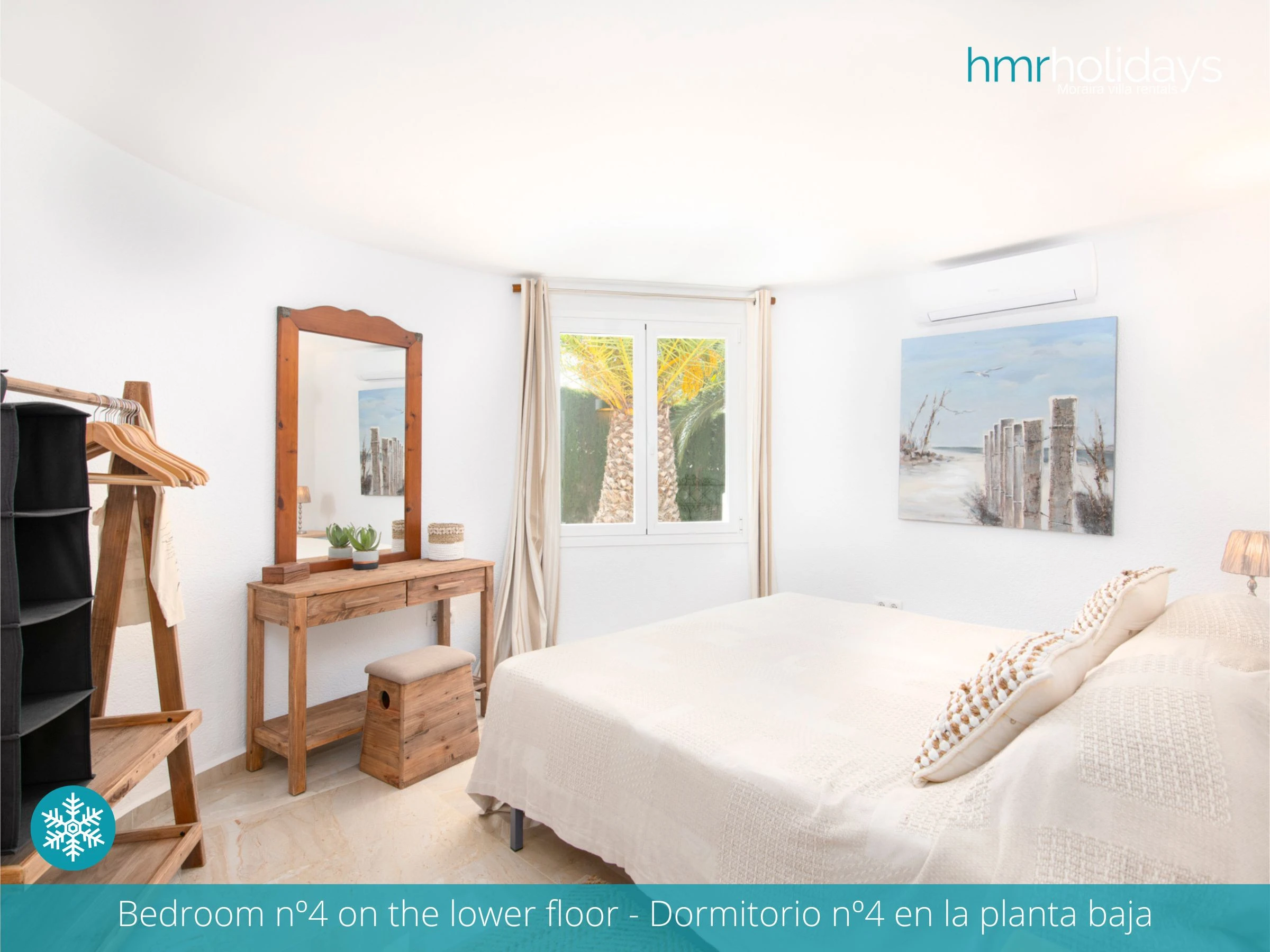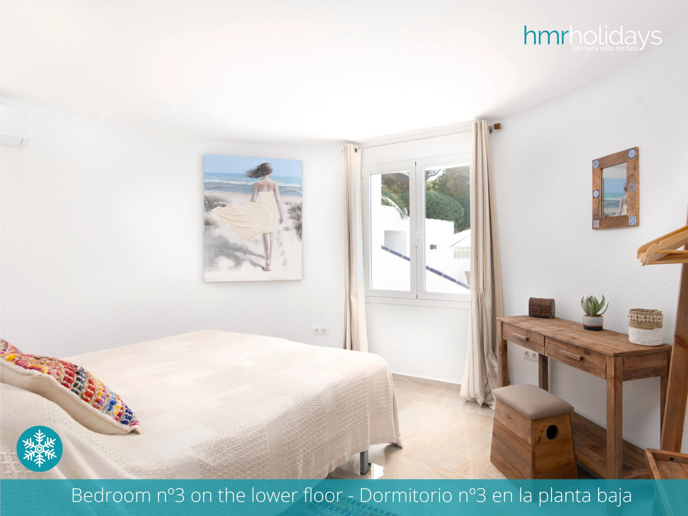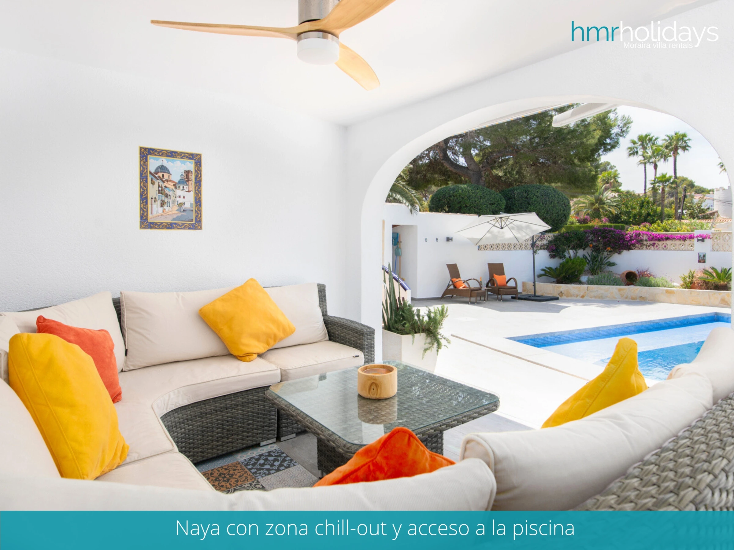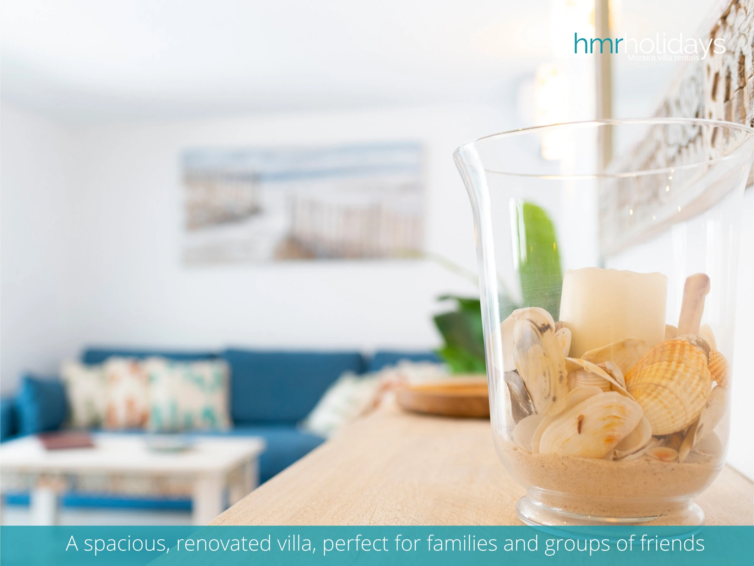 This beautiful 4 bedroomed villa (213m²) is set in a spacious plot (990m²) and is located in the quiet Cap Blanc area of Moraira. It has versatile accommodation to suit a range of family or friend groups, having numerous different seating and eating areas in both the sun and the shade around the villa, terraces and gardens for up to 8 people. The property was refurbished both inside and out in 2022 including new aircon units in every room.