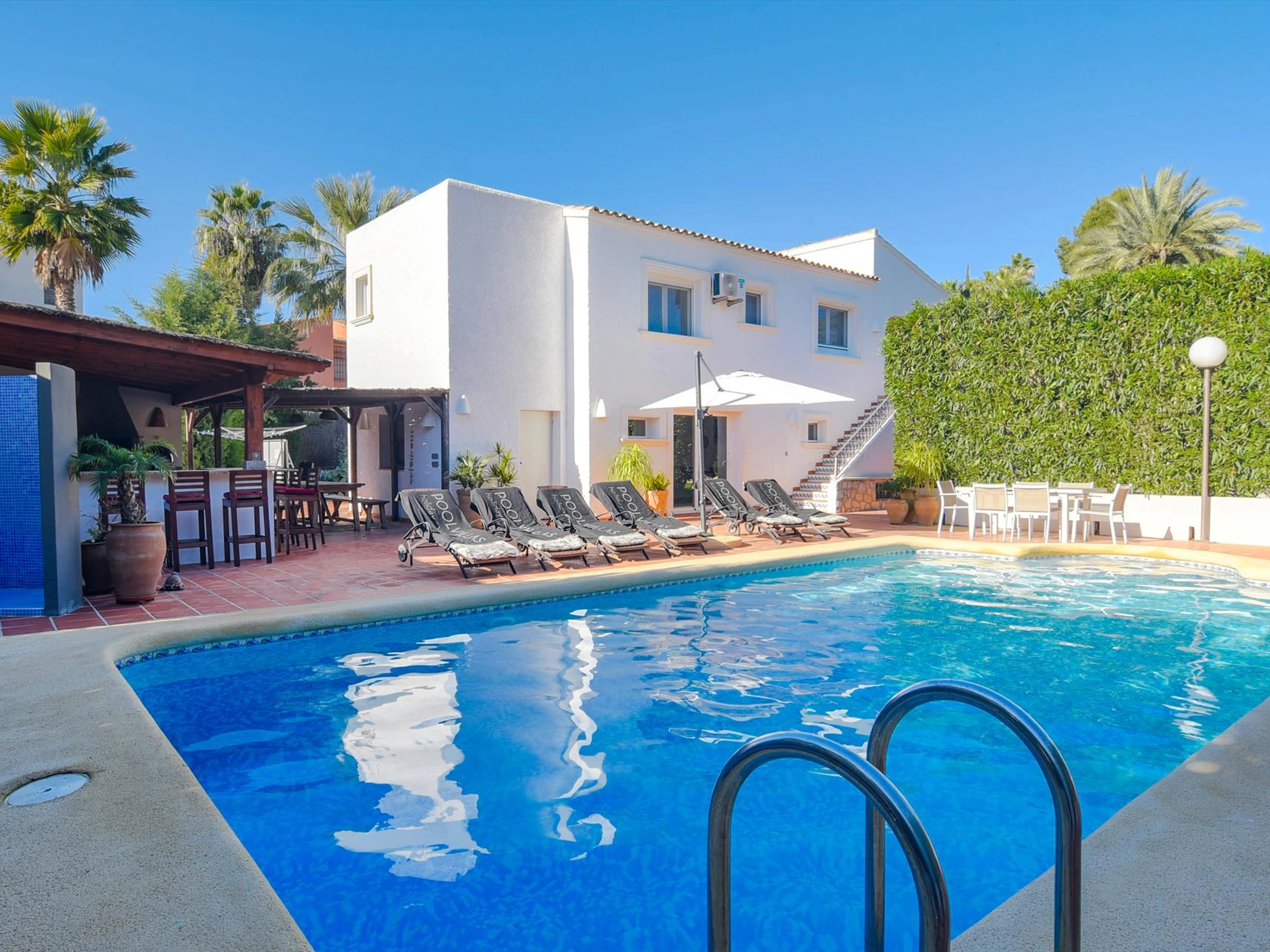 Exterior of the villalarge and enclosed plotheated private pool measuring 10m x 5m and 2m deepbeautiful lawned garden with gravel, trees and garden furniture with sunbedsplayground3 terraces, of which 2 coveredoutdoor kitchen and barbecueoutdoor showeroutside sitting area and outside dining area2 private covered parking spaces and 3 private parking spaces