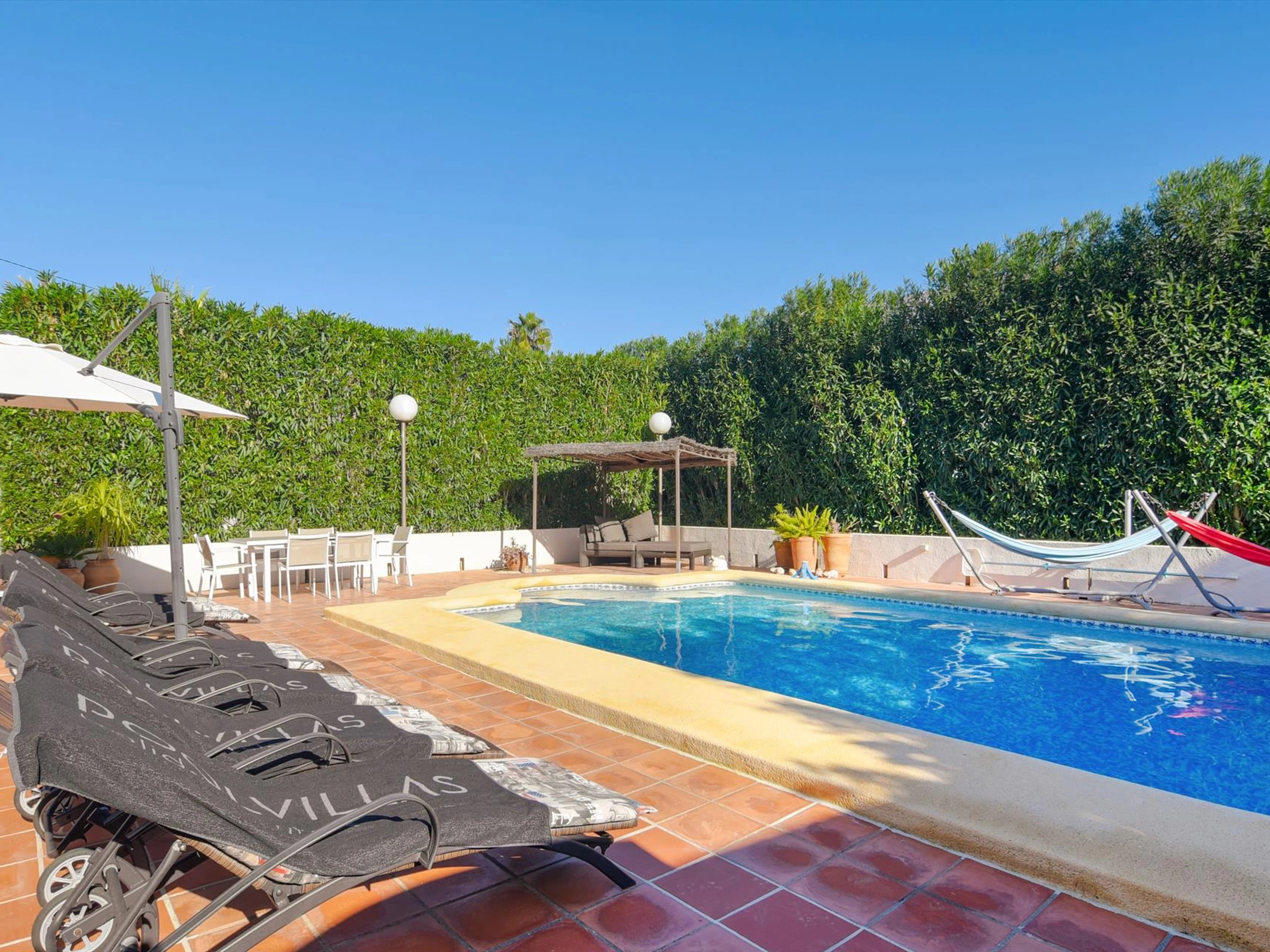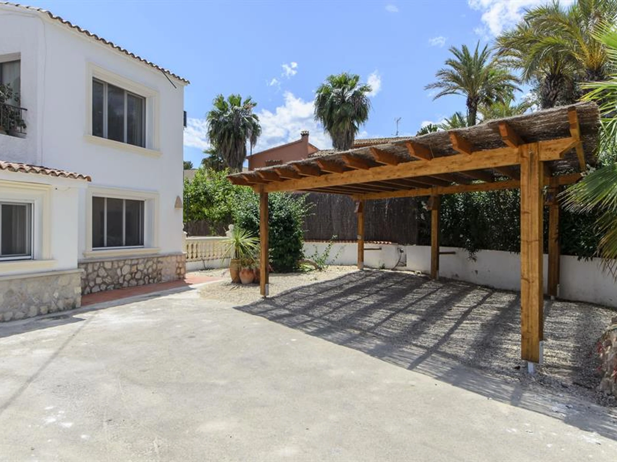 Exterior of the villalarge and enclosed plotheated private pool measuring 10m x 5m and 2m deepbeautiful lawned garden with gravel, trees and garden furniture with sunbedsplayground3 terraces, of which 2 coveredoutdoor kitchen and barbecueoutdoor showeroutside sitting area and outside dining area2 private covered parking spaces and 3 private parking spaces