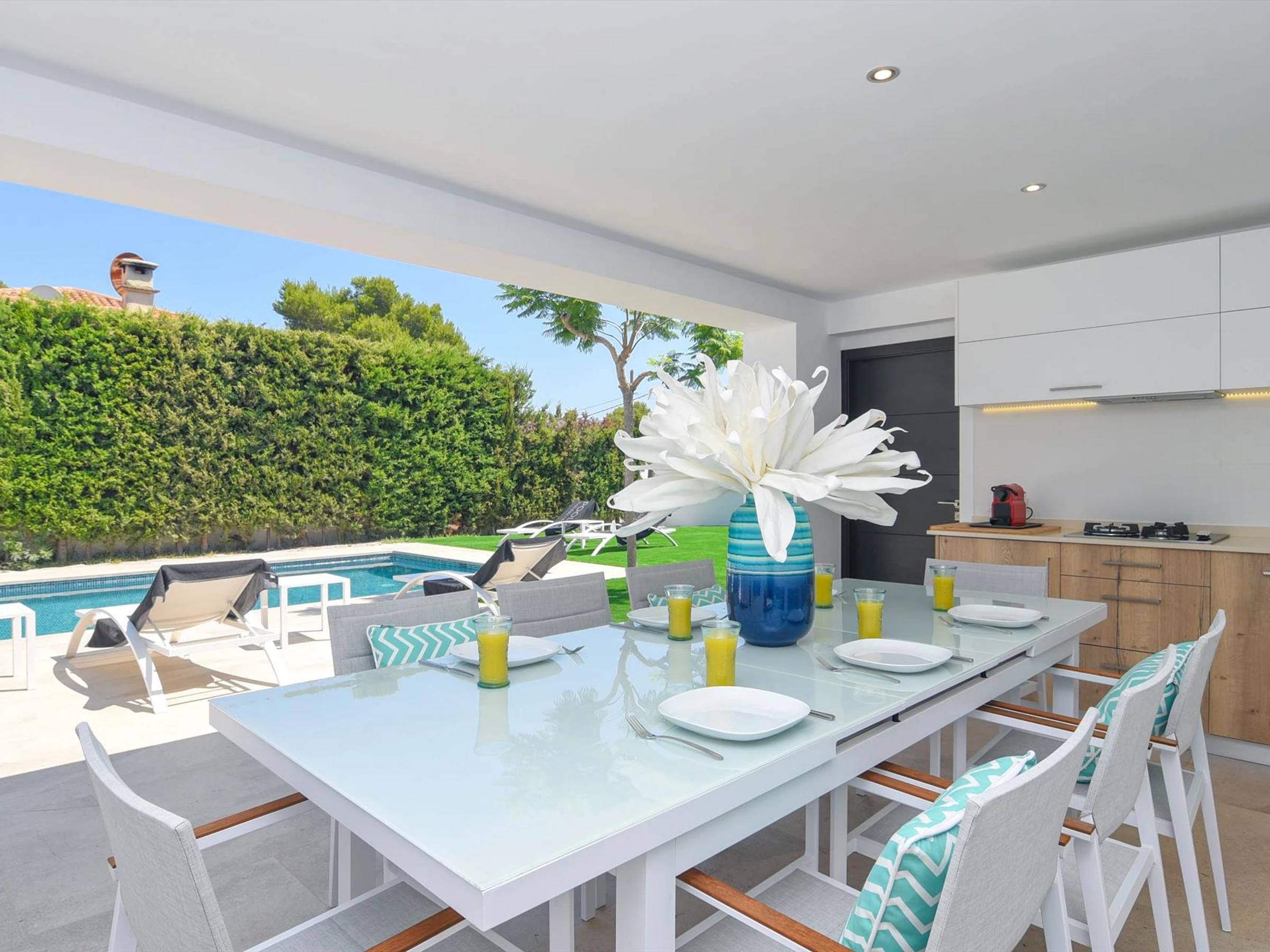 Exterior of this luxury villaenclosed plotheated private pool measuring 11m x 4m and 1,6m deepwonderful lawned garden with gravel, trees and garden furniture with sunbeds3 terraces, of which 1 coveredoutdoor kitchen and barbecueoutdoor showeroutside sitting area and outside dining areaprivate covered parking space and 2 private parking spaces