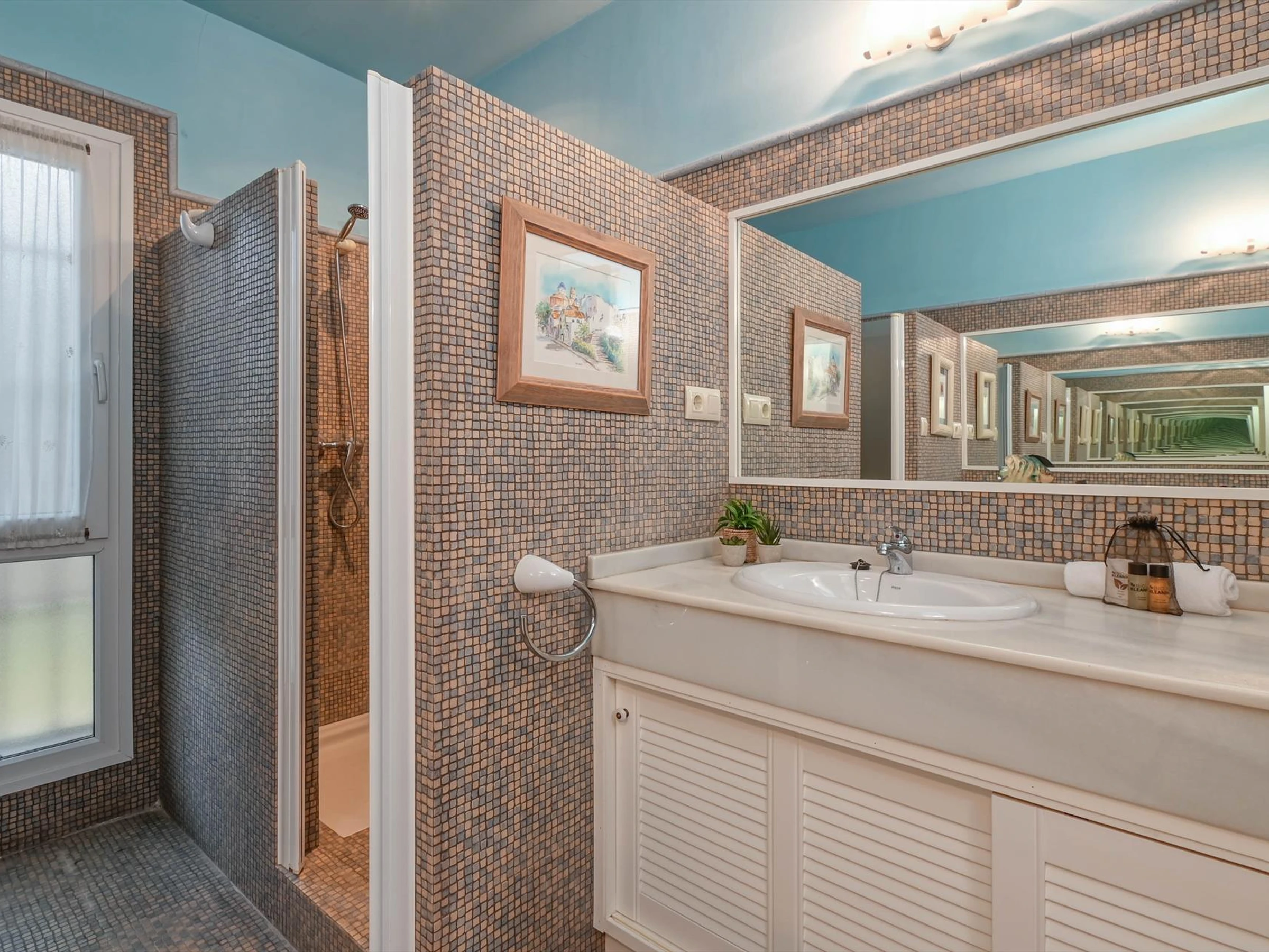 * bathroom with single washbasin, shower and toilet Exterior of the villa