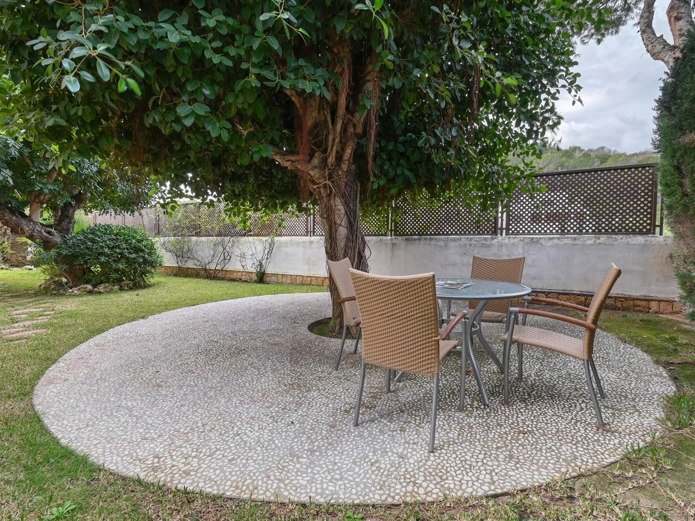 * wonderful lawned garden with trees and garden furniture with sunbeds