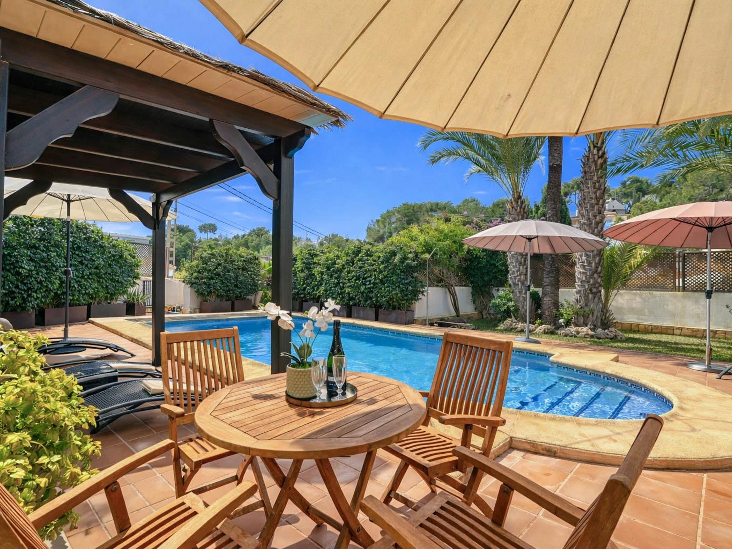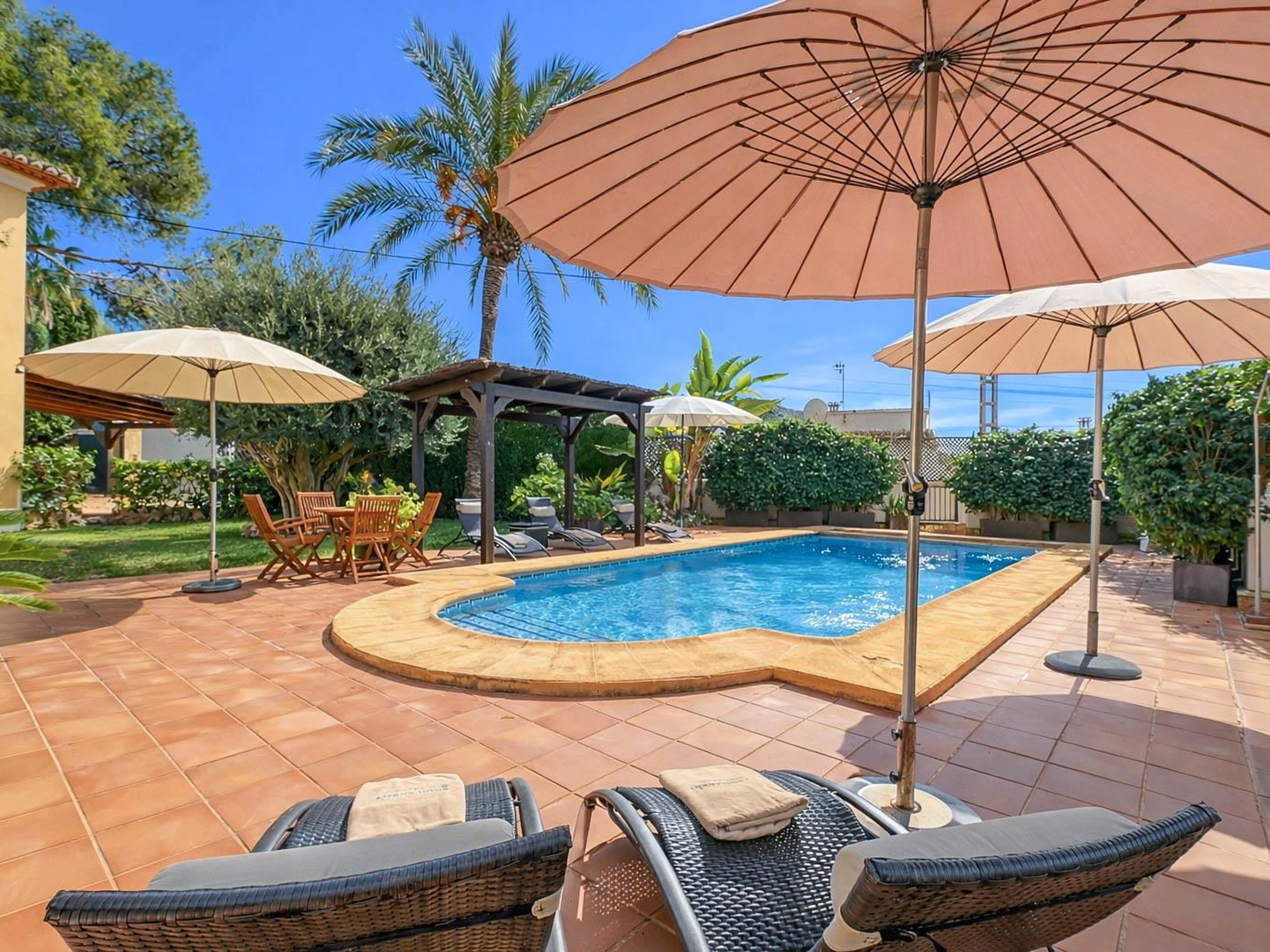 Wonderful and classic villa in Moraira, Costa Blanca, Spain with private pool for 4 persons. The house is situated in a residential beach area, 500 m from El Portet beach and 0. 5 km from the Mediterranean Sea. The villa has 2 bedrooms, 3 bathrooms and 1 guest toilet, spread over 2 levels.