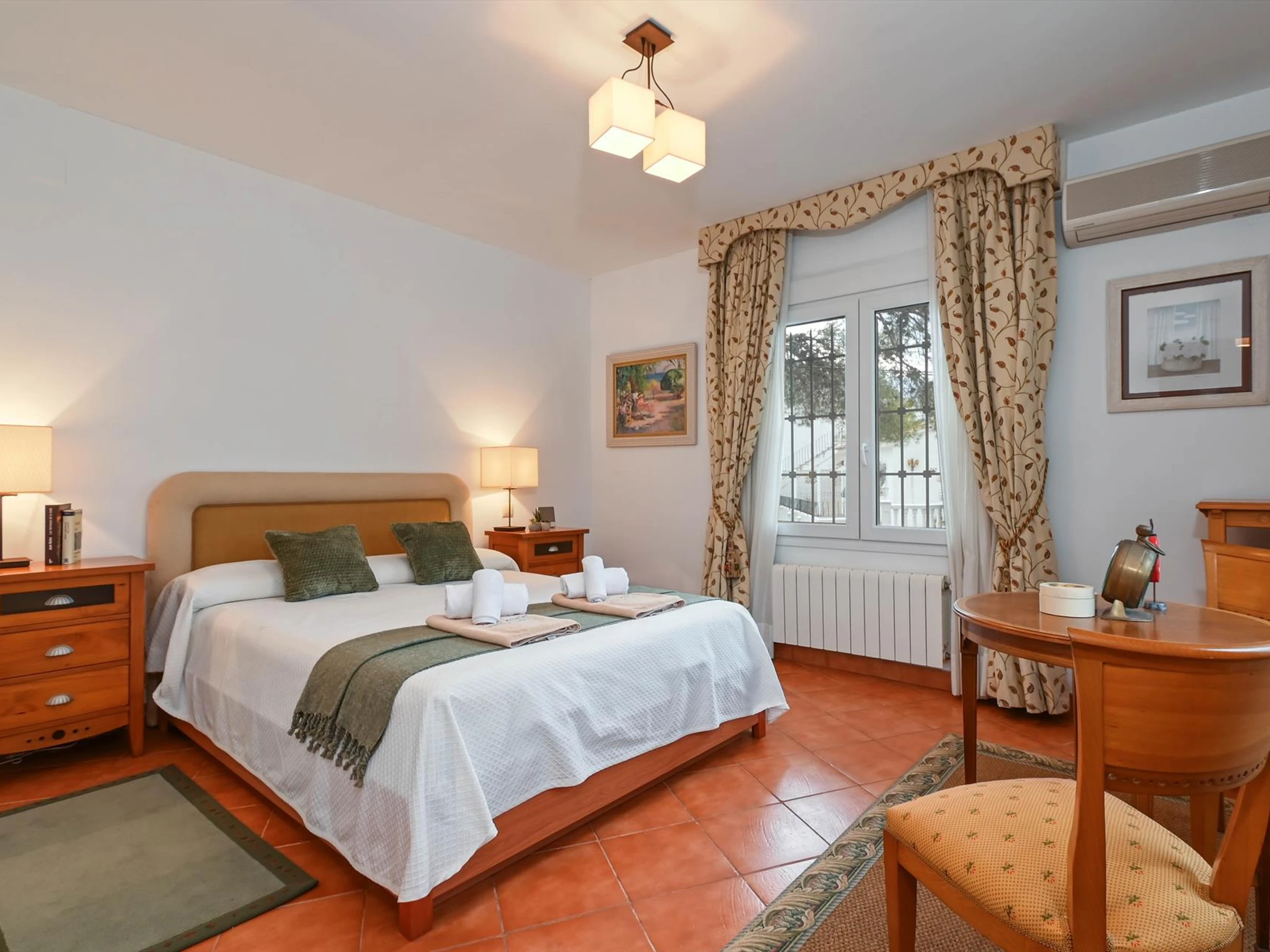 * bedroom with air conditioning, double bed and en-suite bathroom