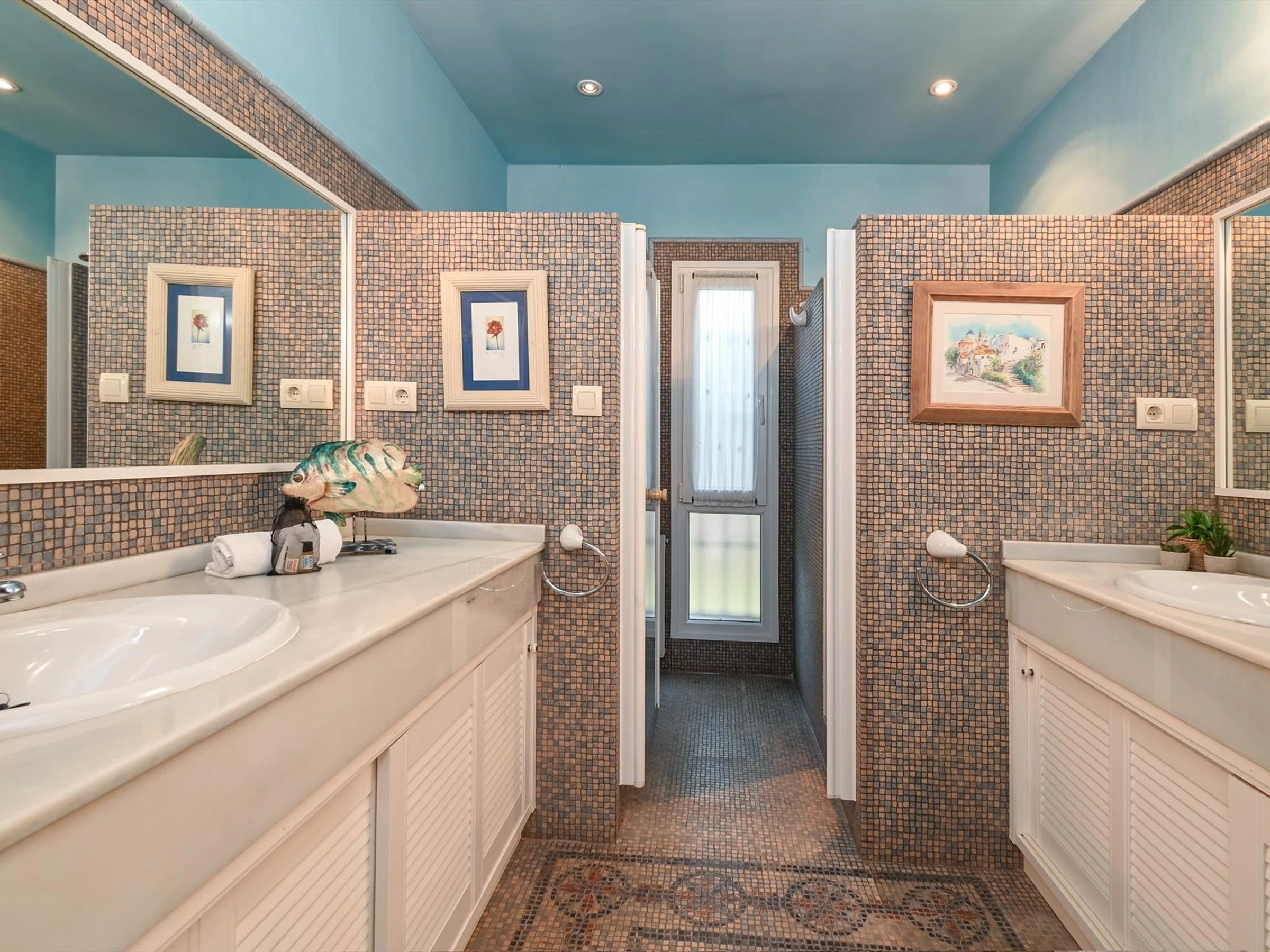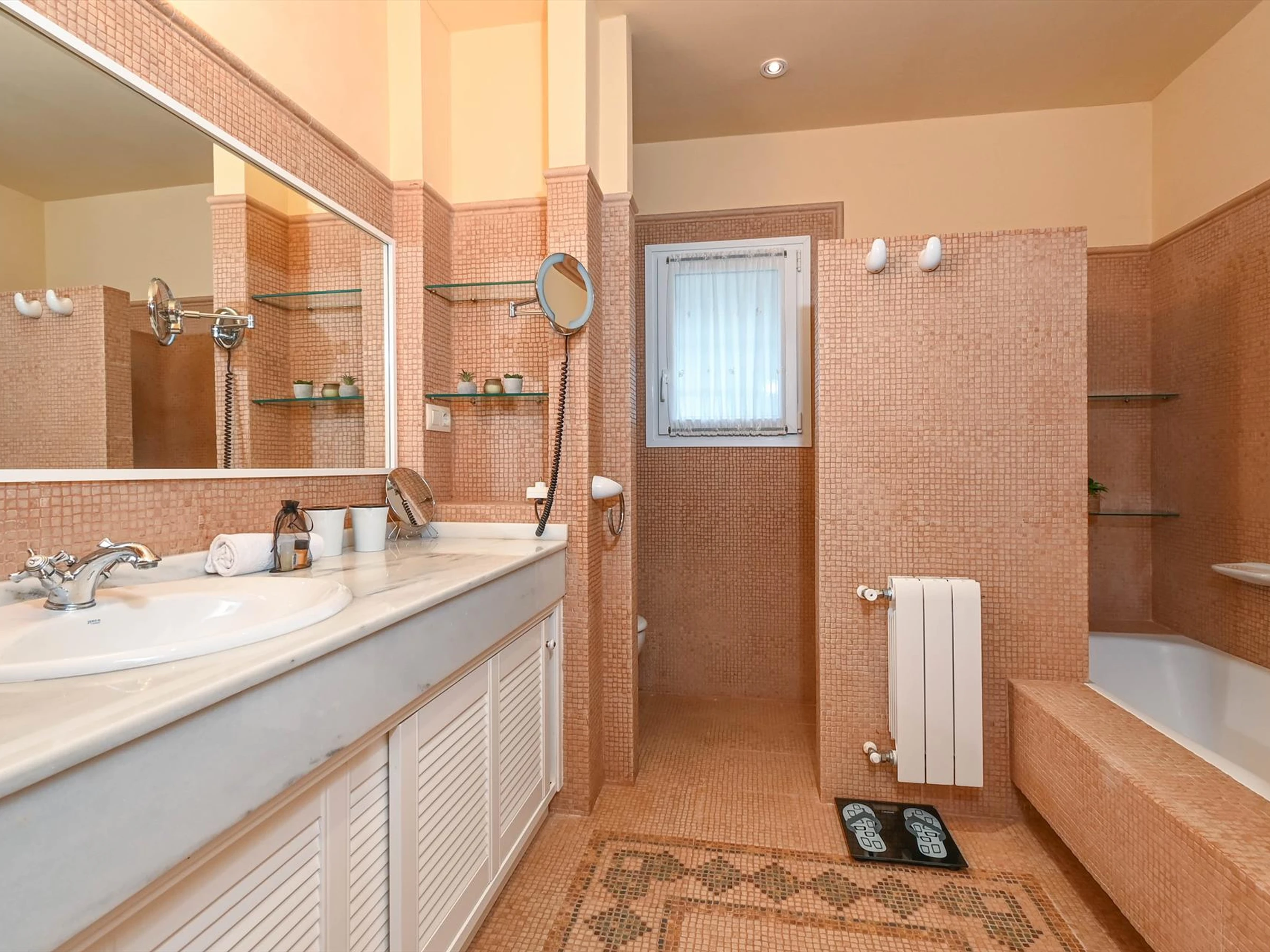 * bathroom with double washbasin, shower, bidet and toilet