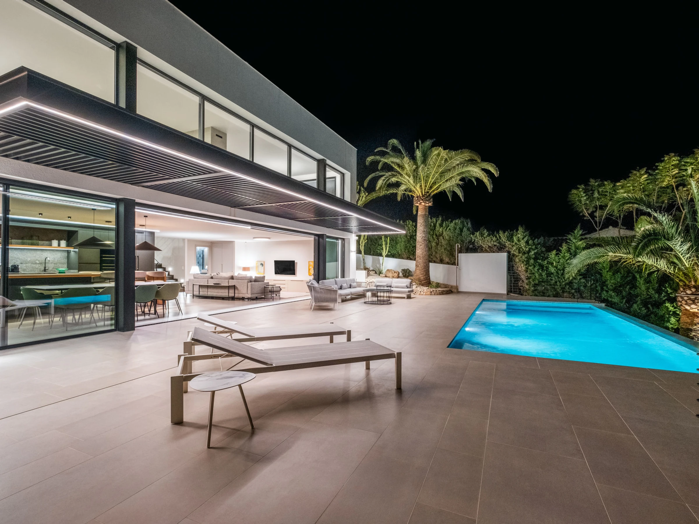Very modern, beautiful villa "Cabo de Gata", 3 storeys. 3 km from the centre of Moraira, 11 km from the centre of Calpe, in a quiet, sunny position residential area (villas), traffic calmed area, 150 m from the sea, 150 m from the beach. Private: property (fenced), well-kept garden, swimming pool (9 x 4 m, seasonal availability: [hidden] - [hidden] Outdoor shower, terrace, garden furniture, barbecue. In the house: roof terrace, washing machine, tumble dryer. Parking on the premises. Grocery, supermarket 750 m, restaurant 650 m, bus stop 750 m, sandy beach "Playa L'Ampolla" 3 km, rocky beach "Cala Punta Estrella", swimming bay 140 m. Sports harbour 4 km, marina 4 km, golf course (18 hole) 2 km. Nearby attractions: Aqualandia, Mundomar, Terra Mítica, Terra Natura, Benidorm Palace (Benidorm), Les Fonts de l'Algar, Castillo de Guadalest. Please note: suitable for families. The owner does not accept any youth groups.