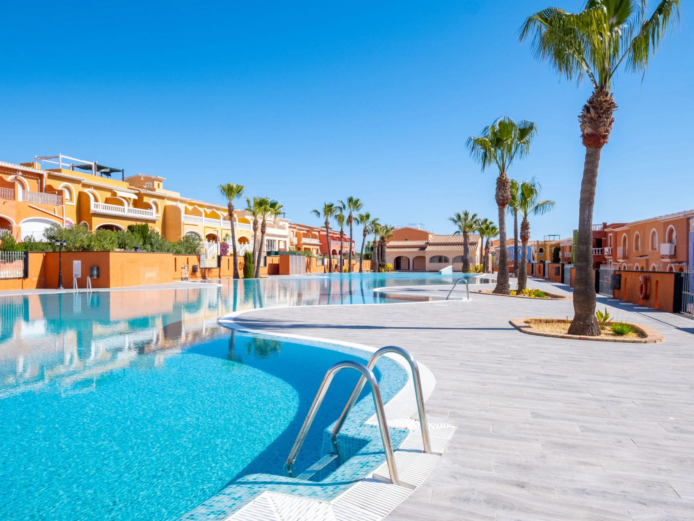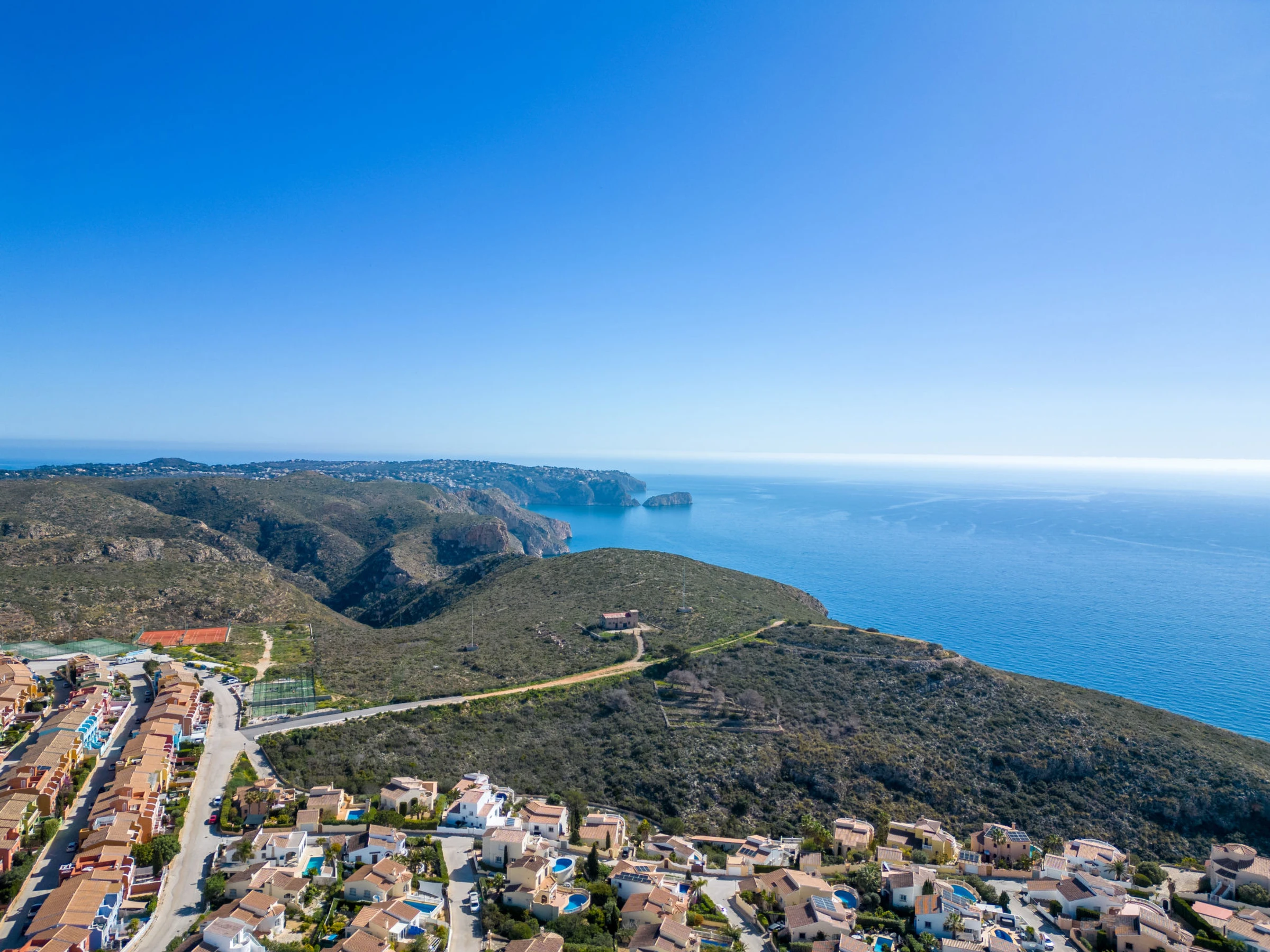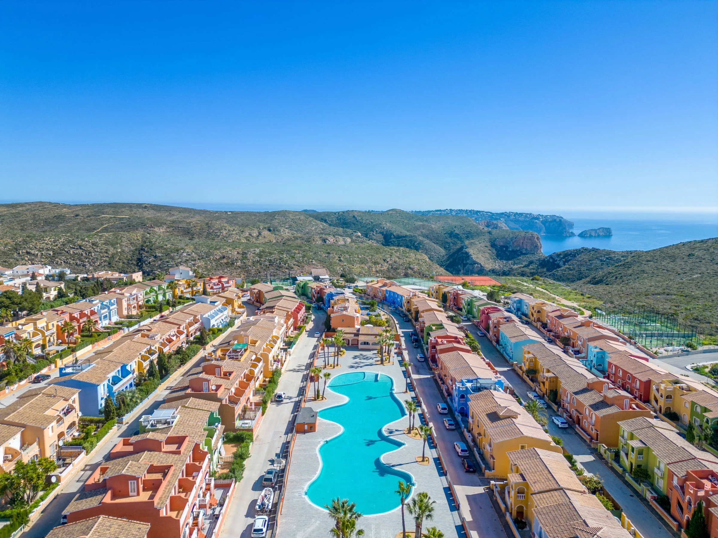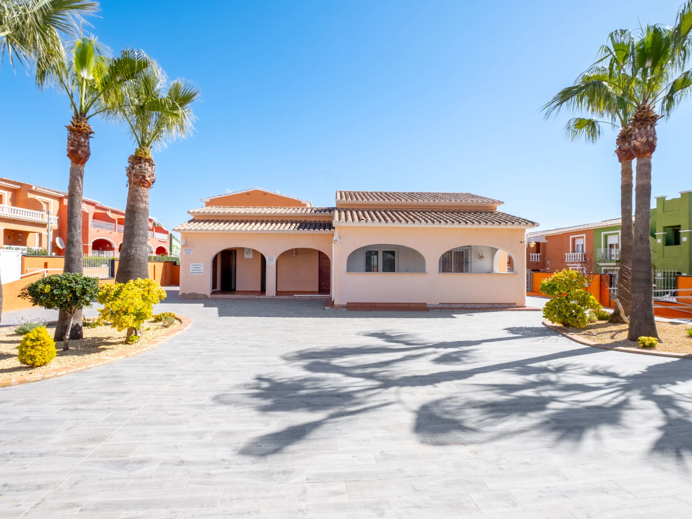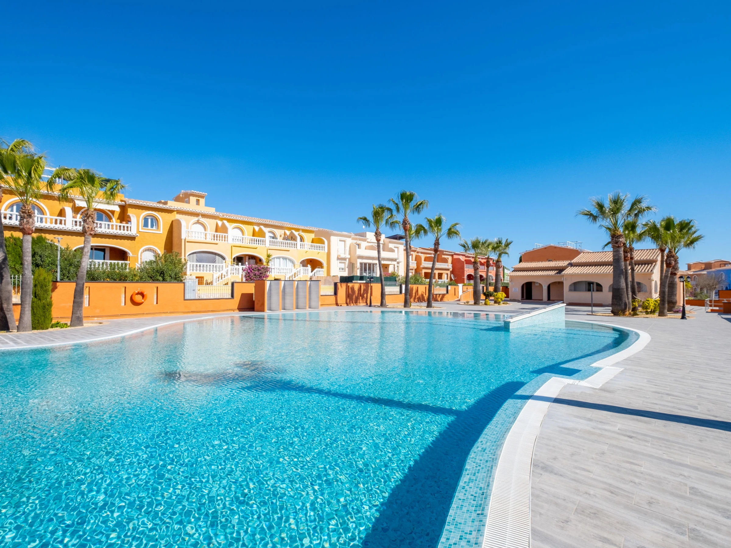 Cumbre del Sol: Large, beautiful holiday development "Pueblo de la Paz". 8 km from the centre of Moraira, in the district Cumbre del Sol, in a quiet, sunny position in the residential district, traffic calmed area, 1.8 km from the sea, 1.8 km from the beach. For shared use: beautiful, well-kept garden, swimming pool (60 x 16 m, seasonal availability: [hidden] - [hidden] with internal staircase. Children's pool, outdoor shower, terrace. Grocery, supermarket 500 m, restaurant 600 m, bus stop 4 km, sandy beach "Playa Arenal" 8 km, rocky beach "Cala Moraig" 1.8 km. Sports harbour 9 km, marina 9 km, golf course 11 km. Nearby attractions: Aqualandia, Mundomar, Terra Mítica, Terra Natura, Benidorm Palace (Benidorm), Les Fonts de l'Algar, Castillo de Guadalest. The owner does not accept any youth groups.