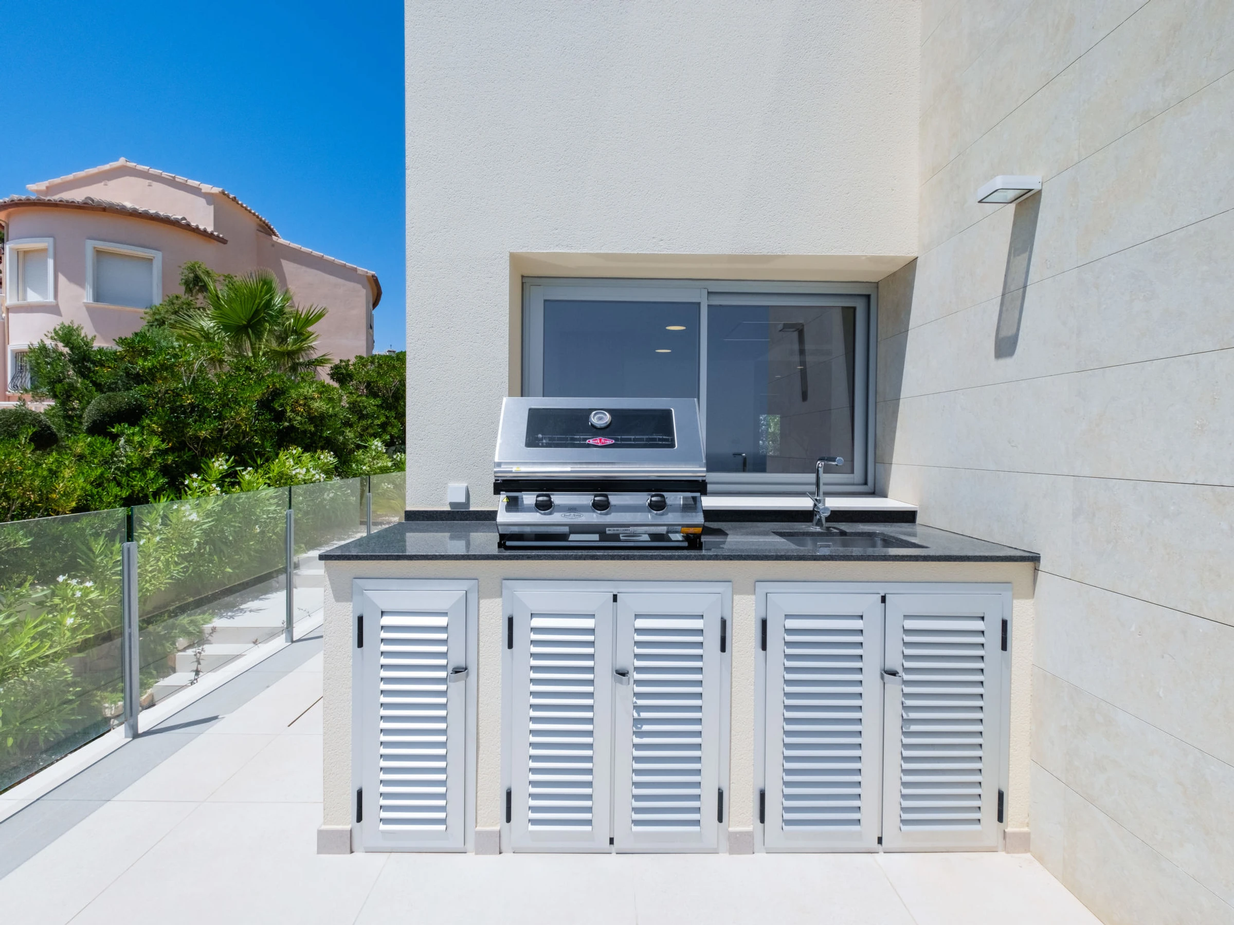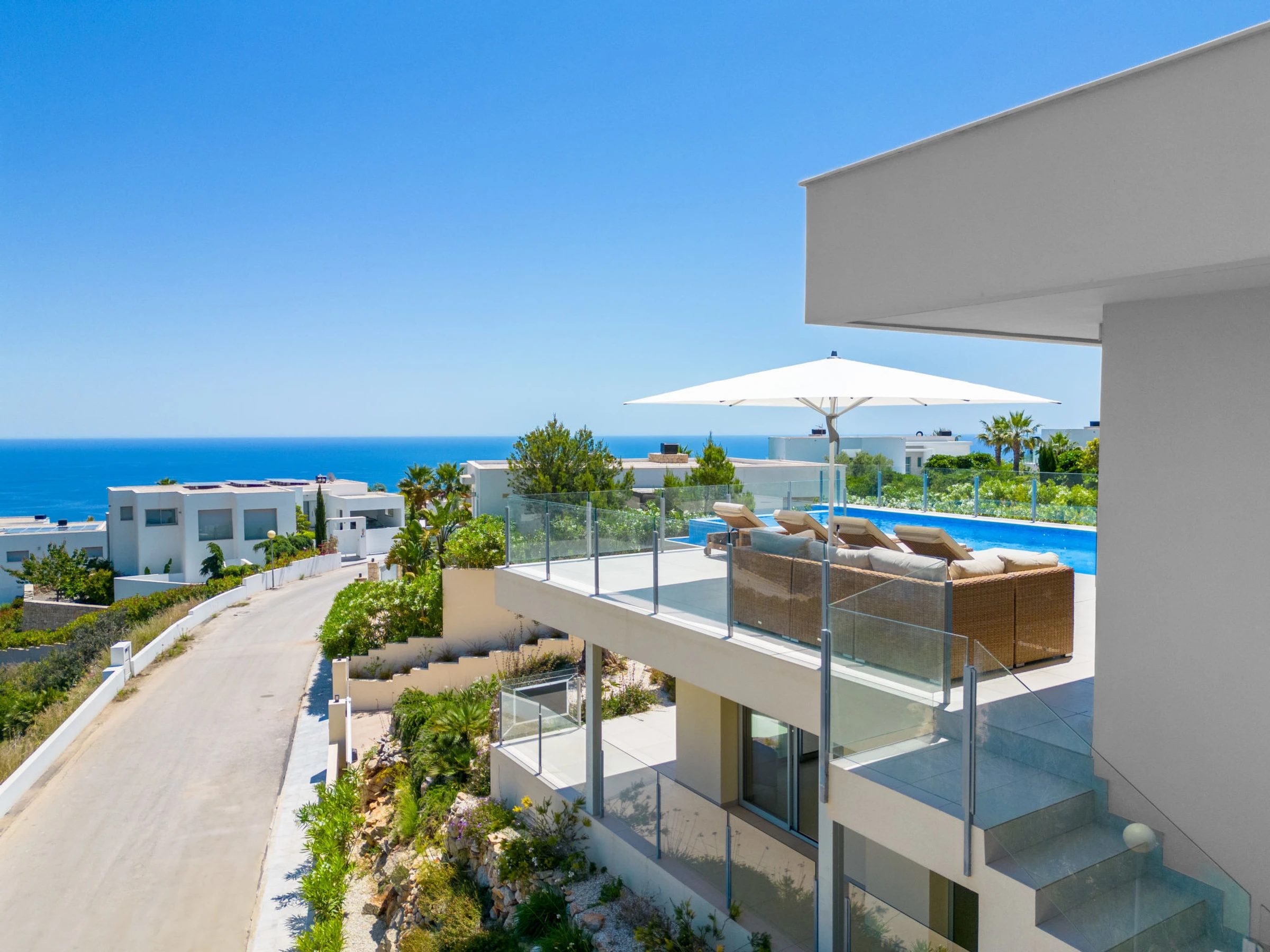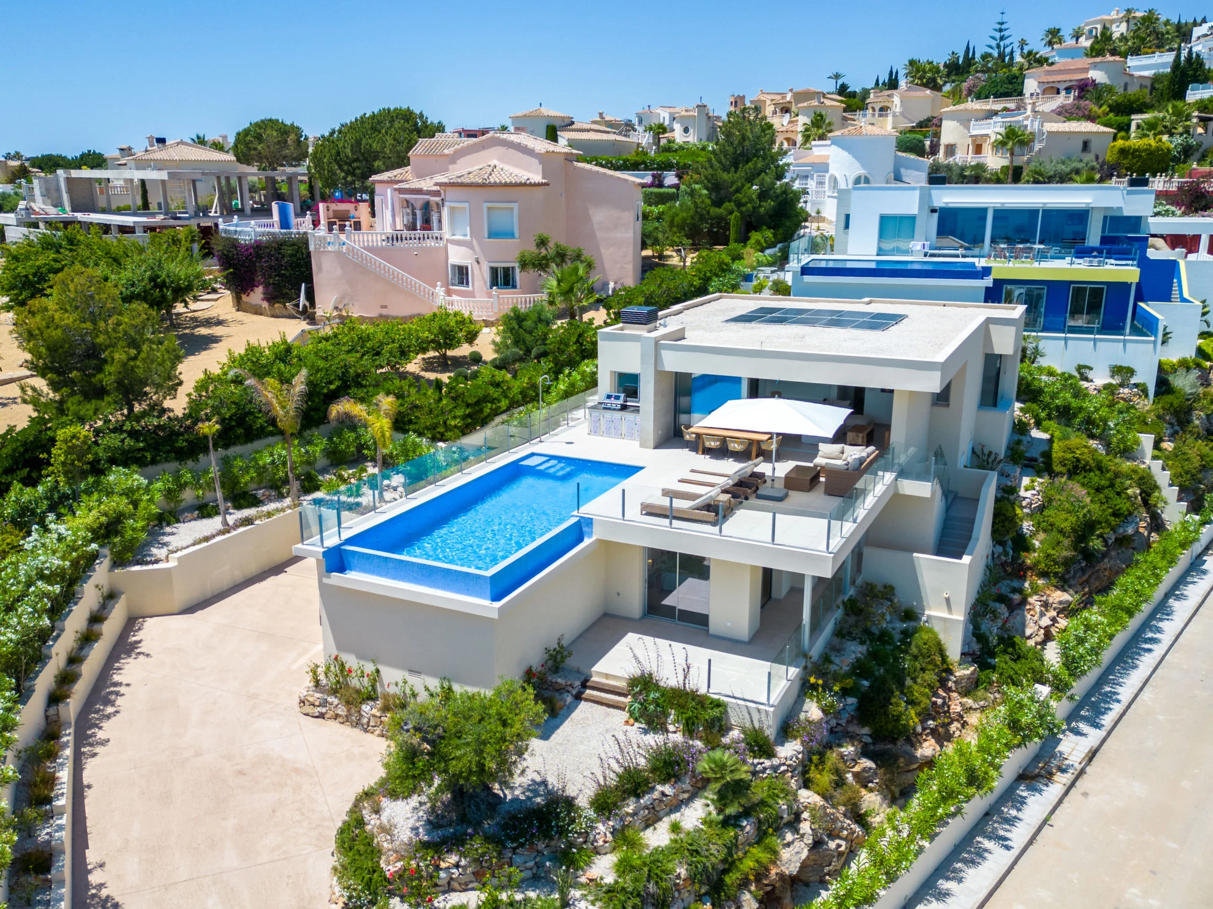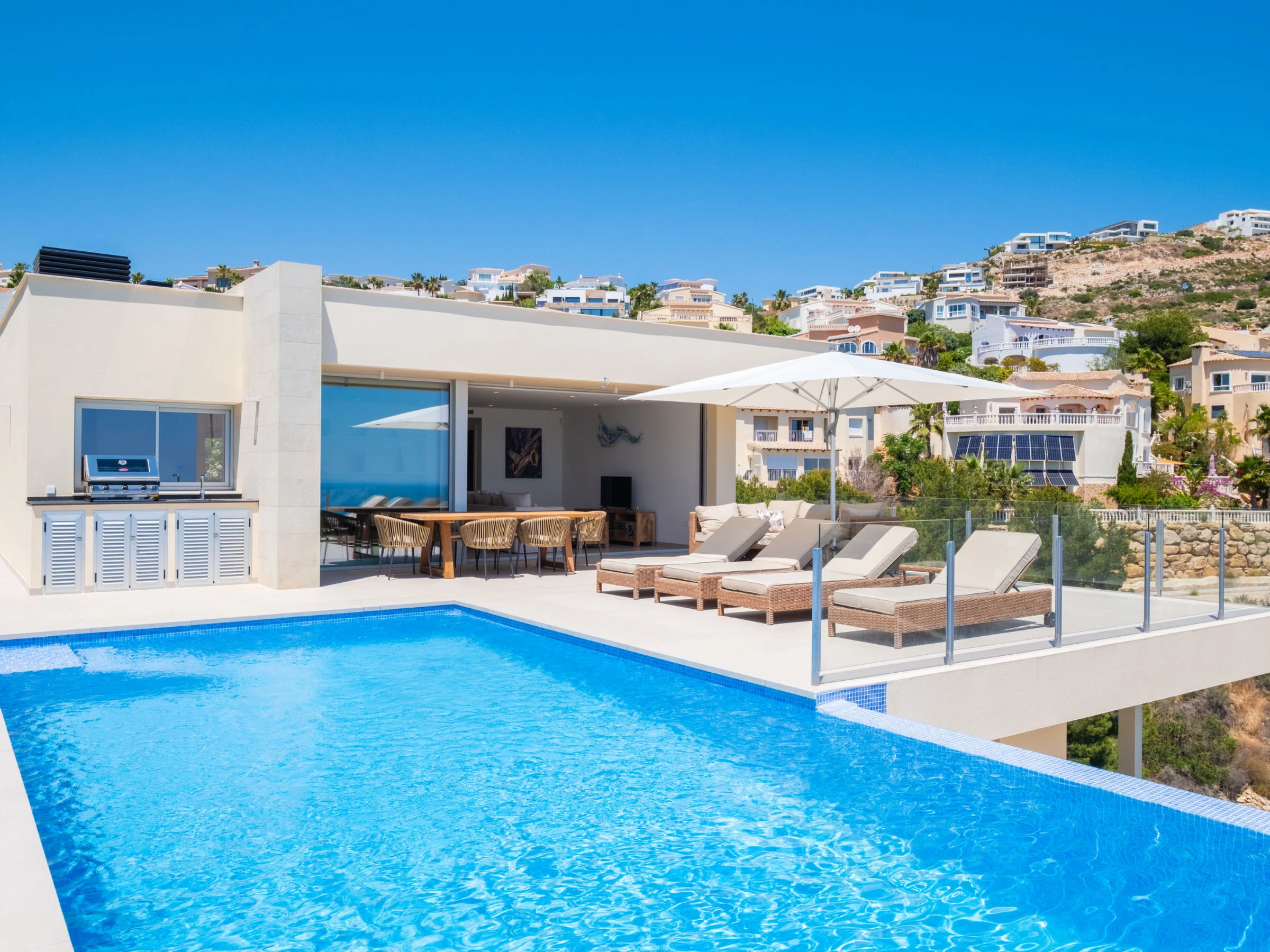 Cumbre del Sol: Very modern, beautiful villa "Iris", 2 storeys, built in 2025. 6 km from the centre of Moraira, in a quiet, sunny position residential area (villas), traffic calmed area, 2 km from the sea, 2 km from the beach. Private: property 826 m2 (fenced), swimming pool (8 x 4 m, seasonal availability: [hidden] - [hidden] with internal staircase. Outdoor shower, terrace, barbecue, parking at the house. Shop 3 km, grocery 3 km, supermarket 3 km, restaurant 4 km, bus stop 3 km, sandy beach "Playa L'Ampolla" 7 km, rocky beach "Cala del Moraig" 2 km. Sports harbour 7 km, marina 7 km, golf course (12 hole) 10 km. Nearby attractions: Aqualandia, Mundomar, Terra Mítica, Terra Natura, Benidorm Palace (Benidorm), Les Fonts de l'Algar, Castillo de Guadalest. The owner does not accept any youth groups.
