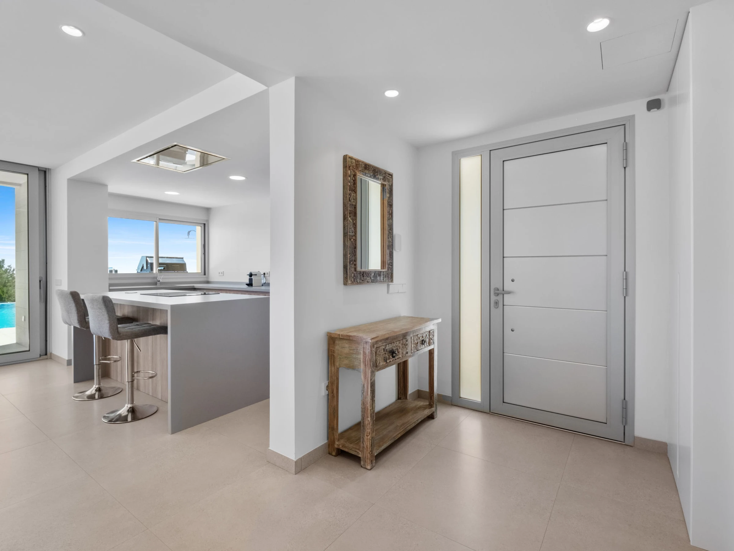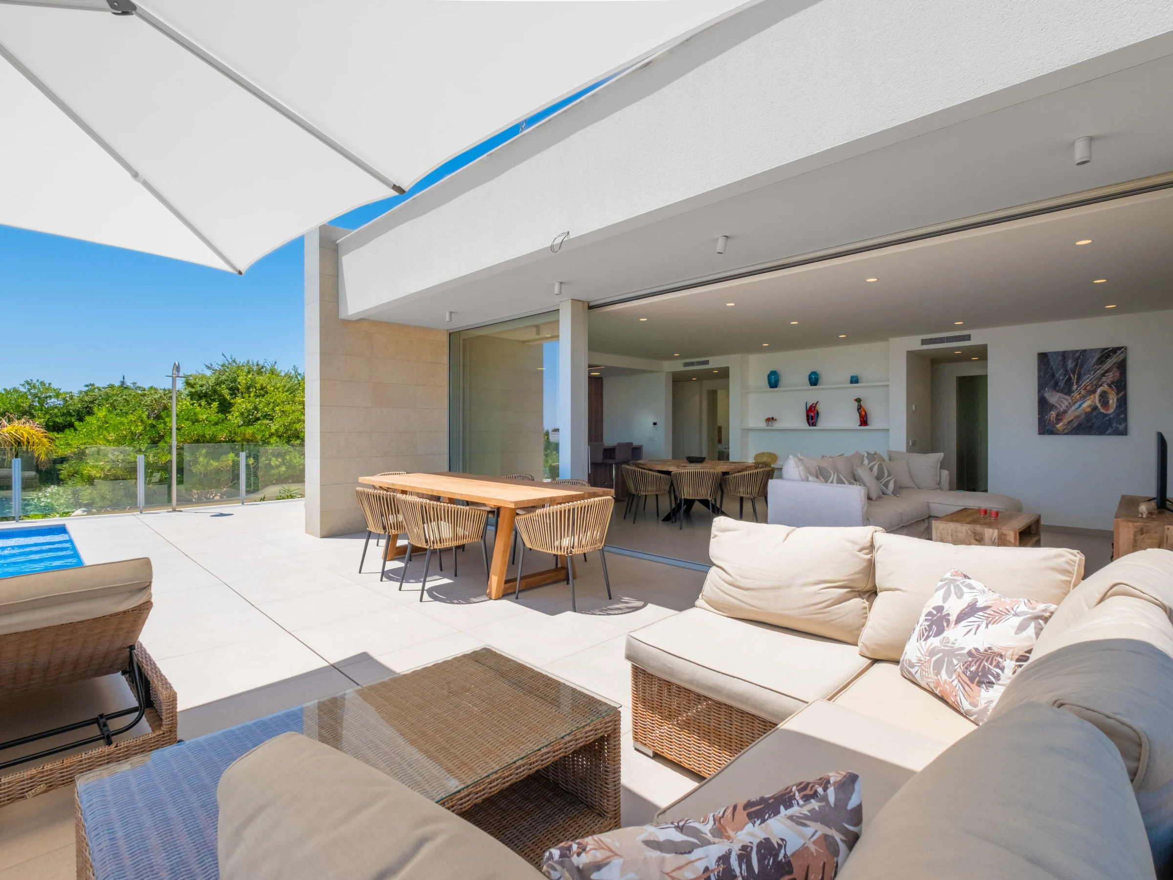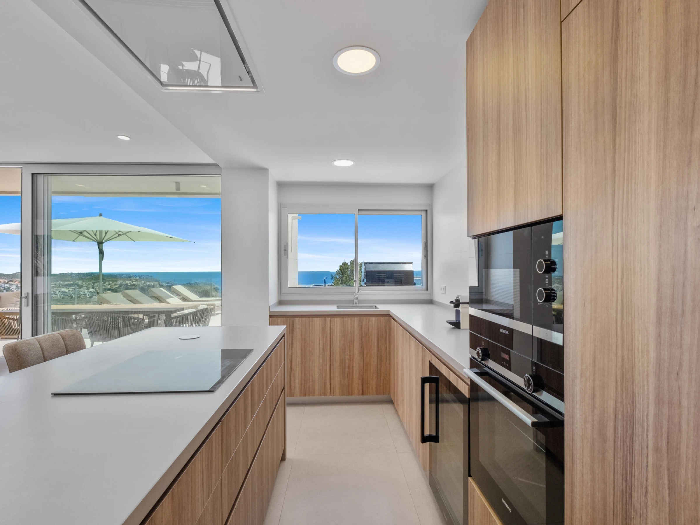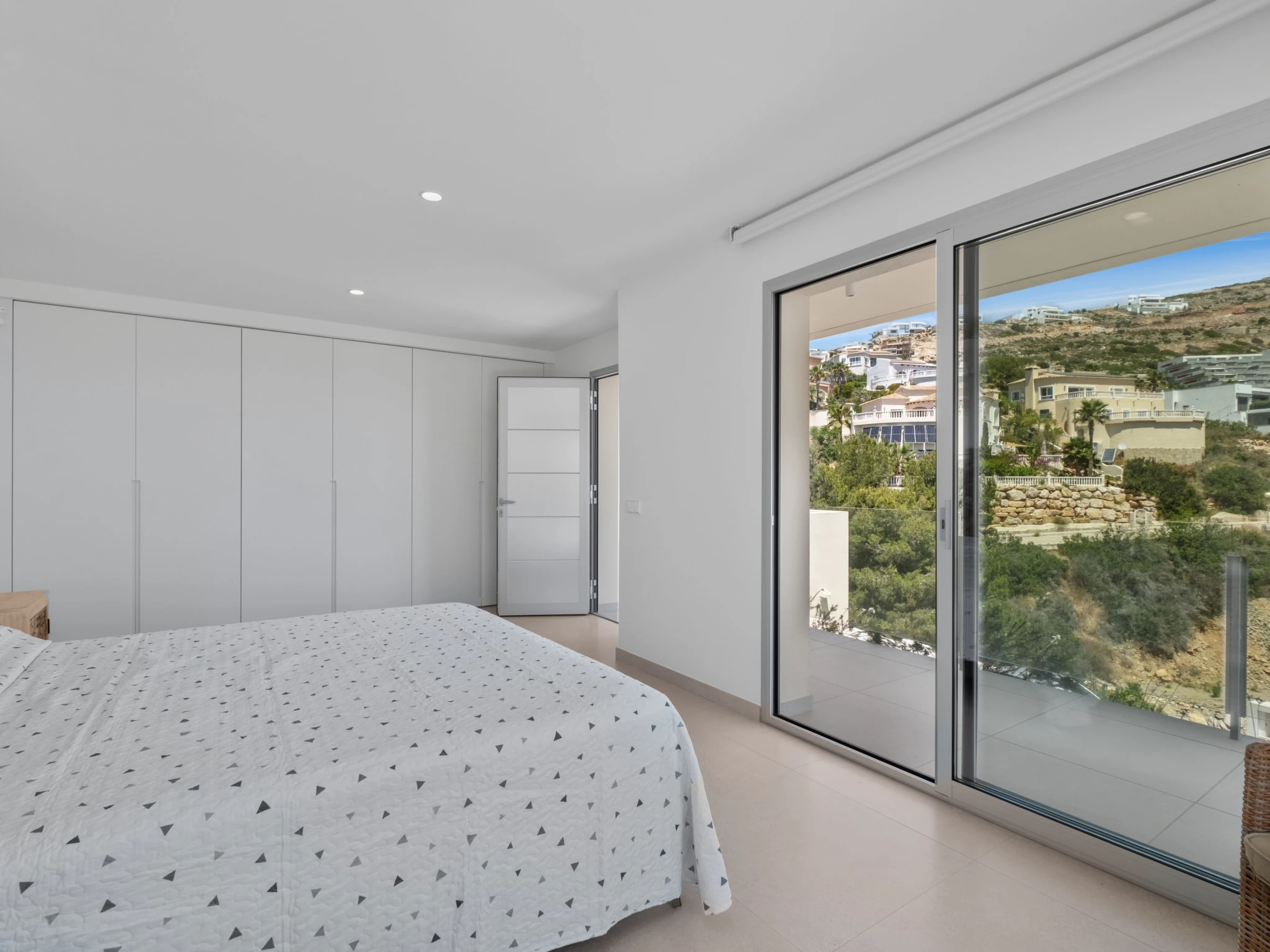 Cumbre del Sol: Very modern, beautiful villa "Iris", 2 storeys, built in 2025. 6 km from the centre of Moraira, in a quiet, sunny position residential area (villas), traffic calmed area, 2 km from the sea, 2 km from the beach. Private: property 826 m2 (fenced), swimming pool (8 x 4 m, seasonal availability: [hidden] - [hidden] with internal staircase. Outdoor shower, terrace, barbecue, parking at the house. Shop 3 km, grocery 3 km, supermarket 3 km, restaurant 4 km, bus stop 3 km, sandy beach "Playa L'Ampolla" 7 km, rocky beach "Cala del Moraig" 2 km. Sports harbour 7 km, marina 7 km, golf course (12 hole) 10 km. Nearby attractions: Aqualandia, Mundomar, Terra Mítica, Terra Natura, Benidorm Palace (Benidorm), Les Fonts de l'Algar, Castillo de Guadalest. The owner does not accept any youth groups.