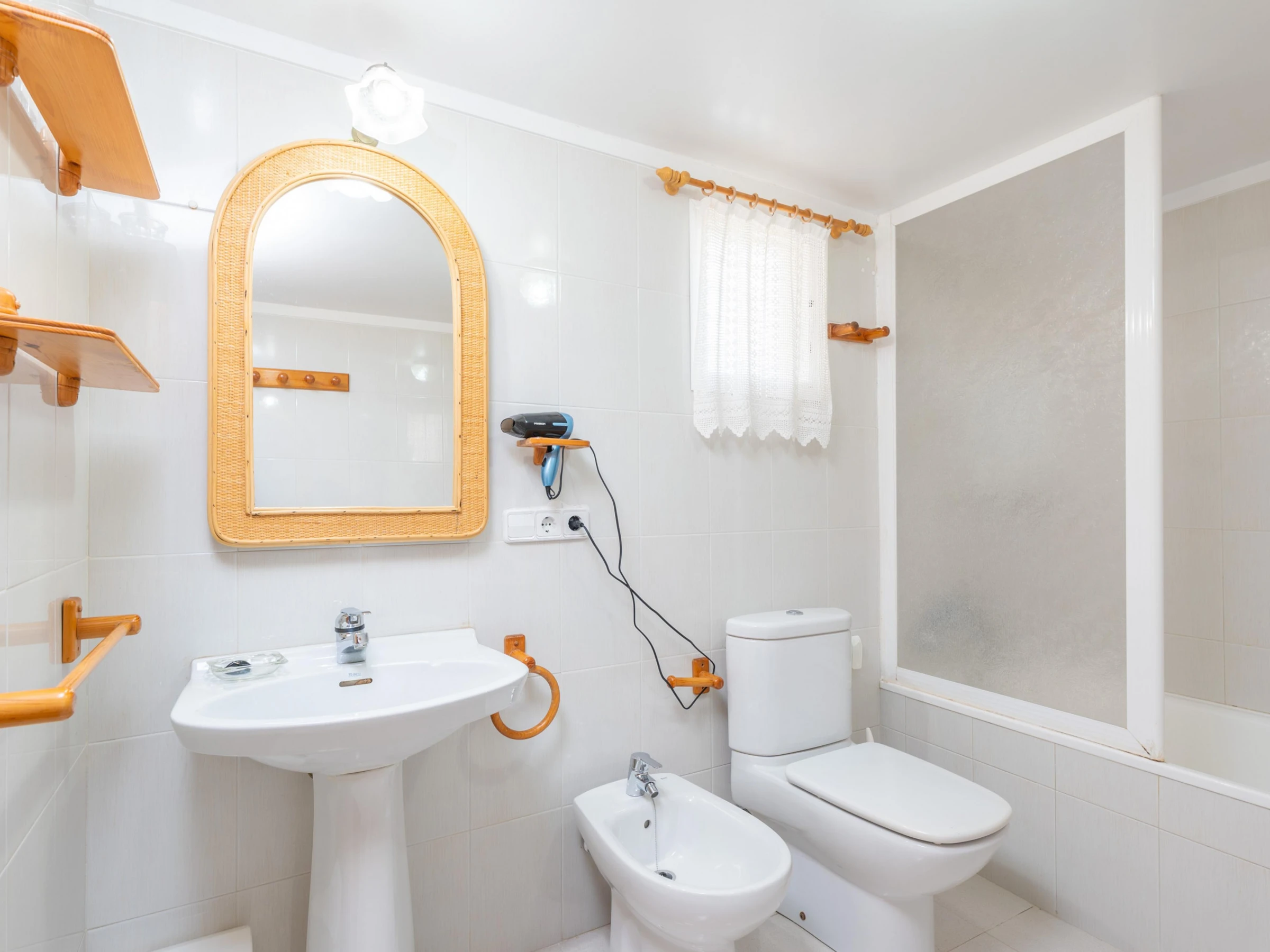 On the ground floor, there is a beautiful living-dining room, which is very comfortable to relax while watching satellite TV on the sofas and armchairs; a large traditional kitchen with ceramic hob; a bathroom with shower, a toilet and two bedrooms, one with a double bed and the other with two single beds. At the top of the stairs, you will find a third bedroom with two single beds and access to a terrace, and a bathroom with bathtub. The room is equipped with AC. All bedrooms have a wardrobe, a place for a cot and a high chair, and a fan. There is a laundry room with ironing board, iron and washing machine.