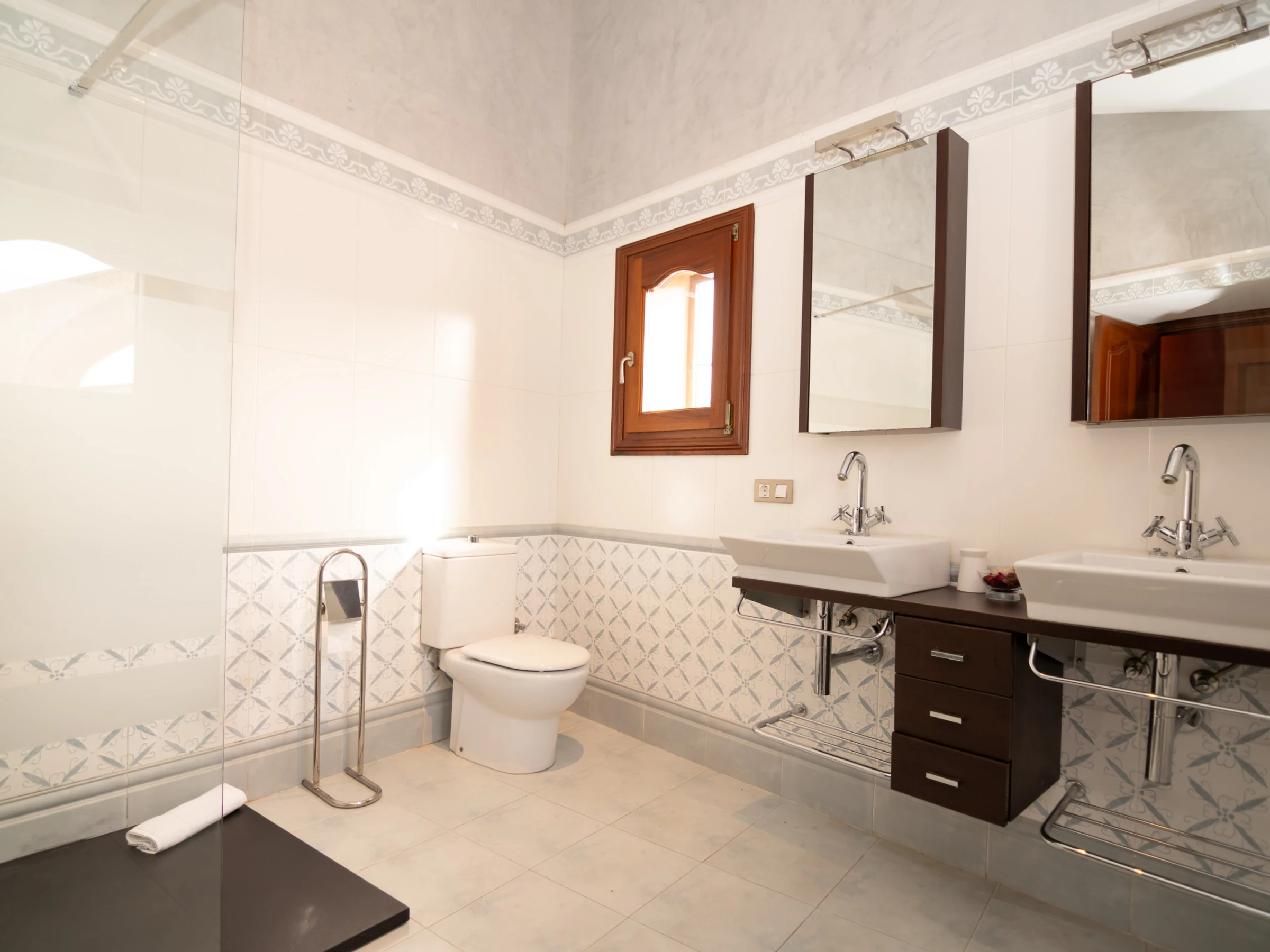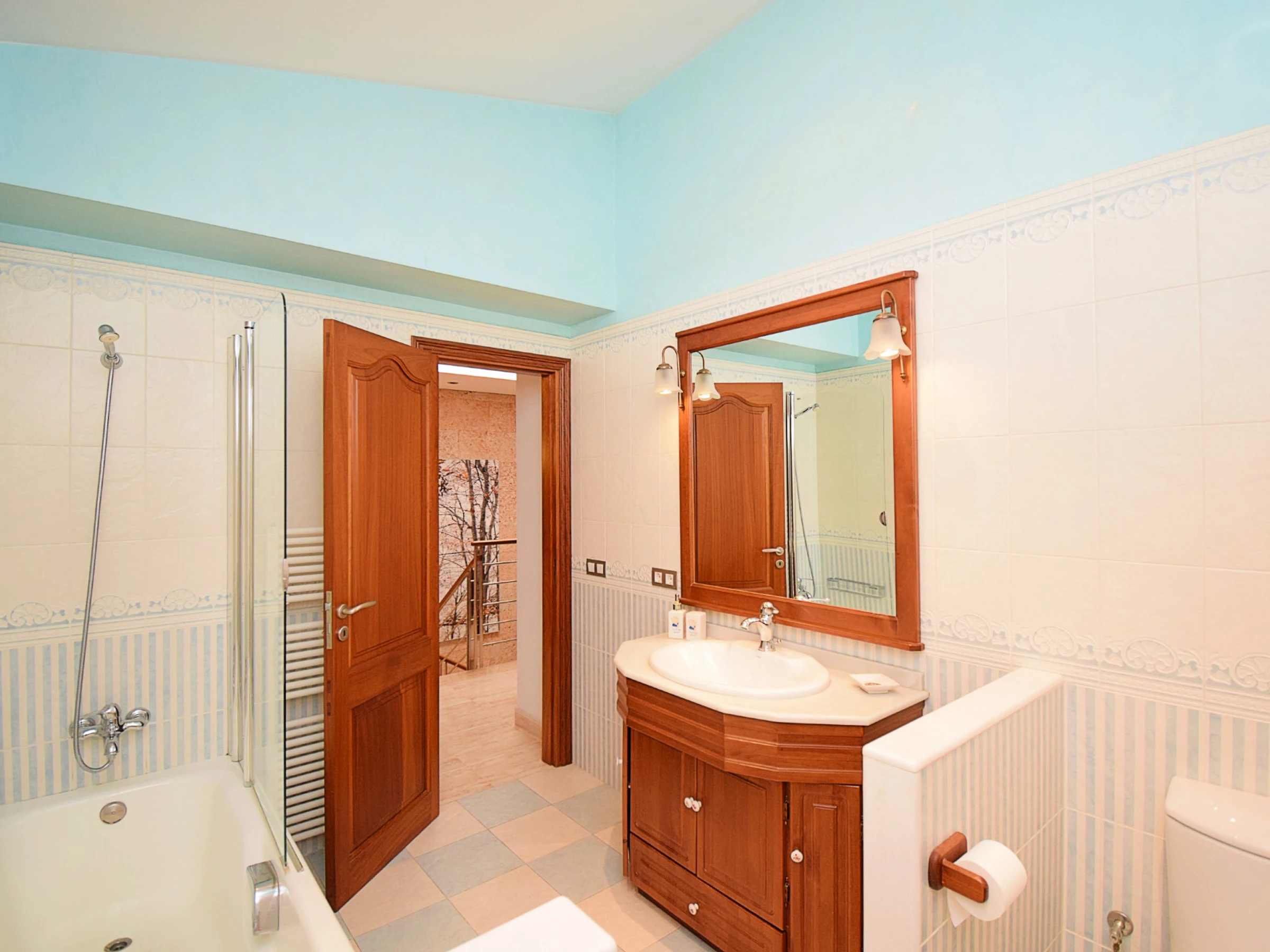 On the first floor are the bedrooms: two with double bed and one with two single beds, and two bathrooms with bathtub.