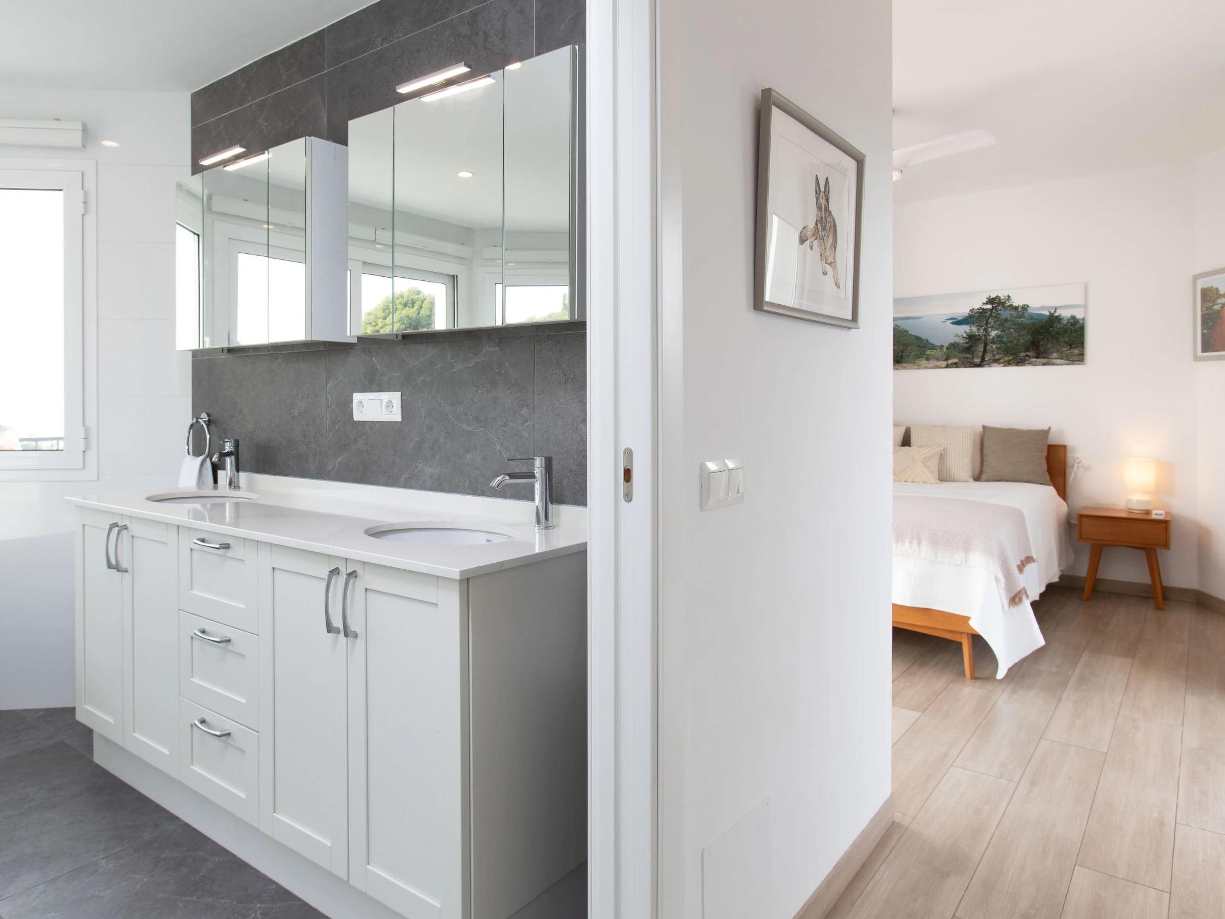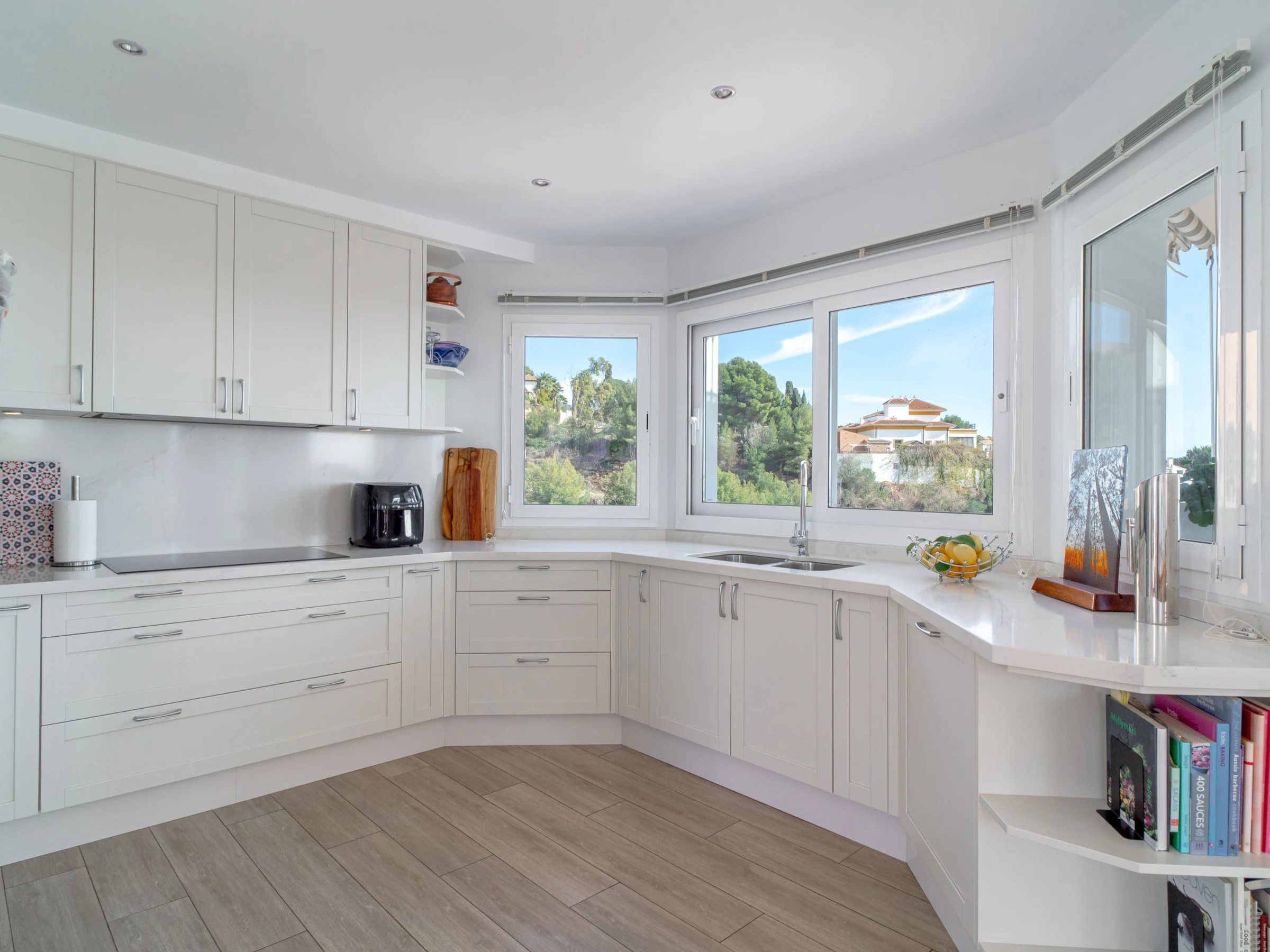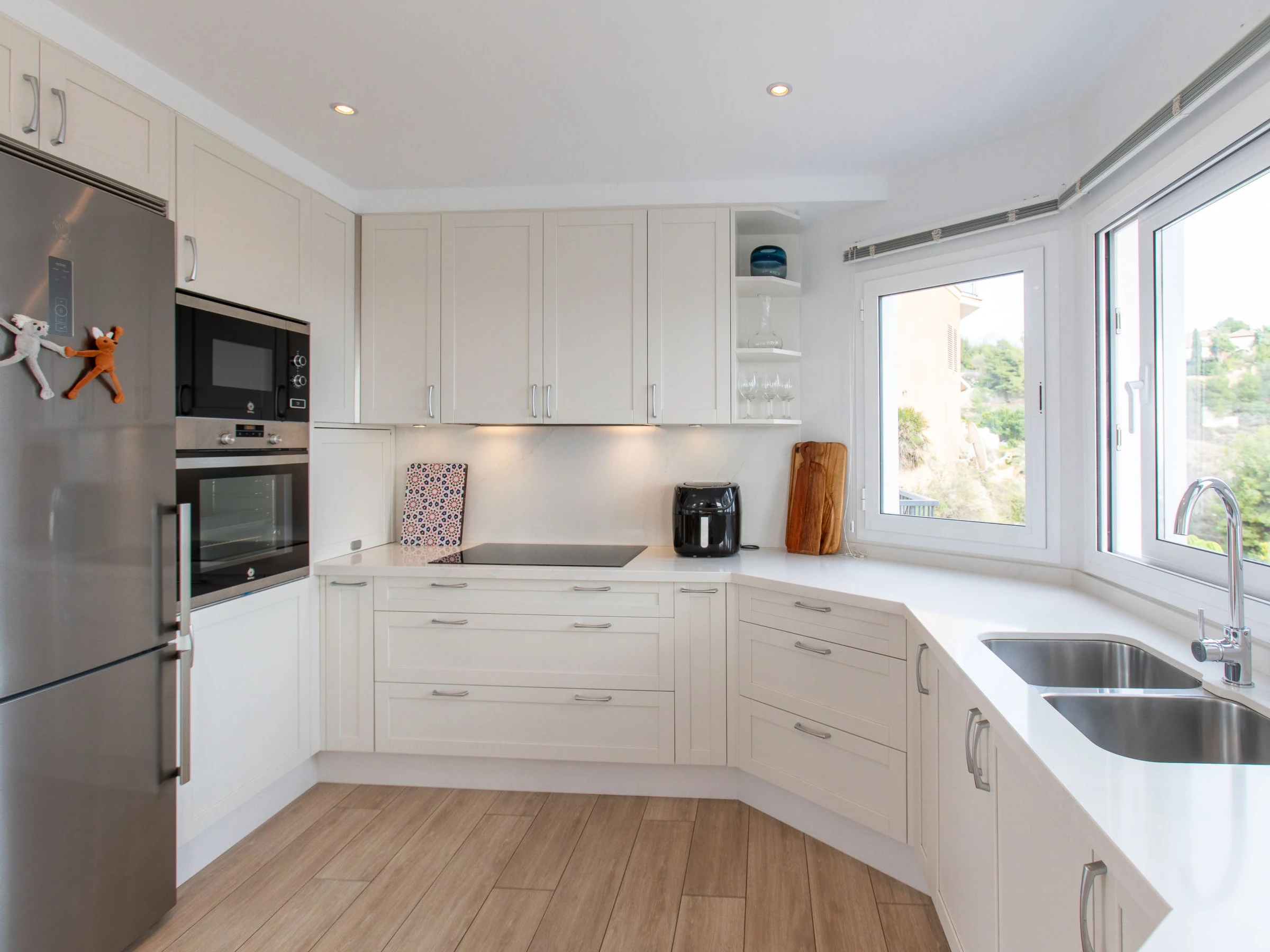 "Kinkuna", 6-room villa 240 m2, south facing position. Spacious and bright, comfortable and modern furnishings: living/dining room with dining table, TV, international TV channels, wood-burning stove and air conditioning. Exit to the terrace, to the swimming pool, south facing position and east facing position. 1 room with 1 french bed (160 cm, length 200 cm), shower/WC and air conditioning. Exit to the balcony. Open kitchen (oven, dishwasher, 6 ceramic glass hob hotplates, toaster, kettle, microwave, freezer, electric coffee machine, Capsules for coffee machine (Nespresso extra) extra). On the lower ground floor: 1 large room with 1 sofabed (140 cm, length 190 cm), 1 french bed (180 cm, length 200 cm), shower/WC and air conditioning. Lounge with TV and international TV channels (flat screen), air conditioning. Upper floor: 1 room with 1 french bed (180 cm, length 200 cm), bath/shower/WC, air conditioning and fan. Exit to the balcony, to the terrace. 1 room with 1 french bed (160 cm, length 200 cm), shower/WC and air conditioning. Exit to the balcony, to the patio. 3 large terraces. Terrace furniture, barbecue, deck chairs. Panoramic view of the sea, the mountains, the swimming pool and the resort. Facilities: iron, mosquito net, children's high chair, baby cot, hair dryer. Internet (WiFi, free). Scandinavian style interior decoration and wood effect tiled floor, Games room with standard size pool table. [hidden] // Reg. Nr.: ESFCTU0000290130006641910000000000000000[hidden]9