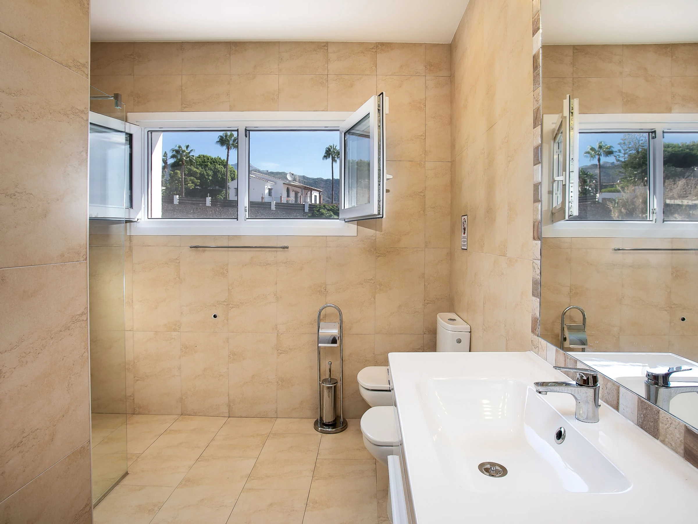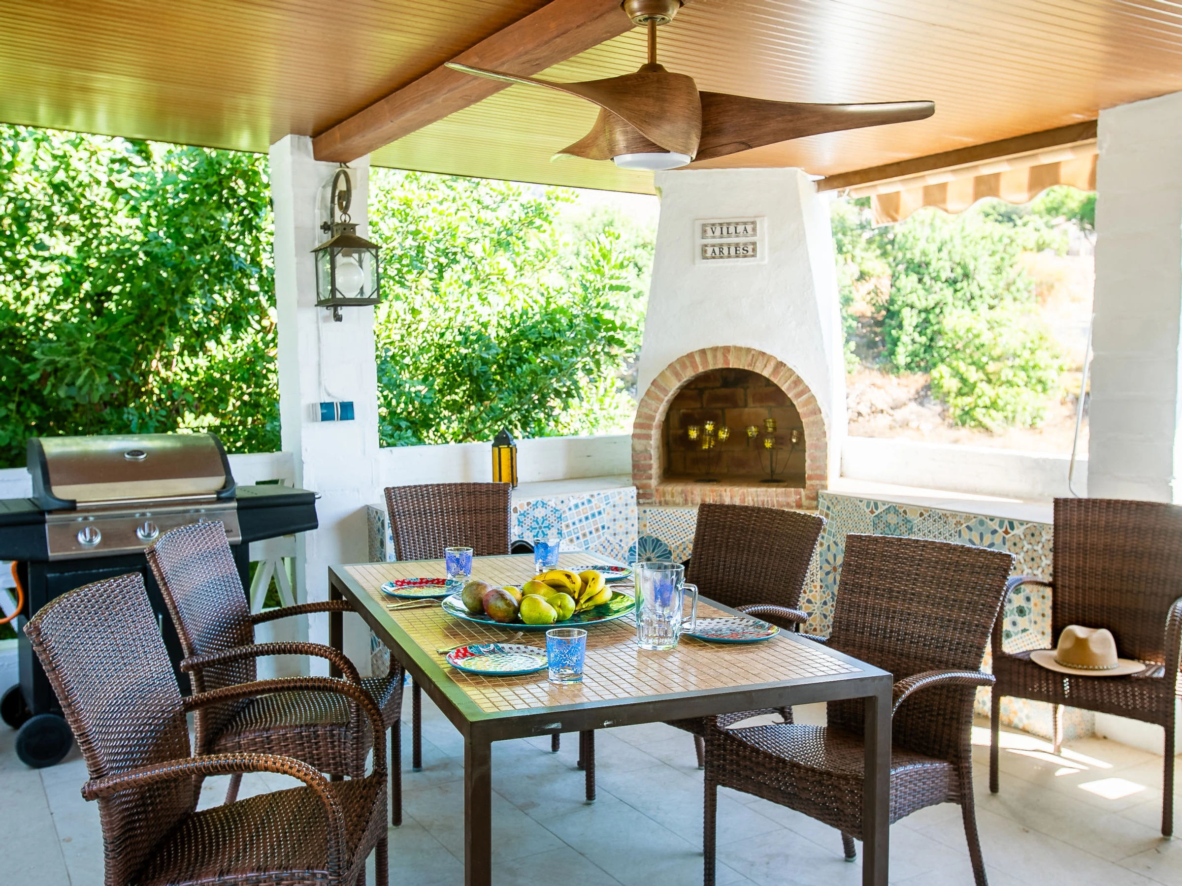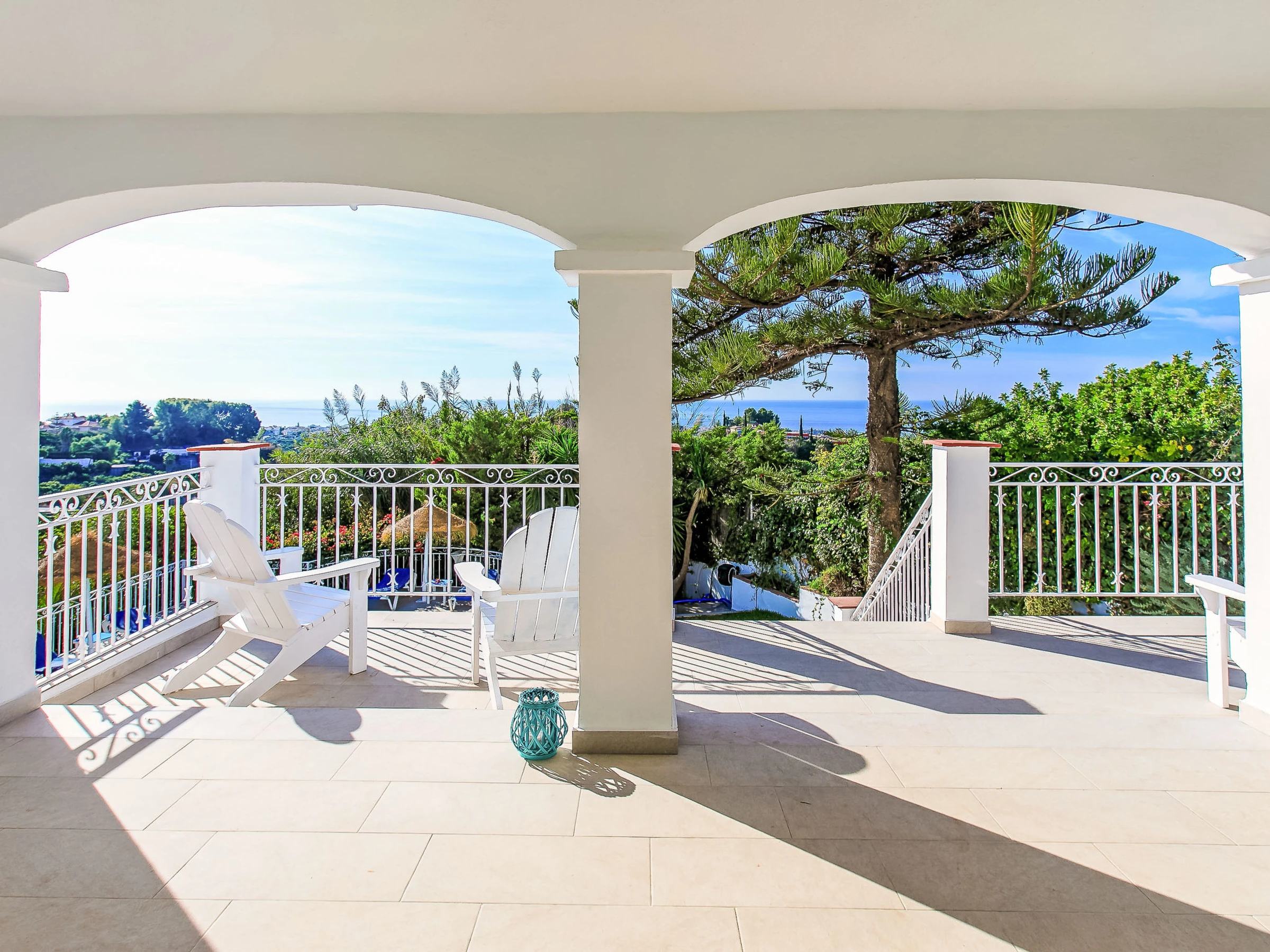 3 km from Nerja: There are 2 cameras oriented towards the outside entrance for your safety and he safety of your vehicles. Large, beautiful, comfortable villa "Aries", surrounded by trees. 3 km from the centre of Nerja, residential area (villas), 3 km from the sea, south facing position. Private: large, well-kept terraced garden with wildlife garden and trees, natural garden, lawn for sunbathing, swimming pool angular (10 x 5 m, depth 100 - 175 cm, seasonal availability: [hidden] - [hidden] Outdoor shower, parking (for 2 cars). Supermarket 500 m, shopping centre 19 km, restaurant, bar, café, pub garden 150 m, bus stop 100 m. Sports harbour 17 km, marina 17 km, golf course (18 hole) 24 km, tennis 2 km. Nearby attractions: Frigiliana, Castillo de Almuñecar, Acantilados de Maro, Museo de Nerja, Museo de Miel de Caña, Cuevas de Nerja. Well-known ski regions can easily be reached: Sierra Nevada. Hiking paths: Sierra Tejeda, Sierra Almijara, Las Alpujarras. Please note: car recommended. The owner does not accept any youth groups. Loading and unloading of baggage is possible at the holiday house. Motorway close by 15 km from the property.