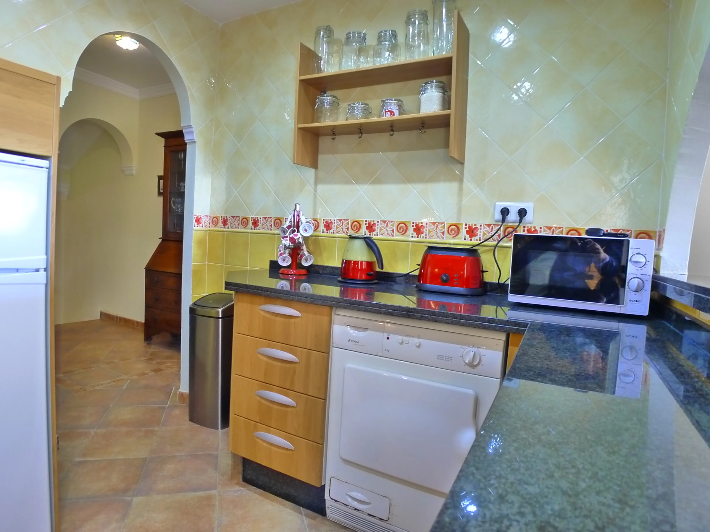 The fitted kitchen is well equipped with a full oven, hob, microwave, fridge/freezer, washing machine.
