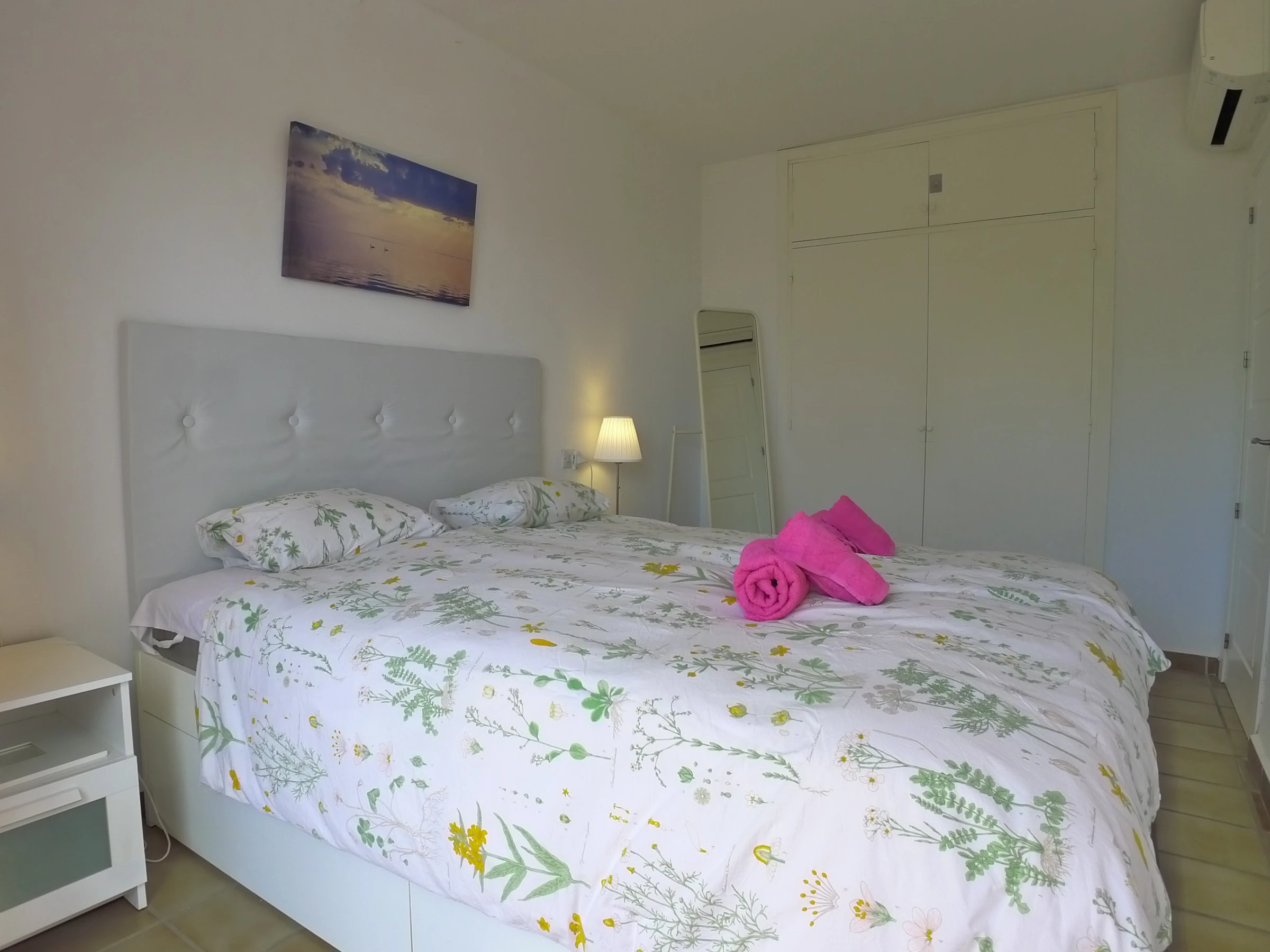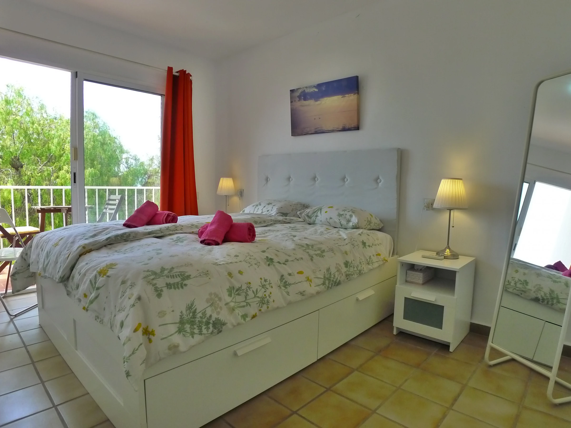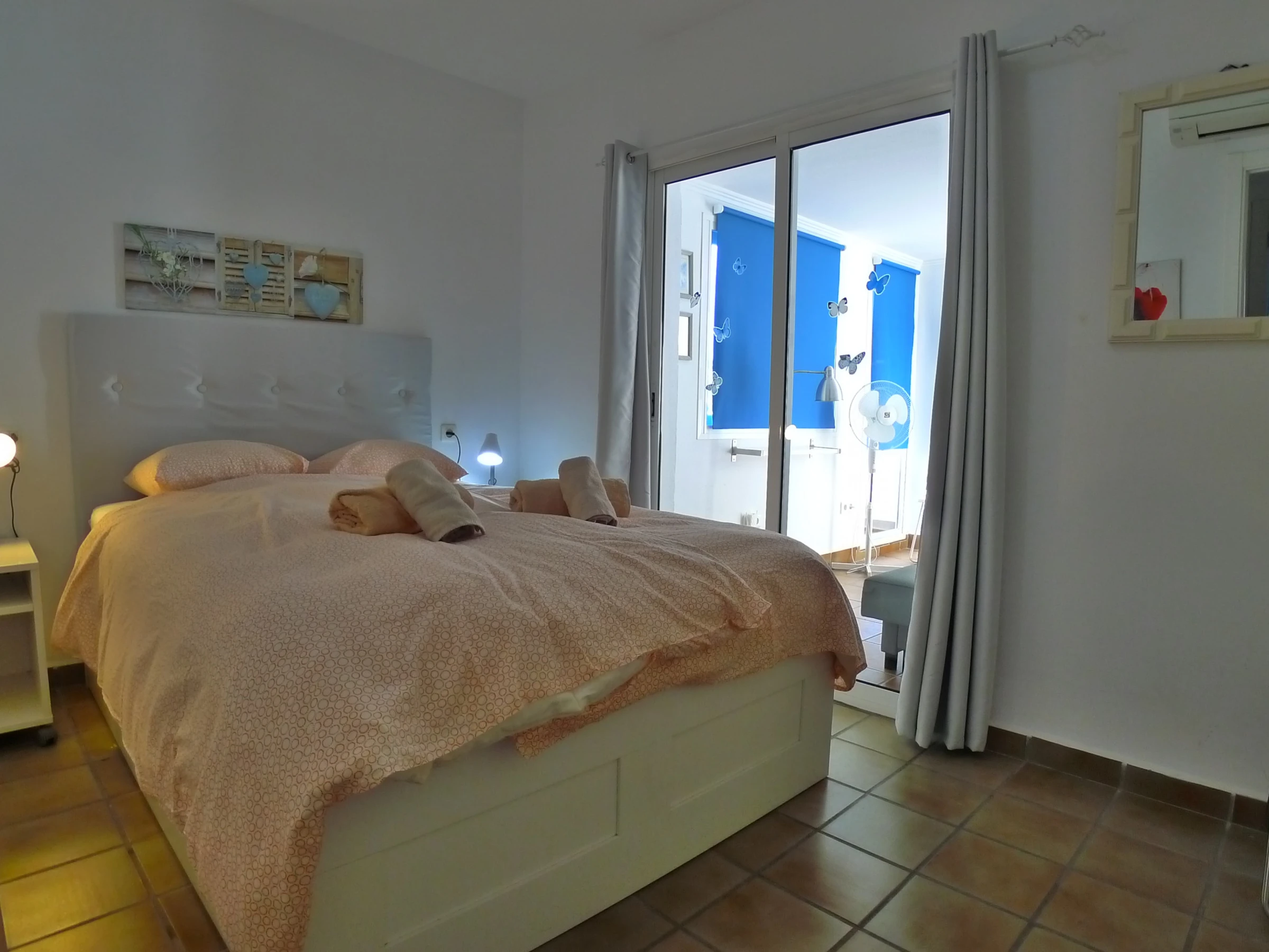 On the upper level, we have the master bedroom with a double bed & fitted wardrobes. also a private South facing balcony terrace.