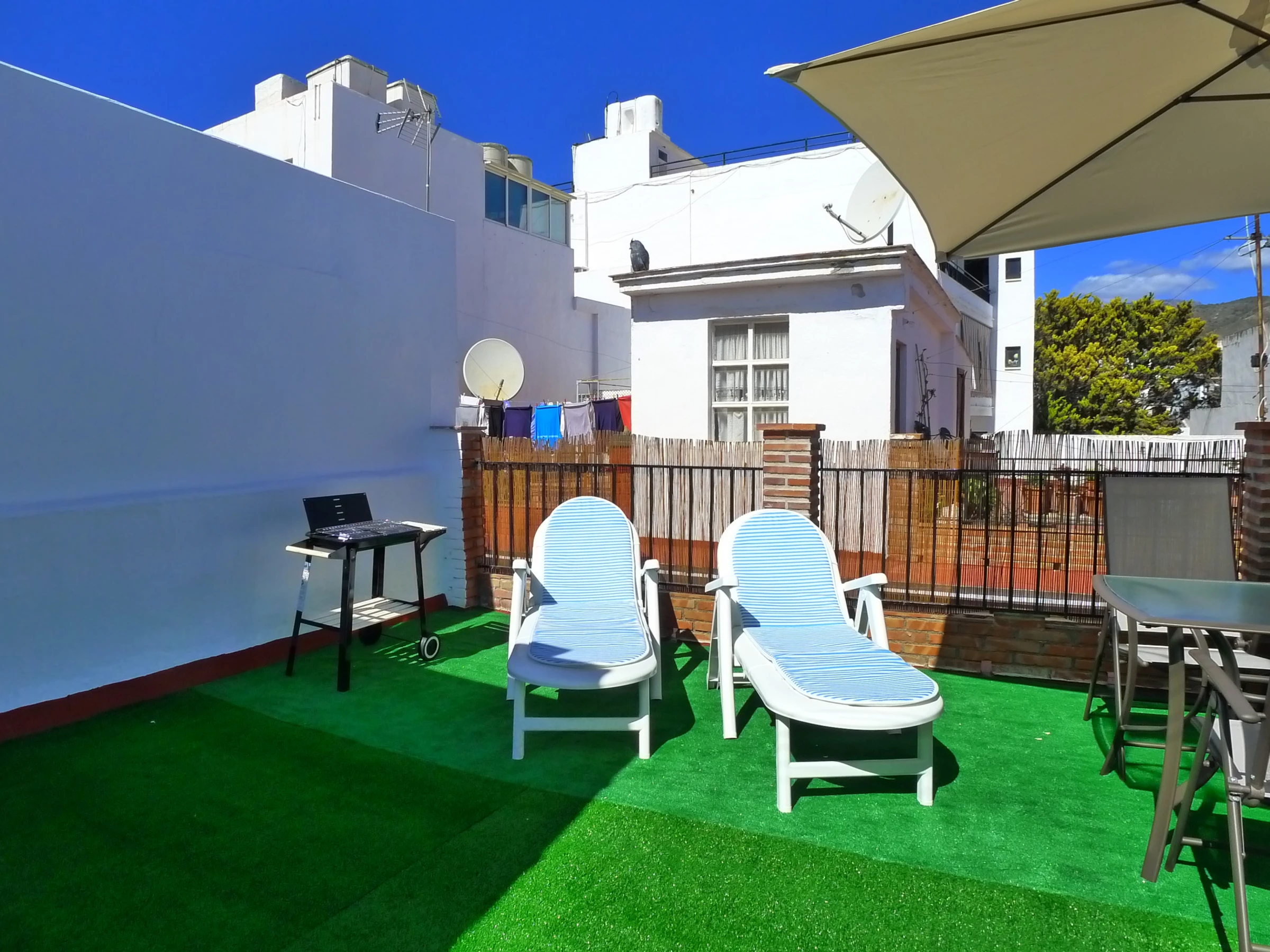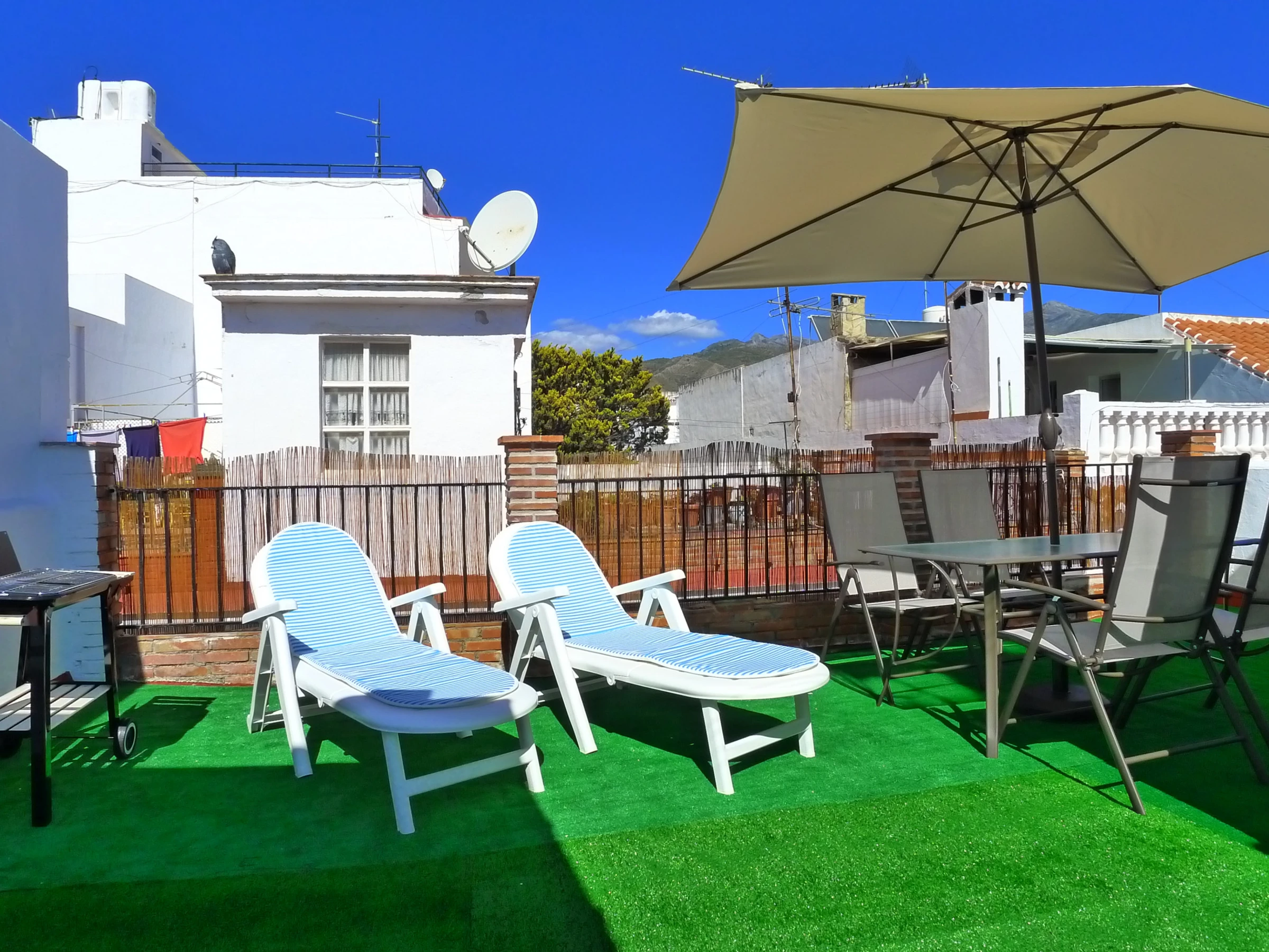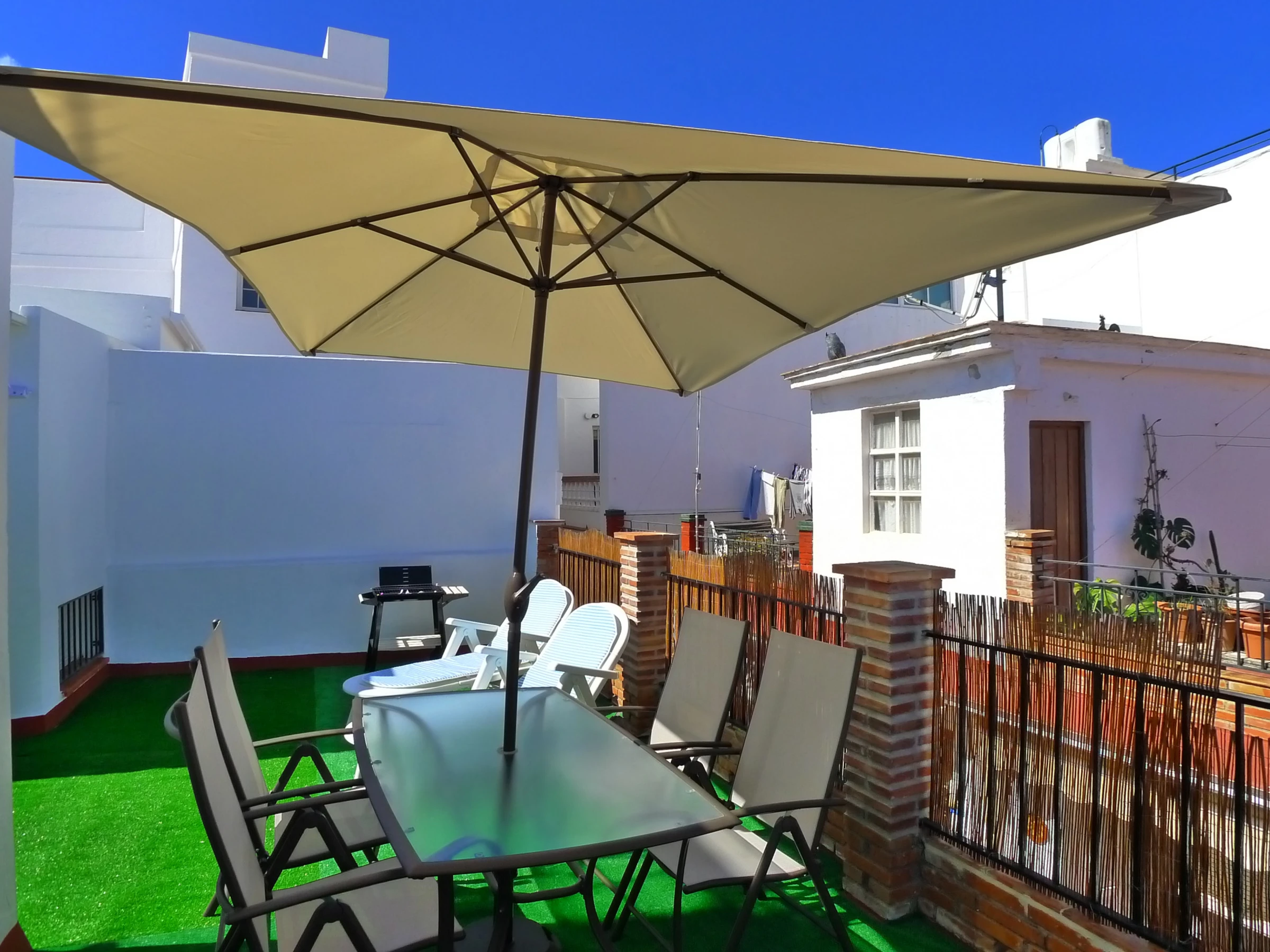 The roof terrace access is via internal stairs & is furnished with terrace dining table, chairs & parasol. Sunbeds & a BBQ are also provided. The utility room with washing machine, is also located on the roof terrace.