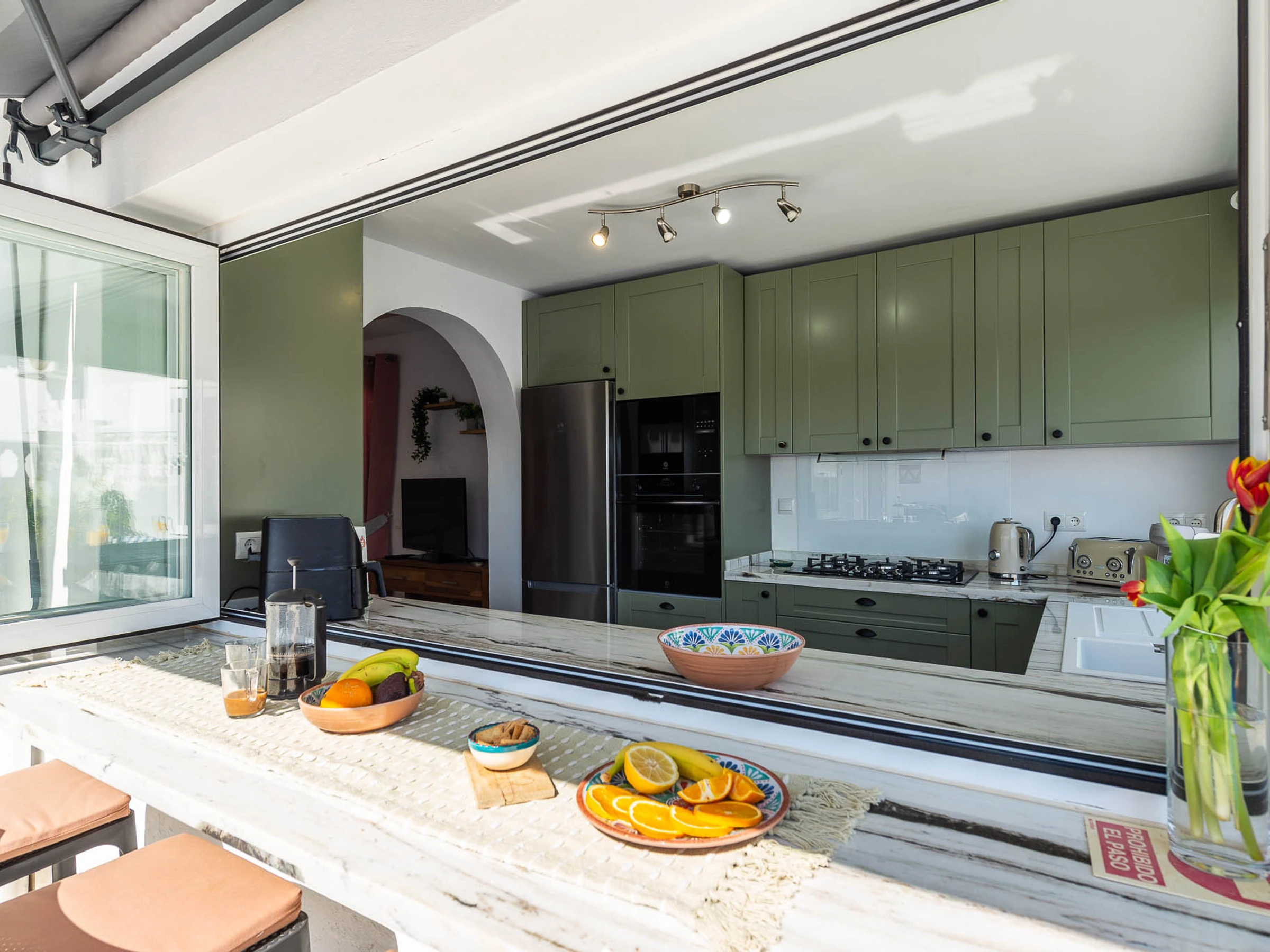 Folding windows that open towards the garden/pool area with external breakfast bars.