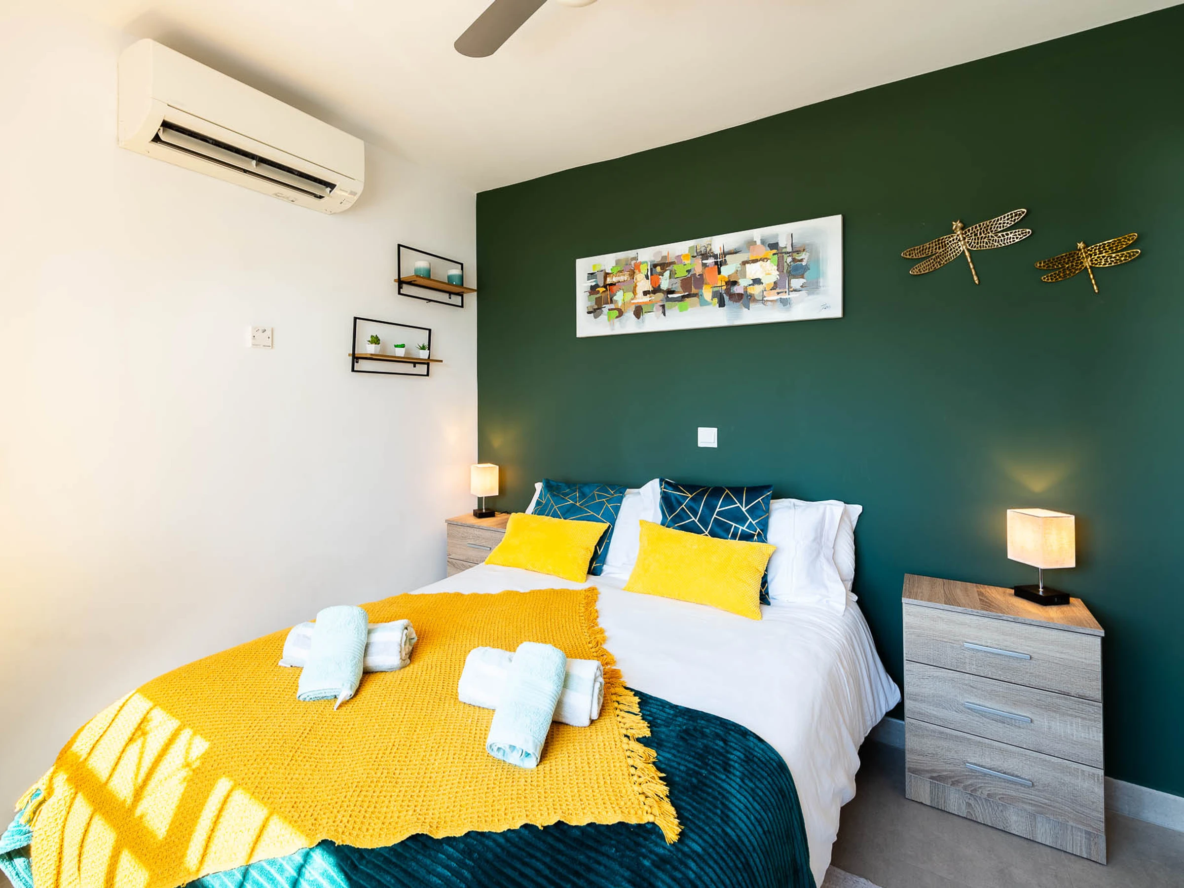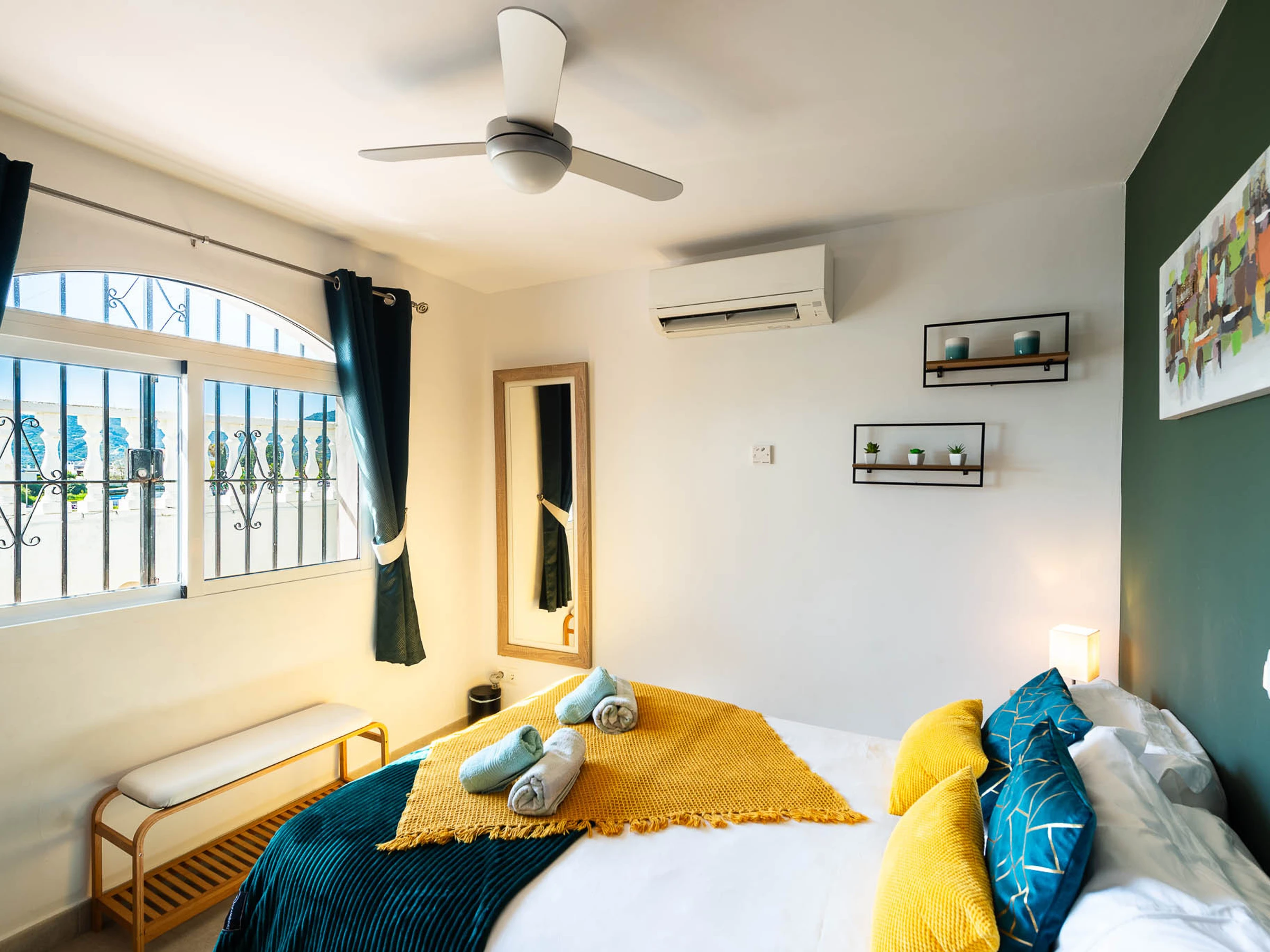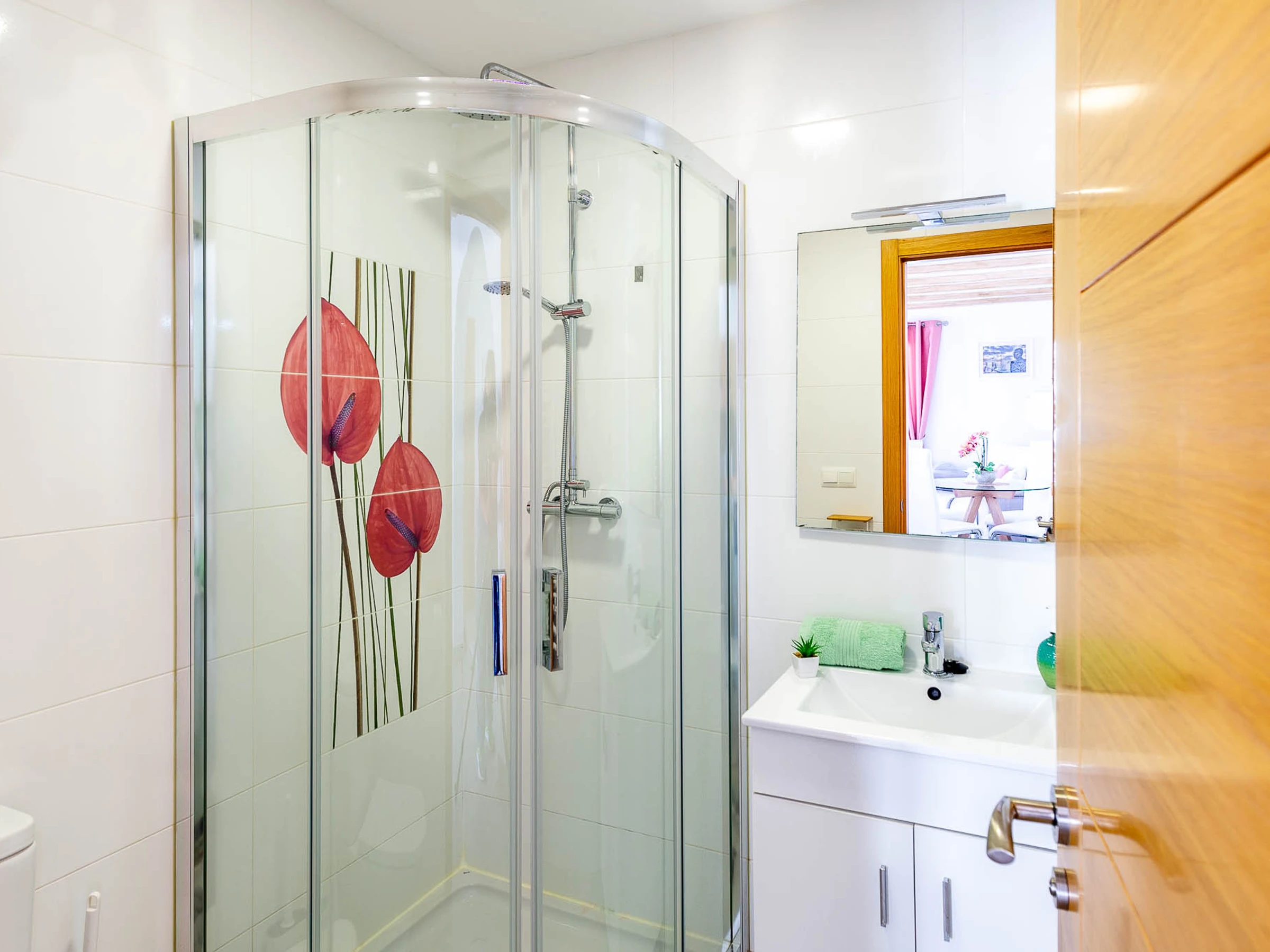 From the living area, you can access the main bedroom (King size bed) and the en-suite bathroom with a heated towel rack.